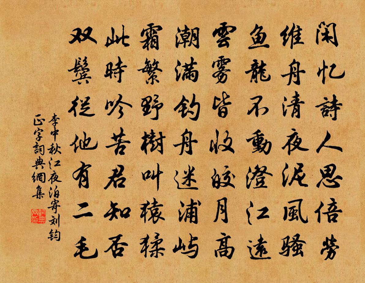 詩詞名句歷史字典書法欣賞書法字典國語詞典說文解字康熙字典古漢語字典標 題 作 者 詩 句 秋江夜泊寄劉鈞正字作者:李中 朝代:唐代秋江夜泊寄劉鈞正字原文閒憶詩人思倍勞,維舟清夜泥風騷。魚龍不動澄江遠,雲霧皆收皎月高。潮滿釣舟迷浦嶼,霜繁野樹叫猿猱。此時吟苦君知否,雙鬢從他有二毛。詩詞問答問:秋江夜泊寄劉鈞正字的作者是誰?答:李中問:秋江夜泊寄劉鈞正字寫於哪個朝代?答:唐代問:秋江夜泊寄劉鈞正字是什麼體裁?答:七律李中秋江夜泊寄劉鈞正字書法欣賞秋江夜泊寄劉鈞正字書法作品注釋全唐詩:卷748-13詩詞推薦將樂縣胡仲弓〔宋代〕石徑盤千折,林楓大十圍。山如昌化到,水似弋陽溪。樓閣層層畫,田園種種宜。惜非鄉國遠,有意卜幽樓。喜雪六首陳造〔宋代〕淮春之樓高突兀,憑欄小耐寒如割。平湖穹山兩西子,愛此鮮妝巧塗抹。回首斜陽照屋樑,玉際坤輿尚摧壓。今宵偈頌七首釋思岳〔宋代〕世尊不說一個字,大藏小藏從此出。達磨九年面壁來,得皮得髓分優劣。題老學道院馬廷鸞〔宋代〕白日臨晨老可娛,平生有味太玄{左爻右守}。莫將華皓嗤童習,更采玄文扁此廬。除夕釋善珍〔宋代〕七十明朝是,年將衰並來。頑皮禁冷暖,老氣壓凶災。鐵硯穿何益,金丸跳不回。君兄愛伶利,與汝換痴獃。雜詩李復〔宋代〕翩翩雲間鳥,翠羽光葳蕤。結巢占遠林,意與深靜期。盲飈忽號怒,萬木無停枝。欹搖不容息,簸蕩孤巢危。遐睇饒守陳粹中有詩見留次韻為謝王之望〔宋代〕相逢一笑又相離,腸斷登臨送別時。久占都亭慚重客,秋風回首片帆遲。賀喬丞相厲寺正〔宋代〕喬年國同永,壽星秋見丙。社稷資夾扶,乾坤賴重整。送饒州張使君朱慶餘〔唐代〕白頭為郡清秋別,山水南行豈覺賒。楚老只應思入境,吳兒從此去移家。館依高嶺分樟葉,路出重江見葦花。務退頌古三十一首釋原妙〔宋代〕銀蟾出海照無私,處處分明是阿誰。見面不須重問訊,從教日炙與風吹。華山題王母祠李商隱〔唐代〕蓮華峰下鎖雕梁,此去瑤池地共長。好為 * 到東海,勸栽黃竹莫栽桑。點絳唇劉秉忠〔元代〕十載風霜,玉關紫塞都游遍。驛途方遠。夜雨留孤館。燈火青熒,莫把吳鉤看。歌聲軟。酒斟宜淺。三盞清愁散。挽夢錫機宜寺簿張元乾〔宋代〕零落梁溪客,何堪鄭子悲。閉門專學易,擁鼻愛喔詩。臭味方投合,行藏罕遇知。他年鄉飲酒,揚觶相威儀。【雙調】壽陽曲_胡來得賽,佚名〔元代〕胡來得賽,熱莽得極,明明的抱著虎睡。惱翻小姐撾了麵皮,見丈人來怎生迴避? 全無思娘意,卻有愛女心,題汗青軒崔敦禮〔宋代〕地禁官清靜不嘩,日長詩試小團茶。一生只用如椽筆,細為君王紀正邪。木蘭花慢周權〔元代〕好山晴更好,靄空翠,擁樓西。正雨沐秋清,晨暾照射,雲氣初開。山外飛鴉數點,看玉虹、斜繞碧螺堆。幾簇人晚立普明寺門,時已過立春,去除夕三日爾,楊萬里〔宋代〕蕭蕭淅淅荻花風,慘慘澹澹雲物容。欲雪不雪關得儂,得歸未歸一莞中。年華縱留春巳換,半生作客今何恨。夜來晨起邵雍〔宋代〕山高水復深,無葉奈而今。地盡一時事,天開萬古心。輕煙籠曉閣,微雨散青林。此景雖平淡,人間何處尋。八礪三首鄭思肖〔宋代〕憤氣填膺奈若何,千生萬死不消磨。夷齊道喪綱常壞,湯武兵興叛逆多。天外游心窮碧落,風前注目寄蒼波。此時次韻子瞻行至奉新見寄蘇轍〔宋代〕四年候公書,長視飛鴻背。十日留公談,欲作白蓮會。〈筠州無可語者,往還但一二僧耳。〉匏瓜一遭系,賣酒長名句推薦治國常富,而亂國常貧。管仲《管子·治國》 回頭流水小橋東,煙掃畫樓出。雷應春《好事近·梅片作團飛》 美功不伐,貴位不善佚名《孔子家語·弟子行》 不成拋擲,夢裡終相覓。王國維《點絳唇·屏卻相思》 拋家傍路,思量卻是,無情有思。蘇軾《水龍吟·次韻章質夫楊花詞》 積雪覆平皋,飢鷹捉寒兔。孟浩然《南歸阻雪》 類同相召,氣同則合,聲比則應。呂不韋《呂氏春秋·覽·恃君覽》 荒村帶返照,落葉亂紛紛。劉長卿《碧澗別墅喜皇甫侍御相訪》 至若救渴,飲之以漿;蠲憂忿,飲之以酒;盪昏寐,飲之以茶。陸羽《茶經·六之飲》 子胥既棄吳江上,屈原終投湘水濱。李白《行路難三首》