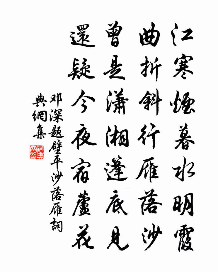 詩詞名句歷史字典書法欣賞書法字典國語詞典說文解字康熙字典古漢語字典標 題 作 者 詩 句 題壁平沙落雁作者:鄧深 朝代:宋代題壁平沙落雁原文江寒煙暮水明霞,曲折斜行雁落沙。曾是瀟湘篷底見,還疑今夜宿蘆花。詩詞問答問:題壁平沙落雁的作者是誰?答:鄧深問:題壁平沙落雁寫於哪個朝代?答:宋代鄧深題壁平沙落雁書法欣賞題壁平沙落雁書法作品詩詞推薦偈傾一百三十三首釋法薰〔宋代〕悉達今朝出母胎,無端滿目是塵埃。山僧傾倒西湖水,索性從頭回洗回。生查子鄧肅〔宋代〕執手兩潸然,情極都無語。去馬更匆匆,一息迷回顧。孤館得村醪,一醉空離緒。酒醒卻無人,簾外三更雨。寒食雨中,同舍約游天竺,得十六絕句呈陸務楊萬里〔宋代〕三峰小石一方池,下有機泉仰面飛。坐看跳珠復拋玉,忽然一噴與檐齊。題畫九首唐寅〔明代〕萬木號風疑虎吼,亂泉驚雨挾龍飛。世疑龍虎茌馴擾,卻許山人擅指揮。八關僧房遇雨陳與義〔宋代〕脫履坐明窗,偶至晴更適。池上風忽來,斜雨滿高壁。深松含歲暮,幽鳥立晝寂。世故方未闌,焚香破今夕。宴湖南董提舉致語口號文天祥〔宋代〕西風八月楚江濱,爭看星槎會漢津。露濕紅綾旗影舊,雲連翠簜轡華新。東西杜若洲連月,先後瑞芝堂上春。回首陳武帝蚌盤孫元晏〔唐代〕金翠絲黃略不舒,蚌盤清宴意何如?豈知三閣繁華日,解為君王妙破除。詩三首孫何〔宋代〕薜荔無因掛一毫,化工鐫削亦應勞。圭形直指明河落,桂影遙分漲海濤。發地五千何足貴,去天三百未足高。軒轅王乾竹枕甚簡古客有得之者為賦二絕楊冠卿〔宋代〕榮枯已熟槐安境,妄幻敢藏鴻寶書。一節黑甜參已透,漆園胡蝶浪分疏。夏行郊外蘇泂〔宋代〕吹紅抱得綠團枝,蝴蝶飛來又卻疑。藤架野花無著莫,是人行處有香隨。次韻子由書清汶老所傳秦湘二女圖蘇軾〔宋代〕春風消冰失瑤玉,我本無身安有觸。羊生得婦如得風,握手一笑未為辱。先生室中無天游,佩環何處鳴風甌。隨魔挽薛艮齋三首甄龍友〔宋代〕驥不由窮巷,龍曾演瑞圖。衣傳袁道潔,夢接邵堯夫。四年十全未,三千行豈無。飄然何太速,愁殺奠生芻。山行愁思羅與之〔宋代〕明月印野水,暮色進旅愁。仆痡主亦疲,心口相怨尤。茅台舍劣容膝,弛擔聊小休。會當理歸策,甘彼窮山囚。寄餘溫卿王安石〔宋代〕雲散風流不自禁,天涯無路盍朋簪。空馳上國青泥信,誰和南山白石音。平日離愁寬頻眼,訖春歸思滿琴心。終回齊安春謠五絕張耒〔宋代〕赤壁磯前江急流,周郎功業莽悠悠。惆悵沙邊雨中樹,無言供作古今愁。霜寒轆轤體二首楊萬里〔宋代〕滴地酒成凍,喧天鴉訴寒。窗風經怒響,簾日漏溫痕。偶爾尋梅去,其如駐屐難。沙鷗腳不襪,故故踏水翻。見張運使郎中周麟之〔宋代〕風度顒顒白首郎,清朝趨奏久含香。東南德望龍津闊,甲乙科名雁鄧長。使節不辭驪駕遠,卿家重見戰門光。原他右威衛嘲語佚名〔宋代〕門緣御史塞,廳被校書侵。茂恭見和再用前韻奉酬喻良能〔宋代〕少陵時時醉里,子山日日愁邊。白髮新來滿鏡,故人萬一能憐。次韻答滿思復蘇軾〔宋代〕自甘茅屋老三間,豈意彤庭綴兩班。紙落雲煙供醉後,詩成珠玉看朝還。誰言載酒山無賀,記取啼烏巷有顏。但恐名句推薦萬物並育而不相害。道並行而不相悖。子思《中庸·第三十章》 傷情處,高城望斷,燈火已黃昏。秦觀《滿庭芳·山抹微雲》 空對著,山中高士晶瑩雪曹雪芹《終身誤》 明足以察秋毫之末,而不見輿薪,則王許之乎?孟子《孟子·梁惠王章句上·第八節》 今夕復何夕,共此燈燭光。杜甫《贈衛八處士》 江流天地外,山色有無中。王維《漢江臨泛 / 漢江臨眺》 知屋漏者在宇下,知政失者在草野。王充《論衡·卷二十八·書解篇》 平蕪盡處是春山,行人更在春山外。歐陽修《踏莎行·候館梅殘》 海上生明月,天涯共此時。張九齡《望月懷遠》 相馬失之瘦,相士失之貧。司馬遷《史記·滑稽列傳》