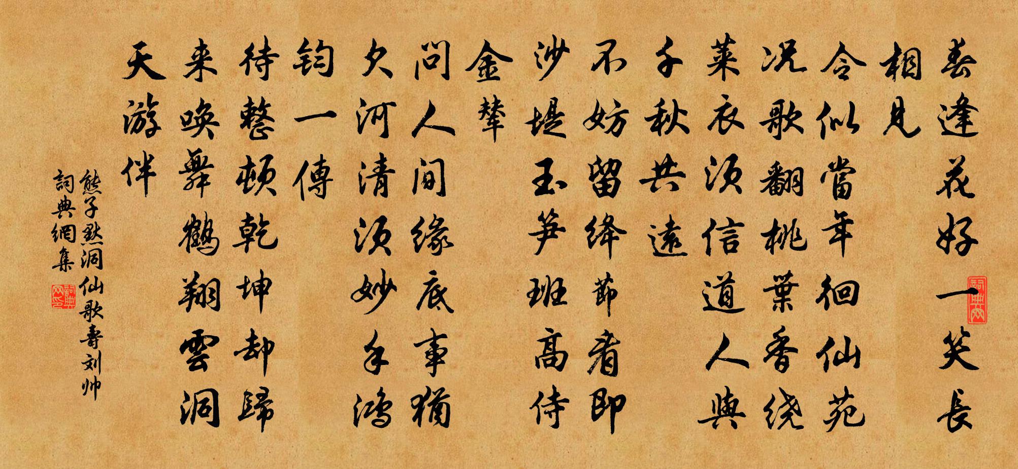 詩詞名句歷史字典書法欣賞書法字典國語詞典說文解字康熙字典古漢語字典標 題 作 者 詩 句 洞仙歌(壽劉帥)作者:熊子默 朝代:宋代洞仙歌(壽劉帥)原文春逢花好,一笑長相見。令似當年徊仙苑。況歌翻桃葉,香繞萊衣,須信道,人與千秋共遠。不妨留絳節,看即沙堤,玉筍班高侍金輦。問人間、緣底事,猶欠河清,須妙手、鴻鈞一傳。待整頓乾坤、卻歸來,喚舞鶴翔雲,洞天遊伴。詩詞問答問:洞仙歌(壽劉帥)的作者是誰?答:熊子默問:洞仙歌(壽劉帥)寫於哪個朝代?答:宋代問:洞仙歌(壽劉帥)是什麼體裁?答:詞熊子默洞仙歌(壽劉帥)書法欣賞洞仙歌(壽劉帥)書法作品詩詞推薦渭河道中 其三王冕〔元代〕月出東溟白,天垂北斗低。礪馬思秣馬,舞劍忽聞雞。諸葛猶存存,田橫不辱齊。英雄如有見,瑣稍豈能迷?四字令韓奕〔元代〕茶蘼送香。枇杷映黃。園池偷換春光。正人間晝長。鳩鳴在桑。鶯啼近窗。行人遠去他鄉。正離愁斷腸。秋日次前輩新年韻陸游〔宋代〕老人常獨處,一笑比河清。終日無來客,三年不入城。高眠聽酒滴,危坐對雲生。矯首羲皇世,吾其享大羹?洋州蔡交〔宋代〕武定新雄閫,豐寧舊奧墟。地兼秦蜀美,川會漢洋紆。翠壘環封嶺,清流躍野渠。安知下斜谷,別得上華胥。乾酒秘省再會次韻文天祥〔宋代〕蓬萊春宴聚文星,多荷君恩錫百朋。四座衣冠陪賀監,一時梁棟盛吳興。圖書光動青藜杖,人物溫如古玉升。好是晚鶯二首張耒〔宋代〕庭樹知秋雕晚枝,春鶯一去幾時歸。晚來何事枝頭見,啞鴉數聲還復飛。荊州即事藥名詩八首黃庭堅〔宋代〕雨如覆盆來,平地沒牛膝。回望無夷陵,天南星斗濕。胡氏逢慶堂詩用秉成兄韻周必大〔宋代〕柿紅萱花映階濃,泥紫芝函帶璽封。善積古稱家有慶,身強今看子其逢。壽觴莫惜斟三雅,祿養猶期饌萬鍾。樂與朝中措閭丘次杲〔宋代〕橫江一抹是平沙。沙上幾千家。得到人家盡處,依然水接天涯。危欄送目,翩翩去鷁,點點歸鴉。漁唱不知何處,和出郭晁說之〔宋代〕萬斛無多寧貯愁,不如留著寸心憂。怕聞天假漁陽騎,莫話春迷煬帝樓。出去暫能欣綠野,歸來還是夢滄洲。何人敬贊月林觀禪師陳貴謙〔宋代〕示現人間忍辱仙,單提獨弄祖師禪。生涯一缽無安處,惟有聲名萬古傳。求志宋庠〔宋代〕壯心銷盡見天機,敢惜功名與世違。拙似潘生難濟用,老於蘧瑗轉知非。多年鷄口慚爭食,自古駑筋愛舉肥。常恐自嘆三首文天祥〔宋代〕北轍更寒暑,南冠幾晦冥。家山時入夢,妻子亦關情。惆悵心如失,崎嶇命復輕。遭時命如此,薄分笑三生。漁父詞張雨〔元代〕上釣金鱗不用多。踏翻船子便高歌。猶有在,問如何。問取儂家張志桂隱紀詠傳經軒張鎡〔宋代〕香炷對清晨,微言得問津。所師非傳癖,手澤仰如新。荊南詞陳維崧〔清代〕四月荊南桑柘美。泥就蠶房,雪淨無塵滓。紅帖糊門多禁忌,家家阿婦勞纖指。笑語小姑應夜起,好事今冬,早把東窗偶書陸游〔宋代〕東窗終日靜愔愔,消盡平生幻妄心。秋氣未催群木脫,老懷先感百蟲吟。屏風疊邃思廬阜,冠子峰高憶少林。安得初冬雜詠陸游〔宋代〕書生本欲輩莘渭,蹭蹬乃去為詩人。囊中略有七千首,不負百年風月身。寄題高汝一少卿識山堂樓鑰〔宋代〕廬山之高誰不識,欲識其真了難得。往來山中最親切,嶺為橫看峰是側。曾從彭蠡望山外,識得山南昧山北。山體相見歡薛昭蘊〔唐代〕羅襦繡袂香紅,畫堂中。細草平沙蕃馬、小屏風。名句推薦揚子江頭楊柳春,楊花愁殺渡江人。鄭谷《淮上與友人別》 誰知道,斷煙禁夜,滿城似愁風雨劉辰翁《永遇樂·璧月初晴》 質勝文則野,文勝質則史。文質彬彬,然後君子。孔子弟子《論語·雍也篇》 凡是人,皆須愛。天同覆,地同載。李毓秀《弟子規·泛愛眾》 秋風夜渡河,吹卻雁門桑。王昌齡《塞下曲·秋風夜渡河》 小荷才露尖尖角,早有蜻蜓立上頭。楊萬里《小池》 轡搖銜鐵。蹴踏平原雪。張炎《清平樂·平原放馬》 堂上遠於百里,堂下遠於千里,門庭遠於萬里。管仲《管子·法法》 客從遠方來,遺我雙鯉魚。佚名《飲馬長城窟行》 一言既出,駟馬難追。佚名《增廣賢文·上集》