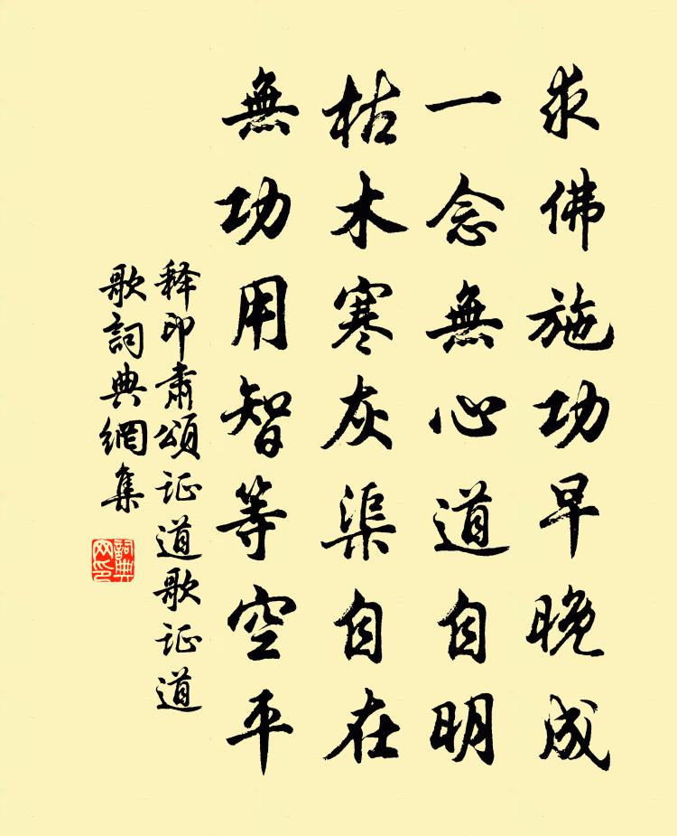 詩詞名句歷史字典書法欣賞書法字典國語詞典說文解字康熙字典古漢語字典標 題 作 者 詩 句 頌證道歌證道歌作者:釋印肅 朝代:宋代頌證道歌證道歌原文求佛施功早晚成,一念無心道自明。枯木寒灰渠自在,無功用智等空平。詩詞問答問:頌證道歌證道歌的作者是誰?答:釋印肅問:頌證道歌證道歌寫於哪個朝代?答:宋代釋印肅頌證道歌證道歌書法欣賞頌證道歌證道歌書法作品詩詞推薦和范景仁王景彝殿中雜題三十八首並次韻其二梅堯臣〔宋代〕天子尋常幸直廬,裹頭宮女捧雕輿。紅泥已賜春醅酒,黃帕曾經御覽書。林果鳥應銜去後,燕窠蟲有落來余。禁中雨中四首趙蕃〔宋代〕稍稍風頭變,侵侵雨腳來。峰巒忽成暗,雲霧亦旋開。謾易炎涼候,無矜狡獪才。天高獨鳥度,林合亂蟬哀。九日登神居留題陳造〔宋代〕行行十刻冒風沙,驟喜深堂放馬撾。旋報陰雲漏紅日,共追佳節把黃花。多煩沽酒留元亮,莫漫移文調孟嘉。未竟九華道中韓元吉〔宋代〕行人腳底不生塵,絕壁仙凡路已分。一水奔騰崖覆雪,九峰羅立岫填雲。謫仙才大三千首,國老謀深下萬軍。莫對到惡溪夜泊蘆島李德裕〔唐代〕甘露花香不再持,遠公應怪負前期。青蠅豈獨悲虞氏,黃犬應聞笑李斯。風雨瘴昏蠻日月,煙波魂斷惡溪時。嶺頭窗底張煒〔宋代〕日炙虛窗暖欲春,窗前椒蕾破梅英。朦朧困眼看書倦,驀聽蜂兒撲紙聲。戴君輓詞戴栩〔宋代〕舊識黃岩族,與余名姓同。碑呈今日誌,君繼古人風。活弟寧憐子,通身是至公。松岡燐濕雨,讀易玩泉蒙。余壬戌春校試進士同事者五十五人至戊子歲因吳芾〔宋代〕校試群才一日中,當時五十五人同。二十七年零落盡,只存我與二三公。吊盈盈三首王山〔宋代〕燭花紅死睡初醒,一枕孤懷病客情。海上有山應大夢,人間無路可長生。乾坤意入憑欄闊,風月人歸似舊情。漢殿題唐人按樂圖方回〔宋代〕鼓笛笙簫哄舞茵,伶官和尚雜宮人。黃番綽共唐三藏,仿佛相傳未必真。送葉茂叔淮安教方回〔宋代〕為儒元匪易,入仕似無難。捷疾非科第,飛騰即教官。梁城依汴古,楚郡號淮安。台省多知己,書燈莫遣寒。風光草際浮裴杞〔唐代〕澹蕩和風至,芊綿碧草長。徐吹遙撲翠,半偃乍浮光。葉似翻宵露,叢疑扇夕陽。逶迤明曲渚,照耀滿回塘。白芷頌古一百則釋正覺〔宋代〕年老成精不謬傳,趙州古佛嗣南泉。枯龜喪命因圖象,良馬追風累纏牽。勘破了老婆禪,說向人前不直錢。和歐陽少師會老堂次韻蘇軾〔宋代〕一時冠蓋盡嚴終,舊德年來豈易逢。聞道堂中延蓋叟,定應床下拜梁松。蠹魚自曬閒箱篋,科斗長收古鼎鍾。我欲宴餞逢寺丞口號喻良能〔宋代〕一扇清風自楚台,公堂蔥鬱玳筵開。旌幢映座千峰日,鼓吹喧天萬壑雷。秋水幾行揮玉箸,春蔥千指送金杯。甘棠金人捧露盤(梅花)高觀國〔宋代〕念瑤姬,翻瑤佩,下瑤池。冷香夢、吹上南枝。羅浮夢杳,憶曾清曉見仙姿。天寒翠袖,可憐是、倚竹依依。溪痕自勉華岳〔宋代〕世態風波不可論,且於閒處樂天真。肥家無子堪登隴,憂國有人休問津。顏色雖蒙時借我,腳跟那解日隨人。客來蝶戀花 昔鹿庵 軒,樂育淇上,一時秀造,王惲〔元代〕賓王校本改)中元已來,例宦遊四方。仆二十年間,三至鄉里,慨然有離索之嘆。今歲投紱自濟南來歸,而諸公頗呈劉子卿四首趙蕃〔宋代〕王氣東南盛,流風西北疎。往猶稱旅寓,今乃逐鄉閭。要熟兒童聽,惟傳父祖書。如公不一二,安得亦相於。一日曲楊軒〔宋代〕妾家鄧侯國,肯愧邯鄣姝。世本富繒綺,嬌愛比明珠。一五學組訓,未嘗開戶樞。十六失所適,姓名傾里閭。十七名句推薦有田不耕倉廩虛,有書不讀子孫愚。佚名《增廣賢文·上集》 葉落當歸根,雲沉久必起。錢嶫《憫黎詠》 有真性情,須有真涵養:有大識見,乃有大文章。王永彬《圍爐夜話·第一六二則》 況是清明好天氣,不妨游衍莫忘歸。程顥《郊行即事》 菡萏香銷翠葉殘,西風愁起綠波間。李璟《攤破浣溪沙·菡萏香銷翠葉殘》 正單衣試酒,恨客里、光陰虛擲。周邦彥《六醜·落花》 一生之內, 當無愧古人姚察、姚思廉《梁書·列傳·卷二十九》 憂勞可以興國,逸豫可以亡身歐陽修《伶官傳序》 相思血,都沁綠筠枝。姜夔《小重山令·賦潭州紅梅》 黃霧漲天雪晦冥,黑雲拂地風膻腥沈約《昭君辭》