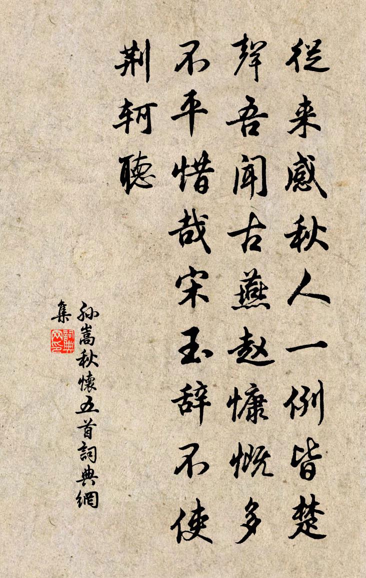 詩詞名句歷史字典書法欣賞書法字典國語詞典說文解字康熙字典古漢語字典標 題 作 者 詩 句 秋懷五首作者:孫嵩 朝代:宋代秋懷五首原文從來感秋人,一例皆楚聲。吾聞古燕趙,慷慨多不平。惜哉宋玉辭,不使荊軻聽。詩詞問答問:秋懷五首的作者是誰?答:孫嵩問:秋懷五首寫於哪個朝代?答:宋代孫嵩秋懷五首書法欣賞秋懷五首書法作品詩詞推薦長安道陸游〔宋代〕千夫登登供版築,萬手丁丁供斲木。歌樓舞榭高入雲,復幕重簾晝燒燭。中使傳宣騎飛鞚,達官侯見車擊轂。豈惟秦鏡王鎡〔宋代〕色帶金銅眩怪青,照人心膽已曾靈。鑄時便有山東影,不使秦皇見亂形。答和孔常父見寄黃庭堅〔宋代〕孔氏文章冠古今,君家兄弟況南金。為官落魄人誰問,從騎雍容獨見尋。旅館別時無宿酒,郵筒開處得新吟。黃山池州和同官詠梅花張道洽〔宋代〕殷勤天女供,那復一塵生。質淡全身白,行寒到骨清。常留雪中看,遮莫鬢邊橫。萬古月宮桂,猶吾異姓兄。頌古五十三首釋文禮〔宋代〕不動蒲帆問一言,大魚卻被小魚吞。直從意外超唇吻,始信岩頭無腦門。金剛台朱翌〔宋代〕兒子門生交說勤,要翁一出步溪雲。金剛台近城三里,玉友醅新盞十分。反照江山紅半斂,小春桃李暖如薰。心灰寓寺八首張耒〔宋代〕翠眉長好何曾損,寄語啼禽漫不閒。應為殘春足愁恨,長疑蹙破鏡中山。郡齋水閣閒書湖上文同〔宋代〕湖上雙禽泛泛,橋邊細柳垂垂。日午亭中無事,使君來此吟詩。送程孚叟知歸州蘇籀〔宋代〕岷江浮萬里,吳嶠駐彌年。笑理歸艎去,牢愁失眼前。德門桑梓盛,佳郡鶺鴒聯。委寄參羊陸,宜知備敵先。湖閣曉晴寄呈從翁二首李群玉〔唐代〕嶺日開寒霧,湖光盪霽華。風烏搖徑柳,水蝶戀幽花。蜀國地西極,吳門天一涯。輕舟欄下去,點點入湘霞。高秋禋郊詩余靖〔宋代〕函夏恢文治,禋燔講禮隆。物兼明德薦,天以至誠通。制度親祠盛,威儀陟配崇。戎容儼仙仗,霽色照郊宮。國典虞美人向子諲〔宋代〕以送之。時正之被召淮陽堂上曾相對。笑把姚黃醉。十年離亂有深憂。白髮蕭蕭同見、渚江秋。履聲細聽知何處。所居三章章八句一章章十句洪皓〔宋代〕昔我所居,巨室高門。或出或處,笑傲乾坤。終日熙熙,省定時昏。致君 * ,北志常存。東歸別所知羅隱〔唐代〕芙蓉宮闕二妃壇,兩處因依五歲寒。鄒律有風吹不變,郄枝無分住應難。愁心似火還燒鬢,別淚非珠謾落盤。卻羨芳洲寄示和章且及方外學再疊奉謝徐瑞〔宋代〕前修零落典刑空,堆筆須君持古風。敢意嚴詩編杜集,但希顏滬黜出公。區中隨順何妨道,物外倦狂更有功。安得【南呂】閱金經喬吉〔元代〕閨情玉減梅花瘦,翠顰妝鏡羞,雨念雲思何日休?休,休登江上樓。紅彎袖,淚痕都是愁。訝金紅鸞紙,染香丹鳳送李梁山之官二首魏了翁〔宋代〕時論苦伊優,如君莫肯留。乖逢惟有命,爵義不同謀。且袖長年手,來乘淺水舟。人間初水漲,一室自天游。空屋題(十月十四日夜)元稹〔唐代〕朝從空屋裡,騎馬入空台。盡日推閒事,還歸空屋來。月明穿暗隙,燈燼落殘灰。更想鹹陽道,魂車昨夜回。嘉禾百詠柘湖張堯同〔宋代〕神居陰陽護,尋國捍洪波。莫慮蛟龍怒,年來畏叱呵。侍宴覆舟山詩鮑照〔南北朝〕繁霜飛玉闥。愛景麗皇州。清蹕戒馳路。羽蓋佇宣游。神居既崇盛。嵓嶮信環周。禮俗陶德聲。昌會溢民謳。慚無名句推薦願得一心人,白頭不相離。卓文君《白頭吟》 白日不到處,青春恰自來。袁枚《苔》 峨嵋山下少人行,旌旗無光日色薄。白居易《長恨歌》 從善如登,從惡如崩司馬光《資治通鑑·魏紀·魏紀三》 是無貓邪,是不會蓄貓也。樂鈞《世無良貓》 千里稻花應秀色,五更桐葉最佳音。曾幾《蘇秀道中》 過盡征鴻來盡燕,故園訊息茫然。趙長卿《臨江仙·暮春》 思其人,至其鄉;其處在,其人亡。司馬光《資治通鑑·漢紀三十九》 美女渭橋東,春還事蠶作。李白《陌上桑》 南浦春來綠一川,石橋朱塔兩依然。范成大《橫塘·南浦春來綠一川》