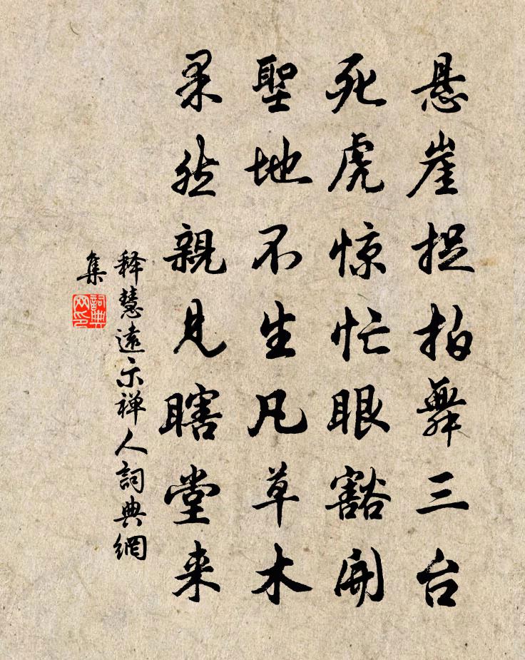 詩詞名句歷史字典書法欣賞書法字典國語詞典說文解字康熙字典古漢語字典標 題 作 者 詩 句 示禪人作者:釋慧遠 朝代:宋代示禪人原文懸崖捉拍舞三台,死虎驚忙眼豁開。聖地不生凡草木,果然親見瞎堂來。詩詞問答問:示禪人的作者是誰?答:釋慧遠問:示禪人寫於哪個朝代?答:宋代釋慧遠示禪人書法欣賞示禪人書法作品詩詞推薦酬趙二侍御使西軍贈兩省舊僚之作張九齡〔唐代〕石室先鳴者,金門待制同。操刀嘗願割,持斧竟稱雄。應敵兵初起,緣邊虜欲空。使車經隴月,征旆繞河風。忽枉謝惠蘭花黎道華〔宋代〕曉起微涼病骨蘇,國香和露到貧居。我今不向當門種,免被時人取次鋤。寄湯季庸侍郎劉克莊〔宋代〕粵從紫氣度函關,更十年中幾賜環。一葉身輕歸去勇,六丁力盡挽來難。高情常寄紛華外,晚節全觀出處間。別後由下梅至資福估賣官產喻良能〔宋代〕曉發下梅寺,霽色浮壠麥。崎嶇白楊岸,詰屈黃牛軛。野芳吐丰茸,山羽鳴格磔。驅車復前途,聊欲遍阡陌。南歌子姚述堯〔宋代〕載子強、二趙主管及諸同舍席間作素節秋強半,嘉名久最宜。霜風簌簌下天涯。幸有佳朋何惜、共登危。月窟諸仙十五日雪三首梅堯臣〔宋代〕春風九十日,一半已銷磨。準擬看花少,依稀詠雪多。官車猶載炭,菢鵲不離窠。向此興都盡,戴家誰復過。題祖道籃輿亭李處權〔宋代〕淵明佳致在籃輿,子以名亭德不孤。異代頗能同臭味,休年猶得見規模。掛檐明月聊堪問,入坐清風不待呼。我欲熊主簿示梅花十絕詩至梅花已過因觀海棠輒次劉克莊〔宋代〕萬蕊千葩染似紅,停杯無語恨東風。薄寒且為花愁惱,何況開時值雨中。舅母太夫人方氏輓詞三首范成大〔宋代〕四德儀邦族,三遷奠里門。姑寧憂疾痛,子自樂平反。夏枕方供扇,薰堂甫種萱。那知秋暑退,無復御輕軒。壽皇子程珌〔宋代〕太初生物孰元,渾生物淪蒙密。瀰漫宇宙,一氣沕潏。孰知是旱,無極有極。天高地下,人生物出。疇雖未分,易尋桂南山至崇壽院因往靈三首張鎡〔宋代〕迎客山僧未下廊,好風吹鼻便生狂。莫疑佛宇清芬烈,檐蔔曼殊共借香。陌上花八首晁補之〔宋代〕吳歌白紵怨芳菲,腸斷懷王去不歸。陌上如今小花伴,山前山後白鷳飛。唐封泰山樂章。壽和佚名〔唐代〕皇祖嚴配,配享皇天。皇皇降嘏,天子萬年。黃岩張之望之立來訪與游梅潭詩以送之陳傅良〔宋代〕張子好兄弟,別我今九年。東風颳眯眼,雙鵠忽墮前。坐定看兩鬢,喜極意慘然。來日豈不多,此意合少延。念子和趙提刑韻送呂堂長主簿姚勉〔宋代〕道在顏瓢欒不憂,清風端可繼前修。朅將西澗重新了,莫是東萊再出不。學校諸生俱向仰,文章太守共賡酬。戍瓜百合花洪咨夔〔宋代〕日月飛雙轂,如何駐黑頭。才看敷密友,又見拆強仇。葉聚稜稜峭,花垂娜娜稠。晚涼芬烈甚,欲睡更遲留。南歌子 原誤作南鄉子,茲據律改元好問〔金代〕人日過三日,元宵便五宵。共言今日好生朝。皓月光輝,香動玉梅梢。謝女工飛絮,周郎待小喬。年年燈下醉金蕉念奴嬌 賦雨岩辛棄疾〔宋代〕近來何處有吾愁?何處還知吾樂?一點淒涼千古意,獨倚西風寥廓。並竹尋泉,和雲種樹,喚作真閒客。此心閒處奉和襲美太湖詩二十首桃花塢陸龜蒙〔唐代〕行行問絕境,貴與名相親。空經桃花塢,不見秦時人。願此為東風,吹起枝上春。願此作流水,潛浮蕊中塵。願此送紅線冷朝陽〔唐代〕采菱歌怨木蘭舟,送客魂銷百尺樓。還似洛妃乘霧去,碧天無際水空流。名句推薦黃衫飛白馬,日日青樓下。陳克《菩薩蠻·赤闌橋盡香街直》 客里相逢,籬角黃昏,無言自倚修竹。姜夔《暗香疏影》 五嶽尋仙不辭遠,一生好入名山游。李白《廬山謠寄盧侍御虛舟》 單者易折,眾則難摧魏收《魏書·列傳·卷八十九》 流水孤村,荒城古道。陳霆《踏莎行·晚景》 見未真,勿輕言。知未的,勿輕傳。李毓秀《弟子規·信》 典盡客衣三尺雪,煉精詩句一頭霜。王建《維揚冬末寄幕中二從事》 自從明宰投巫後,直至如今鬼不神汪遵《西河》 錦瑟無端五十弦,一弦一柱思華年。李商隱《錦瑟》 重到故鄉交舊少,淒涼。卻恐它鄉勝故鄉。陸游《南鄉子·歸夢寄吳檣》