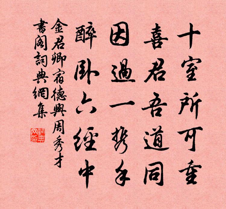 詩詞名句歷史字典書法欣賞書法字典國語詞典說文解字康熙字典古漢語字典標 題 作 者 詩 句 宿德興周秀才書閣作者:金君卿 朝代:宋代宿德興周秀才書閣原文十室所可重,喜君吾道同。因過一攜手,醉臥六經中。詩詞問答問:宿德興周秀才書閣的作者是誰?答:金君卿問:宿德興周秀才書閣寫於哪個朝代?答:宋代金君卿宿德興周秀才書閣書法欣賞宿德興周秀才書閣書法作品詩詞推薦都中閒居王羨門〔唐代〕君王巡海內,北闕下明台。雲物天中少,煙花歲後來。河從御苑出,山向國門開。寂寞東京里,空留賈誼才。初至青湘聞安仁帥司為曹成所襲四首胡寅〔宋代〕結束趨安地,征營報急書。諸軍聞好在,元帥竟何如。歲晏風雲慘,天低領海紆。悲歌撫長劍,吾道敢懷居。涼州詞二首·其一王翰〔唐代〕葡萄美酒夜光杯,欲飲琵琶馬上催。醉臥沙場君莫笑,古來征戰幾人回?早春寄擇之強至〔宋代〕北陸寒威盡,東郊晝景添。風和引禽哢,水暖出魚潛。草木回生意,乾坤待澤漸。寧知岩谷下,經歲嘆才淹。曾侍郎挽章王洋〔宋代〕道盛當堯日,名高嗣聖安。人推金鼎望,帝念玉樓居。舊典尊王跡,傳家教孝書。崇文華夏事,澹泊寄情疏。宿城外張氏莊早起入三首楊萬里〔宋代〕眠雲跂石十餘年,回首拋官一瞬間。送舊迎新也辛苦,一番辛苦兩年閒。出村李復〔宋代〕風露已淒淒,郊原百草腓。負樵山木下,轉粟戍人歸。野曠羊牛遠,場荒鳥雀稀。南山經月雨,猶有亂雲飛。奉和大梁相公重九日軍中宴會之什裴夷直〔唐代〕今古同嘉節,歡娛但異名。陶公緣綠醑,謝傅為蒼生。酒泛金英麗,詩通玉律清。何言辭物累,方系萬人情。虢州酬辛侍御見贈岑參〔唐代〕門柳葉已大,春花今復闌。鬢毛方二色,愁緒日千端。夫子屢新命,鄙夫仍舊官。相思難見面,時展尺書看。送陳景明尚書赴召四首黃公度〔宋代〕雁塔相先後,麟台數往還。至今清夜夢,時共早朝班。歲月棲遲里,雲泥指顧間。天涯瞻馬首,喜氣動衰顏。雜曲歌辭。盧女曲崔顥〔唐代〕二月春來半,宮中日漸長。柳垂金屋暖,花覆玉樓香。拂匣先臨鏡,調笙更炙簧。還將盧女曲,夜夜奉君王。失調名蘇軾〔宋代〕高安更過幾重山。過李生白居易〔唐代〕蘋小蒲葉短,南湖春水生。子近湖邊住,靜境稱高情。我為郡司馬,散拙無所營。使君知性野,衙退任閒行。行攜次韻劉常甫見贈二首陳造〔宋代〕重來觸目總宜詩,頗費行吟與坐思。舊友相過有嘉惠,滿篇更喜勝前時。連朝把玩驚飛動,萬象低摧受控時。塵翳三月三日上忠襄墳,因之行散,得十絕句楊萬里〔宋代〕遊人不是上墳回,便是清湍褉事來。最苦相逢無處避,天禧寺及雨花台。和知宗喜雨陽枋〔宋代〕災祥何秘問圓穹,自是承流得失中。旱魃憑誰投遠裔,靈科復啟仙宮。天憐南國人民困,雨走西郊畎舉通。前日勤惜黃花慢楊無咎〔宋代〕霽空如水。襯落木墜紅,遙山堆翠。獨立閒階,數聲□度風前,幾點雁橫雲際。已涼天氣未寒時,問好處、一年誰贈韋山人耿湋〔唐代〕失意成逋客,終年獨掩扉。無機狎鷗慣,多病見人稀。流水知行藥,孤雲伴採薇。空齋莫閒笑,心事與時違。偈頌一百六十首釋宗杲〔宋代〕平常無生句,妙玄無私句,體明無盡句。一鏃破三關,他家有本據。減字木蘭花仇遠〔宋代〕一番春暮。惱人更下瀟瀟雨。花片紛紛。燕子人家都是春。莫留春住。問春歸去家何處。春與人期。春未歸時人未名句推薦大漠沙如雪,燕山月似鉤。李賀《馬詩二十三首·其五》 父母在,不遠遊,遊必有方。孔子弟子《論語·里仁篇》 一襟余恨宮魂斷,年年翠陰庭樹。仇遠《齊天樂·蟬》 盤飧市遠無兼味,樽酒家貧只舊醅。杜甫《客至》 調角斷清秋,征人倚戍樓。張喬《書邊事》 三春白雪歸青冢,萬里黃河繞黑山。柳中庸《征人怨 / 征怨》 黃昏鼓角似邊州,三十年前上此樓。李益《上汝州郡樓》 不以規矩,不能成方圓孟子《孟子·離婁章句上·第一節》 獨出前門望野田,月明蕎麥花如雪。白居易《村夜》 儉則傷事,侈則傷貨管仲《管子·乘馬》