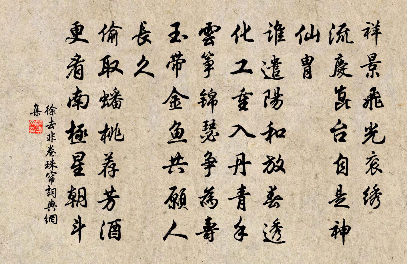 詩詞名句歷史字典書法欣賞書法字典國語詞典說文解字康熙字典古漢語字典標 題 作 者 詩 句 卷珠簾/蝶戀花作者:徐去非 朝代:宋代卷珠簾/蝶戀花原文祥景飛光袞繡。流慶崑台,自是神仙胄。誰遣陽和放春透。化工重入丹青手。雲箏錦瑟爭為壽。玉帶金魚,共願人長久。偷取蟠桃薦芳酒,更看南1~1極1*1星朝斗。詩詞問答問:卷珠簾/蝶戀花的作者是誰?答:徐去非問:卷珠簾/蝶戀花寫於哪個朝代?答:宋代問:卷珠簾/蝶戀花是什麼體裁?答:詞徐去非卷珠簾/蝶戀花書法欣賞卷珠簾/蝶戀花書法作品詩詞推薦陳武帝釣台周弼〔宋代〕歸心終自遂,何必戀虛聲。轉覺青衫惡,誰憐白髮生。掃花山石瘦,洗藥野泉清。應有忘機者,時來伴我行。春日五首秦觀〔宋代〕金屋舊題煩乙子,蜜脾新采賴蜂臣。蜻蜓蛺蝶無情思,隨例顛忙過一春。明日歌文嘉〔明代〕明日復明日,明日何其多。日日待明日,萬事成蹉跎。世人皆被明日累,明日無窮老將至。晨昏滾滾水流東,今古重讀徂徠集歐陽修〔宋代〕我欲哭石子,夜開徂徠編。開編未及讀,涕泗已漣漣。勉盡三四章,收淚輒忻懽。切切善惡戒,丁寧仁義言。如弭江上漁者范仲淹〔宋代〕江上往來人,但愛鱸魚美。君看一葉舟,出沒風波里。夜誦陳起〔宋代〕父子跏趺絕似僧,青燈一盞夜三更。讀殘戴記兒將倦,山栗旋煨仍擘橙。雪後尋梅偶得絕句十首陸游〔宋代〕雪晴蕭散曳筇枝,小塢尋梅正及時。臨水登山一年恨,十分說似要渠知。玉樓春馮延巳〔唐代〕雪雲乍變春雲簇,漸覺年華堪縱目。北枝梅蕊犯寒開,南浦波紋如酒綠。芳菲次第長相續,自是情多無處足。尊前和景仁探春韓維〔宋代〕才疏非所用,身退此其時。靜默安虛室,憂虞履薄澌。景和聞鵲稔,花近候梅知。杖履從茲數,非公孰與期。觀邵不疑學士所藏名書古畫梅堯臣〔宋代〕野性好書畫,無力能自致。每遇高趣人,常許出以視。邵侯多奇玩,留我特開笥。首觀阮與杜,驢上瞑目醉。韓乾蒙用諸人韻賦詩見貽復用韻謝之晁說之〔宋代〕昔人何事愛吾廬,燕雀鸞凰不並居。鄉社鳴琴欣日永,宦遊退鶂恨風初。迷樓賦罷夢何處,雙扇詩成淚不疏。莫問石莊臨大江望江陰君山懷淮陰違尉用去年送行孫應時〔宋代〕日把文書揖上官,恐將心事負儒冠。塵埃日月忙中度,學問工夫實處難。鶯谷已成經歲別,鷦巢且向一枝安。絕憐水(西蜀淨眾寺五題)鄭谷〔唐代〕竹院松廊分數派,不空清泚亦逶迤。落花相逐去何處,幽鷺獨來無限時。洗缽老僧臨岸久,釣魚閒客卷綸遲。晚晴夔門汪元量〔宋代〕赤甲山連白帝山,三巴三峽百牢關。孤舟行客愁無那,十二峰前十二灘。頌十玄談塵異釋印肅〔宋代〕我道驪珠到處晶,包含萬有獨明靈。同光索價遭人問,兩手張開帽帶陳。次韻毛君山房即事十首蘇轍〔宋代〕庵中獨宿雨垂垂,永夜無人款竹扉。灰冷銅爐香欲滅,床頭一點葛燈微。正月二十七日江鄰幾杜挺之劉原甫貢甫韓持國梅堯臣〔宋代〕昨日會飲我後至,誰欲比我為王戎。笑知卿輩意易敗,起誚便與俗物同。似過黃公酒壚下,嵇阮不見修竹中。杳爾舟中自吳之越寄潤州柳侍御開楊博士邁潘閬〔宋代〕兩岸山光合,況當三月天。好花紅照水,芳草綠隨船。貨藥村橋醉,收帆野渡眠。因思二朝客,同泛恐無緣。太常引許楨〔元代〕西池池上好新亭。紅翠門娉娉。翠蓋幾翻傾。聽水上、紅妝笑聲。歸來鄉社,不關塵事,活計問樵青。世事一毫輕謫居舒州累得韓高二舍人書作此寄之徐鉉〔唐代〕三峰煙靄碧臨谿,中有騷人理釣絲。會友少於分袂日,謫居多卻在朝時。丹心歷歷吾終信,俗慮悠悠爾不知。珍重名句推薦壚邊人似月,皓腕凝霜雪。韋莊《菩薩蠻·人人盡說江南好》 狡兔盡則良犬烹,敵國滅則謀臣亡。韓非及後人《韓非子·內儲說下六微》 雞聲茅店月,人跡板橋霜。溫庭筠《商山早行》 寬柔以教,不報無道,南方之強也。君子居之。子思《中庸·第十章》 春風疑不到天涯,二月山城未見花。歐陽修《戲答元珍》 漁舟逐水愛山春,兩岸桃花夾古津。王維《桃源行》 所向泥活活,思君令人瘦。杜甫《九日寄岑參》 無人調護,自去經心。沈復《浮生六記·閨房記樂》 為人全無好處,欲邀福慶,從何得來?王永彬《圍爐夜話·第一一四則》 東山老,可堪歲晚,獨聽桓箏。葉夢得《八聲甘州·壽陽樓八公山作》