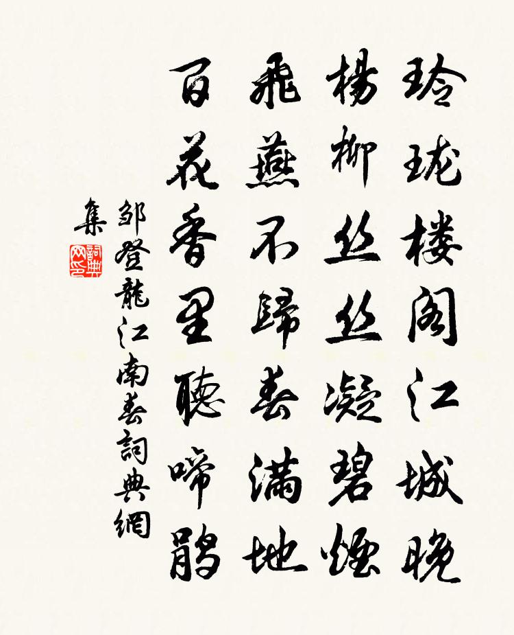 詩詞名句歷史字典書法欣賞書法字典國語詞典說文解字康熙字典古漢語字典標 題 作 者 詩 句 江南春作者:鄒登龍 朝代:宋代江南春原文玲瓏樓閣江城晚,楊柳絲絲凝碧煙。飛燕不歸春滿地,百花香里聽啼鵑。詩詞問答問:江南春的作者是誰?答:鄒登龍問:江南春寫於哪個朝代?答:宋代鄒登龍江南春書法欣賞江南春書法作品詩詞推薦三月六日趙蕃〔宋代〕自把殘書洗睡昏,欲求甚解與誰論。乍然好鳥聞深樾,忽爾荒雞聽遠村。雪後三首趙蕃〔宋代〕松竹夜枕聽,窗扉朝起看。雖成見晛喜,敢廢履冰難。照映形知穢,噓呵詩故寒。要難窮極覽,安得振飛翰。醜奴兒(梅花)楊 * 〔宋代〕冰姿冠絕人間世,傲雪凌霜。蕊點檀黃。更看紅唇間素妝。清芬不是先桃李,桃李無香。回出林塘。萬木叢中獨秉太白山觀雪薛嵎〔宋代〕二十里松聲,千山雪未晴。人當絕頂見,吟到此時清。大地球琳滿,空林鳥雀驚。老僧觀物化,無滅亦無生。雨後堅山行之約衛宗武〔宋代〕水泛親堤蘸柳條,郊行喜有可人招。不堪白髮三千丈,莫負青春九十朝。鷗鷺何妨為伴侶,鵾鵬一任詫扶搖。山靈菜羹白玉蟾〔宋代〕一卷仙家煮菜經,宰夫失笑太官驚。藍田山里空餐玉,豈識聞韶別是清。上趙茶馬度正〔宋代〕聖門絕學嘆中微,天佑斯文再發揮。宗袞爰升陪國論, * 特起贊經闈。麒麟復見公朝瑞,虎兕何憂我道非。千載南歌子佚名〔宋代〕風動槐龍舞,花深禁漏傳。一竿紅日照花磚。走馬晨暉門裡、快行宣。百五開新火,清明尚禁菸。魚符不請便朝天送龔少貽北赴汀州司戶王邁〔宋代〕莊敏與文獻,諸孫總俊髦。此郎如玉樹,初筮即珠曹。官小人能大,心清名自高。公餘須力學,流俗易滔滔。九月初作陸游〔宋代〕富貴功名未足雲,平生一飯不忘君。喔詩高韻淒金石,把釣幽情渺水雲。落葉打窗秋已暮,歸鴉泊樹日將曛。欲知鹿伯可郎中園池雜詠桃蹊樓鑰〔宋代〕幾樹桃花相映開,主人歸路入天台。憑誰寄語玄都觀,前度劉郎不更來。蝶戀花王庭珪〔宋代〕月落燈殘人散後。忽到尊前,但覺眉兒皺。數日不來如許瘦。裙腰減盡君知否。公子風流應自有。占斷春光,肯落和人食橘強至〔宋代〕洞庭一夜落清霜,枝上新苞葉底黃。摘去金沙摶作顆,剖來玉露結成囊。嶺頭梅小酸無味,渭北梨粗冷欠香。合薦春怨李白〔唐代〕白馬金羈遼海東,羅帷繡被臥春風。落月低軒窺燭盡,飛花入戶笑床空。游安樂道院李流謙〔宋代〕美璞出叢阜,徑寸藏尺水。堂堂大導師,鍾靈此其地。荒坑名老君,故老說遺事。仙佛勢不敵,北面昔所試。煙雲宿晉安亭盧照鄰〔唐代〕聞有弦歌地,穿鑿本多奇。遊人拭一覽,臨玩果忘疲。窗橫暮卷葉,檐臥古主枝。舊石開紅莽,新河覆綠池。孤猿王思道碑堂下作劉禹錫〔唐代〕蒼蒼宰樹起寒煙,尚有威名海內傳。四府舊聞多故吏,幾人垂淚拜碑前。玉泉看金魚徐集孫〔宋代〕石沼鑿瓊瑤,金鱗數百條。年深須變化,泉潔自逍遙。網罟難垂手,公卿擬上腰。龍宮衣梵法,翻水雨青霄。九月一日過孟十二倉曹、十四主簿兄弟杜甫〔唐代〕藜杖侵寒露,蓬門啟曙煙。力稀經樹歇,老困撥書眠。秋覺追隨盡,來因孝友偏。清談見滋味,爾輩可忘年。十二峰上升閻伯敏〔宋代〕黃麾白馬功告成,雲華夫人朝玉京。虞後夏後引音節,高低峽船搖櫓聲。名句推薦都雲作者痴,誰解其中味。曹雪芹《紅樓夢·第一回》 鷹擊長空,魚翔淺底,萬類霜天競自由。 * 《沁園春·長沙》 青冥浩蕩不見底,日月照耀金銀台。李白《夢遊天姥吟留別 / 別東魯諸公》 風一更,雪一更,聒碎鄉心夢不成,故園無此聲。納蘭性德《長相思·山一程》 獻賦十年猶未遇,羞將白髮對華簪。錢起《贈闕下裴舍人》 群芳過後西湖好,狼籍殘紅。歐陽修《採桑子·群芳過後西湖好》 更深人去寂靜,但照壁孤燈相映。周邦彥《關河令·秋陰時晴漸向暝》 記得那年花下,深夜,初識謝娘時。韋莊《荷葉杯·記得那年花下》 故山知好在,孤客自悲涼。蘇軾《臨江仙·送王緘》 長安故人別後,料征鴻聲里,畫闌憑偏。王月山《齊天樂·夜來疏雨鳴金井》