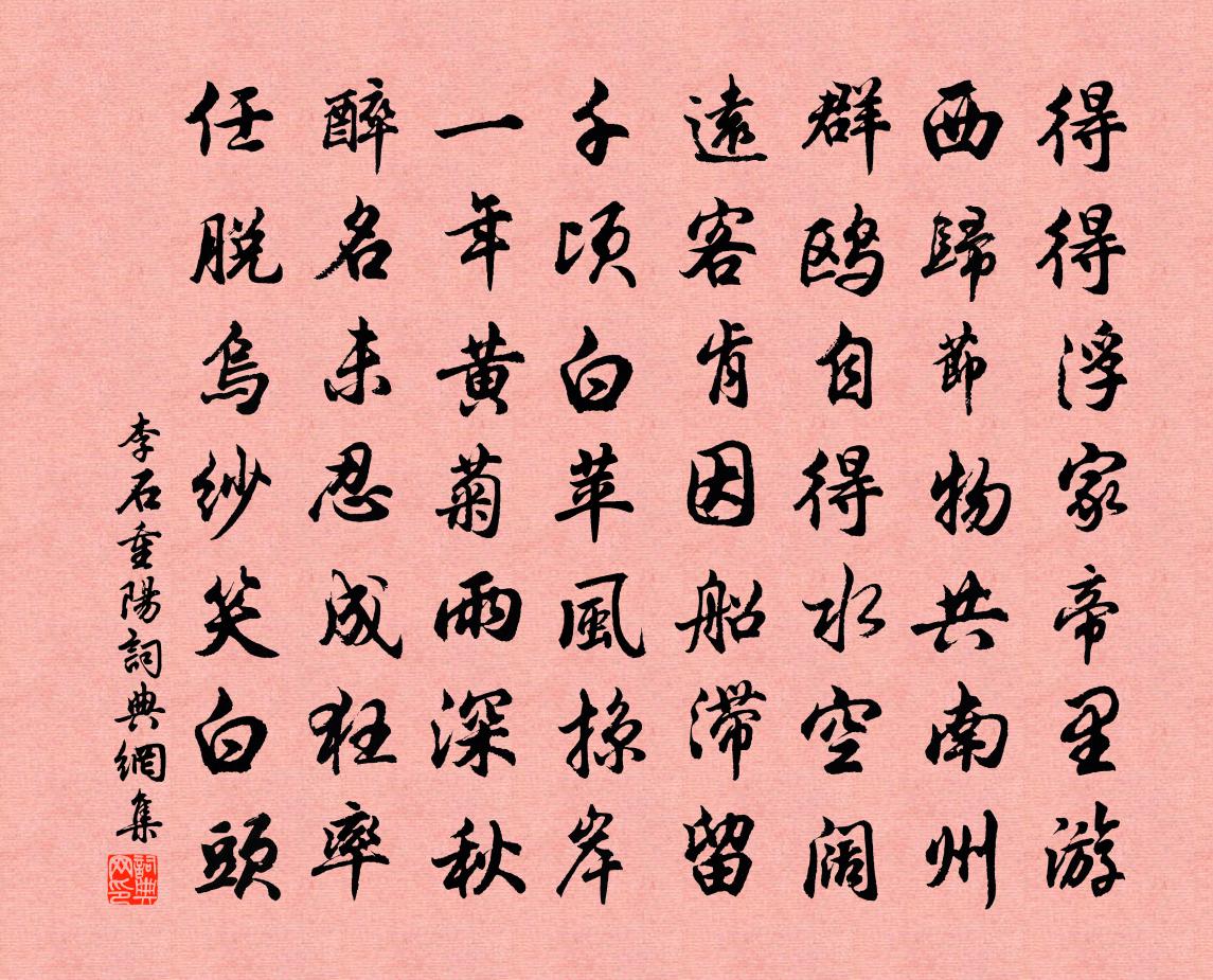 詩詞名句歷史字典書法欣賞書法字典國語詞典說文解字康熙字典古漢語字典標 題 作 者 詩 句 重陽作者:李石 朝代:宋代重陽原文得得浮家帝里游,西歸節物共南州。群鷗自得水空闊,遠客肯因船滯留。千頃白苹風掠岸,一年黃1/1菊雨深秋。醉名未忍成狂率,任脫烏紗笑白頭。詩詞問答問:重陽的作者是誰?答:李石問:重陽寫於哪個朝代?答:宋代李石重陽書法欣賞重陽書法作品詩詞推薦立春日雷方岳〔宋代〕出地奔霆便發聲,寒花衰草亦欣榮。天公只要新群聽,不等春來蟄已驚。寓言二首蘇泂〔宋代〕函關度青牛,生在空桑中。藁砧未刀頭,妾身變山峰。三年化為碧,是血本來紅。古來埋直氣,曾見吐長虹。之任建安淥溪亭偶作二首李頻〔唐代〕入境當春務,農蠶事正殷。逢溪難飲馬,度嶺更勞人。想取烝黎泰,無過賦斂均。不知成政後,誰是得為鄰。維舟自西懸趨南鄭道中雜詠三首李新〔宋代〕愛山不道妨行色,礙眼仍須徹帽裙。願借仙人白鷳尾,自家親掃北山雲。北庭作岑參〔唐代〕雁塞通鹽澤,龍堆接醋溝。孤城天北畔,絕域海西頭。秋雪春仍下,朝風夜不休。可知年四十,猶自未封侯。金丹詩四十八首張繼先〔宋代〕劉晨阮肇事多非,今日憑君子細推。謾使仙宮由色慾,卻將紫府貯奸欺。洞中清淨難容雜,穴里幽冥易變奇。大是壽紹慶金守陽枋〔宋代〕神光高射鬥牛墟,知是龍泉瑞氣舒。彩映北堂霜後檜,輝連東館月中書。江流現水描來似,峽束棠溪畫得如。為報西山余靖〔宋代〕萬壑千岩斗物華,搘筇閒訪道生涯。一壇星斗修真館,數里雲煙斸藥家。魚戲竹溪寒影碎,路穿松塢翠陰斜。桃源虎丘阻雨黃庚〔宋代〕石闌浸碧劍池空,池外秋聲萬壑風。人倚僧窗看風雨,亭亭塔影有無中。送鄧帥參文舉得南維守歸陳元晉〔宋代〕風流耆舊傳,悃逼靜無華。來重清油幙,歸乘皂蓋車。離筵傾柏葉,客路看梅花。聞有南來信,門前迓騎嘩。鷓鴣天(贈外孫夔)仲並〔宋代〕間世麒麟降自天。光輝列宿燦初躔。他年身致夔龍列,少日心存翰墨邊。簪彩筆,照金蓮。詞華當使思如泉。未論登衡山宿上封寺祝融峰柴元彪〔宋代〕歷井捫參上祝融,半空煙靄數聲鍾。地連雲漢九千丈,天柱東南七十重。石磴懸崖翻瀑布,海門碾日上高峰。悠然洞仙歌張繼先〔宋代〕孤峰絕頂,更無人能到。萬里虛空沒邊徼。正秋高景靜,霧掃雲收,風露里,惟有月華高照。浮生紛過客,好天良淑妃閣端午帖子夏竦〔宋代〕芳園踏草迎嘉節,紫掖鳴環奉鞠衣。渥惠日新鴻慶遠,永隆徽序耀層闈。東郊少步仇遠〔宋代〕高低遠近樹陰濃,杖屨閒行萬綠中。一片殘紅無覓處,卻疑身在碧紗籠。挽鄭宣教劉克莊〔宋代〕傳嫡生樞府,耽書肖肯亭。未論禽拜後,姑喜鯉趨庭。葛帔悲交態,瑤環憶妙齡。吾無施力處,遺恨托於銘。大衍易吟四十首方回〔宋代〕盛夏靡草死,歲寒松柏貞。泰須防陂復,否有大人亨。游大滌洞程鏜〔宋代〕松風吹客衣,縹渺凌絕境。古洞不見日,篝燈入幽暝。蒼苔暈石花,奔泉弄雲影。仙遊願初遂,秋山魂未省。我生寒北行曹勛〔宋代〕五月無芳草,經年不見花。蒼煙埋古木,朔吹卷龍沙。猶逢阿母海,愁看白博叉。仿佛南箕下,遙遙望漢家。追和陳去非宣和甲辰重九韻仇遠〔宋代〕世態炎涼不足憂,吾生贏得日優遊。九日忽驚楓葉落,百年幾見菊花秋。忘形詩酒新豐客,滿目溪山古溧州。聞道名句推薦別路琴聲斷,秋山猿鳥吟。盧照鄰《送梓州高參軍還京》 暮雨忽來鴻雁杳,莽關山、一派秋聲里。龔自珍《金縷曲·癸酉秋出都述懷有賦》 何期小會幽歡,變作離情別緒。柳永《晝夜樂·洞房記得初相遇》 惱亂橫波秋一寸。斜陽只與黃昏近。趙令畤《蝶戀花·卷絮風頭寒欲盡》 寒沙四面平,飛雪千里驚。范雲《效古詩》 傷心重見,依約眉山,黛痕低壓姜夔《慶宮春·雙槳蓴波》 相識滿天下,知心能幾人?佚名《增廣賢文·上集》 黃鸝驚夢破,青鳥喚春還。張弘范《臨江仙·憶舊》 湖南為客動經春,燕子銜泥兩度新。杜甫《燕子來舟中作》 人生如寄,何事辛苦怨斜暉。朱熹《水調歌頭·隱括杜牧之齊山詩》
