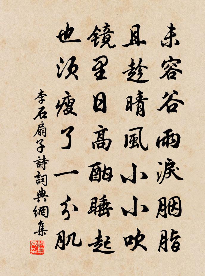 詩詞名句歷史字典書法欣賞書法字典國語詞典說文解字康熙字典古漢語字典標 題 作 者 詩 句 扇子詩作者:李石 朝代:宋代扇子詩原文未容穀雨淚胭脂,且趁晴風小小吹。鏡里日高酣睡起,也須瘦了一分肌。詩詞問答問:扇子詩的作者是誰?答:李石問:扇子詩寫於哪個朝代?答:宋代李石扇子詩書法欣賞扇子詩書法作品詩詞推薦開元雜題七首雪衣女陸龜蒙〔唐代〕嫩紅鉤曲雪花攢,月殿棲時片影殘。自說夜來春夢惡,學持金偈玉欄乾。安公子袁去華〔宋代〕弱柳絲千縷。嫩黃勻遍鴉啼處。寒入羅衣春尚淺,過一番風雨。問燕子來時,綠水橋邊路。曾畫樓、見個人人否。論詩三十首元好問〔金代〕撼樹蚍蜉自覺狂,書生技癢愛論量。老來留得詩千首,卻被何人校短長?奉和聖制九日侍宴應制得高字李適適〔唐代〕禁苑秋光入,宸游霽色高。萸房頒彩笥,菊蕊薦香醪。後騎縈堤柳,前旌拂御桃。王枚俱得從,淺淺愧飛毫。新涼陸游〔宋代〕月入楸梧徑,風生蘆荻林。脫巾涼入發,臨水爽披襟。寒暑推移久,江湖感慨深。功名雖已矣,猶得寓孤吟。山月袁燮〔宋代〕好風吹雨到山前,月與山翁故有緣。靜夜相看兩寥寂,水流岩下瀉潺潺。古瓦硯詩晏殊〔宋代〕鄴城宮殿久荒涼,縹瓦隨波出禁牆。誰約蘚文成古硯,等間裁破碧鴛鴦。已恣玉鋒磨蘚骨,更持蟾淚濕雲根。欲知初夏湖山張埴〔宋代〕山靈渾不倦差排,四供相隨好雨來。花木成行新膏沐,麻鞋更上一層台。登淨遠亭楊萬里〔宋代〕池冰受日未全開,旋旋波痕百皺來。野鴨被人驚得慣,作群飛去卻飛回。潤州送友人崔峒〔唐代〕見君還此地,灑淚向江邊。國士勞相問,家書無處傳。荒城胡馬跡,塞木戍人煙。一路堪愁思,孤舟何渺然。為九華王此山賦寧石鄭起〔宋代〕我謂此山天作石,石不是石人不識。千年野鶴獨見君,石上采芝石上吃。讀蘭台詩鄭剛中〔宋代〕天遣長庚下碧空,再將主白作坡翁。不然安得四二九,還宿潯陽太極宮。金州行衙張嵲〔宋代〕城頭翻鼓罷,庭樹晚風愁。破隙華星大,當檐素月流。灘聲侵夜急,江霧入城浮。此夕天涯客,何心倚戍樓。游武昌張耒〔宋代〕一葉橫江凌浩渺,李君見我迎門笑。鵝黃初熟醅旋壓,書室焚香地新掃。淋漓歌笑不知夜,竹榻枕藉眠諸少。老人秋夜泛舟王安石〔宋代〕池塹秋水淨,扁舟逆涼飆。的皪荷上珠,俯映疏星搖。深尋畏魚淰,中路且回橈。冥冥菰蒲中,乃復有驚跳。鴛鴦湖棹歌 之十朱彝尊〔清代〕檣燕檣烏繞楫師,樹頭樹底挽船絲。村邊處處圍桑葉,水上家家養鴨兒。驀山溪何夢桂〔宋代〕飛仙欲下,水殿嚴妝早。嬌濕怕春知,跨白虬、天門未曉。霓裳零亂,肌骨自清妍,梅檐月,柳橋風,世上紅塵杳自值夏小溪泛舟出大江楊萬里〔宋代〕放溜山溪一葉輕,山溪盡處大江橫。舟中寂寂無人語,只有波聲及雨聲。賦得月照冰池葉季良〔唐代〕霽夕雲初斂,棲娥月未虧。圓光生碧海,素色滿瑤池。天迥輪空見,波凝影詎窺。浮霜玉比彩,照像鏡同規。皎潔和從駕登雲居寺塔詩庾信〔南北朝〕重巒千仞塔。危磴九層台。石關恆逆上。山樑乍斗回。階下雲峰出。窗前風洞開。隔嶺鐘聲度。中天梵響來。平時名句推薦花紅易衰似郎意,水流無限似儂愁。劉禹錫《竹枝詞·山桃紅花滿上頭》 明月幾時有?把酒問青天。蘇軾《水調歌頭·丙辰中秋》 舒捲江山圖畫,應答龍魚悲嘯,不暇顧詩愁。楊炎正《水調歌頭·登多景樓》 一看腸一斷,好去莫回頭。白居易《南浦別》 溪深古雪在,石斷寒泉流。李白《尋高鳳石門山中元丹丘》 微陽下喬木,遠色隱秋山。馬戴《落日悵望》 恨君卻似江樓月,暫滿還虧,暫滿還虧,待得團圓是幾時?呂本中《採桑子·恨君不似江樓月》 萬里悲秋常作客,百年多病獨登台。杜甫《登高》 君子反道以修德;正德以出樂;和樂以成順。呂不韋《呂氏春秋·紀·季夏紀》 不勁直,不能矯奸。韓非及後人《韓非子·孤憤》