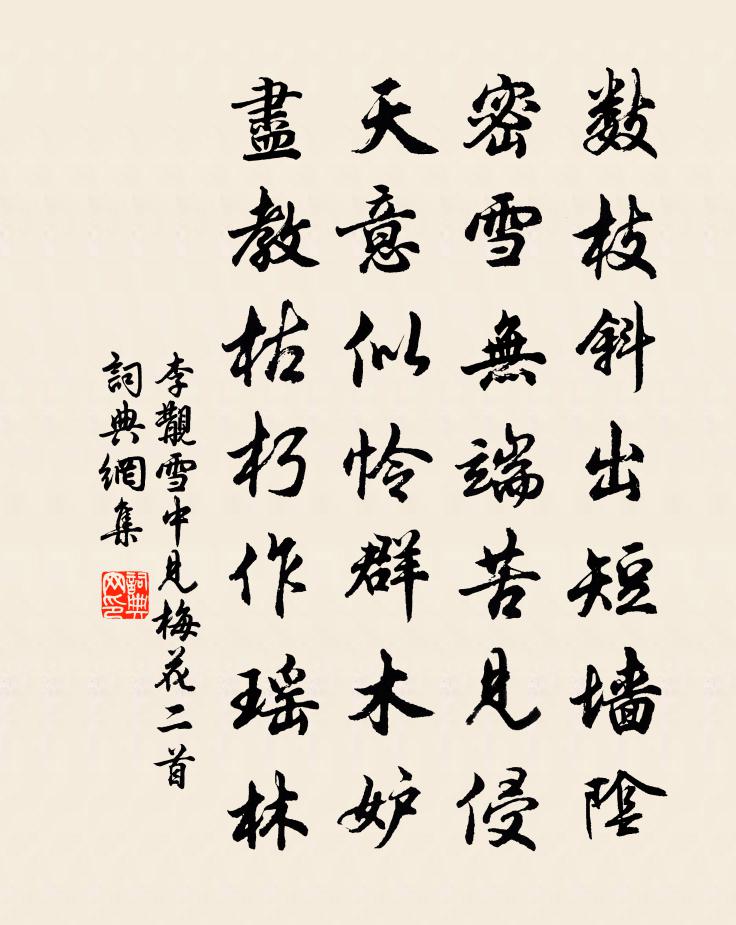 詩詞名句歷史字典書法欣賞書法字典國語詞典說文解字康熙字典古漢語字典標 題 作 者 詩 句 雪中見梅花二首作者:李覯 朝代:宋代雪中見梅花二首原文數枝斜出短牆陰,密雪無端苦見侵。天意似憐群木妒,盡教枯朽作瑤林。詩詞問答問:雪中見梅花二首的作者是誰?答:李覯問:雪中見梅花二首寫於哪個朝代?答:宋代李覯雪中見梅花二首書法欣賞雪中見梅花二首書法作品詩詞推薦敬答李先生溫庭筠〔唐代〕七里灘聲舜廟前,杏花初盛草芊芊。綠昏晴氣春風岸,紅漾輕綸野水天。不為傷離成極望,更因行樂惜流年。一瓢冬行三首盧仝〔唐代〕蟲豸臘月皆在蟄,吾獨何乃勞其形。小大無由知天命,但怪守道不得寧。老母妻子一揮手,涕下便作千里行。自顧遠峰楊萬里〔宋代〕狐巘秀何似?碧蓮含未開。誰將修月斧,斸取一火來。頌古三十一首釋如本〔宋代〕西來祖意問如何,柏樹庭前指似他。射虎不真徒沒羽,至今天下有譊訛。題崇山陳與義〔宋代〕短蓬如鳧鷖,載我萬斛愁。試登山上亭,卻望沙際舟。世故莽相急,長江去悠悠。西南浸山影,晦明分中流。盪搖和君實端明邵雍〔宋代〕養道自安恬,霜毛一任添。且無官責咎,倖免世猜嫌。蓬戶能安分,藜羹固不厭。一般偏好處,曝背向前檐。長信宮 [一作孟遲詩]趙嘏〔唐代〕君恩已盡欲何歸,猶有殘香在舞衣。自恨身輕不如燕,春來長繞御簾飛。題山寺僧房岑參〔唐代〕窗影搖群木,牆陰載一峰。野爐風自爇,山碓水能舂。勤學翻知誤,為官好欲慵。高僧暝不見,月出但聞鍾。詩貫休〔唐代〕經天緯地物,動必計仙才。幾處覓不得,有時還自來。真風含素髮,秋色入靈台。吟向霜蟾下,終須神鬼哀。晚春客愁五絕方回〔宋代〕十載干戈後,辛勤蒔牡丹。豈知身是客,借與別人看。殘句:風雨江城暮王禹偁〔宋代〕風雨江城暮。玉樓春(壽尊長)吳益〔宋代〕玉樓春信梅傳早。三八芳辰陽復後。稱觴喜對一椿高,萊庭雙桂森蘭茂。慚無好語為公壽。富貴榮華公自有,請歌蝦蟆姜特立〔宋代〕周公灑灰垂典教,為爾朋徒多取鬧。如今大索不相容,省口何如且泥淖。草堂寺詩陳堯咨〔宋代〕□□□跡□禪關,□殿清虛檜影間。客□□臨來此境,僧□興廢指前山。醉聞溪溜吟懷□,坐對嵐峰世慮閒。他日和富陽陳大夫禱雨有感韻曾豐〔宋代〕千里羈懷那更秋,一陪行樂一忘憂。看君俶儻足誰柅,顧我輪囷枝一虯。卓令下車宣漢詔,周王前籍訪箕疇。拔茅孫器之奉使淮浙至江為書見寄以詩謝之五首司馬光〔宋代〕沙漵鶴爭飛,波光可染衣。松江異淇水,信美不如歸。會故人集崔侍郎園池強至〔宋代〕貳卿園沼壓關西,上相篇章絕景宜。舊日宮牆流水過,至今苑地畫圖知。孤花春去猶臨岸,野蔓晴來欲占籬。荀令登壽寧寺閣王禹偁〔宋代〕乘興登虛閣,披襟一望間。聖朝新日月,亡國舊江山。柱隔晴虹斷,檐喧夕鳥還。歸衙不辭晚,吟思白雲閒。宮詞王珪〔唐代〕內庫從頭剛舞衣,一番時樣一番宜。才人物地新裝束,生色春衫畫折枝。禁中賞芍藥口占曹勛〔宋代〕千壺芍藥靄祥雲,一部簫韶合曲新。三聖臨軒聽歌舞,端知造物款留春。名句推薦仁不異遠,義不辭難班固《漢書·紀·武帝紀》 清風徐來,水波不興。蘇軾《前赤壁賦》 且莫思身外,長近尊前。周邦彥《滿庭芳·夏日溧水無想山作》 枕上十年事,江南二老憂,都到心頭。徐再思《水仙子·夜雨》 蓬生麻中,不扶而直;白沙在涅,與之俱黑。荀子《荀子·勸學》 江晚正愁予,山深聞鷓鴣。辛棄疾《菩薩蠻·書江西造口壁》 已訝衾枕冷,復見窗戶明。白居易《夜雪》 存為善之心,不必邀為善之名。王永彬《圍爐夜話·第五五則》 霸圖今已矣,驅馬復歸來。陳子昂《燕昭王》 君子必在己者,不必在人者也。呂不韋《呂氏春秋·覽·孝行覽》