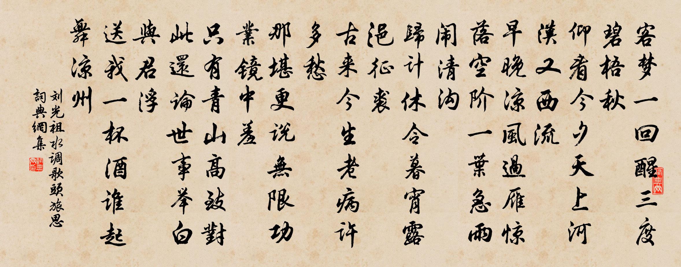 詩詞名句歷史字典書法欣賞書法字典國語詞典說文解字康熙字典古漢語字典標 題 作 者 詩 句 水調歌頭(旅思)作者:劉光祖 朝代:宋代水調歌頭(旅思)原文客夢一回醒,三度碧梧秋。仰看今夕天上,河漢又西流。早晚涼風過雁,驚落空階一葉,急雨鬧清溝。歸計休令暮,宵露浥征裘。古來今,生老病,許多愁。那堪更說,無限功業鏡中羞。只有青山高致,對此還論世事,舉白與君浮。送我一杯酒,誰起舞涼州。詩詞問答問:水調歌頭(旅思)的作者是誰?答:劉光祖問:水調歌頭(旅思)寫於哪個朝代?答:宋代問:水調歌頭(旅思)是什麼體裁?答:詞劉光祖水調歌頭(旅思)書法欣賞水調歌頭(旅思)書法作品詩詞推薦致爽亭二首張嵲〔宋代〕霧豁空江平,楚疏遠山出。龍溪夜來雨,爽氣侵衣濕。龜堂晨起陸游〔宋代〕培火螭爐起寶熏,滴泉鏊矸聚玄雲。屏圍燕几成山字,簟展涼軒作水紋。絕口不談浮世事,洗心聊策退居勛。耄年久雨方回〔宋代〕雲胡不出,積雨予尼。意彌八紘,膝此一席。誰具烝徒,假予楫航。一往滄海,觀彼茫洋。掩關晝眠,胡寧不暇,戲張天驥朱定國〔宋代〕羨公飄蕩一孤舟,來作錢塘十日游。水洗禪心都眼淨,山供詩筆總眉愁。雪中乘興真聊爾,春盡思歸都罷休。何事代壽韓平原劉過〔宋代〕宇宙之間物物春,戚疏曾不間陶鈞。裔分裴皞東西眷,誼篤嗣宗南北鄰。中令諸孫難遍識,棲筠俗子老堪親。試捐南鄉子佚名〔宋代〕識得水中金。鍛鍊烹煎理更深。進退抽添須九轉,浮沉。溫養潛龍復與臨。妙運自天心。托杖黃婆是丙壬。醞就醍瑞鶴仙佚名〔宋代〕過重陽三九。正日行析木,方移旦柳。天公愛黔首。念整頓乾坤,須還大手。蚌珠才剖。玉麒麟、世間希有。想當南鄉子張先〔宋代〕潮上水清渾。棹影輕於水底雲。去意徘徊無奈淚,衣巾。猶有當時粉黛痕。海近古城昏。暮角寒沙雁隊分。今夜相送僧還東嘉林逋〔宋代〕中林昨夜待微月,因想謝公池上樓。何意師言石門路,一瓶還自上歸舟。挽方孚若寺丞二首劉克莊〔宋代〕使君神雋似龍麟,行地飛空不可馴。詩里得朋卿與我,酒邊爭霸世無人。寶釵去盡中年病,珠履來疏晚節貧。昔共寄題湖州沈秀才天隱樓文同〔宋代〕自念久不偶,歸老東南州。地名水精宮,家有天隱樓。收卷勢利心,欲與汗漫遊。出處固以義,無為子光羞。送李司戶之官臨邛李流謙〔宋代〕威鳳翔九霄,千百但一遇。蒼蠅何所來,滿盤揮不去。吾人一肝腸,未可舍跬步。摻裾輒經年,把臂速炊黍。譬如施進之追路出嚴關,且寫予真,戲題其上范成大〔宋代〕喚渡牂牁瘴水濱,嚴關關外又逢春。神仙富貴俱何在,且作全家出嶺人。擬李義山柳枝詞五首陳師道〔宋代〕雨葉不自持,風花故入衣。飛花已無定,忍著惡風吹。次韻二首葉茵〔宋代〕難把來箋向後黏,載持珠玉傍風檐。吟根此性辭平易,學本於經意簡嚴。未遜彌明聯石鼎,還嗤韓渥賦香奩。陽春十拍子(暮秋)蘇軾〔宋代〕白酒新開九醞,黃花已過重陽。身外儻來都似夢,醉里無何即是鄉。東坡日月長。玉粉旋烹茶乳,金齏新搗橙香。贈李相士鄭清之〔宋代〕未遇公卿盡好看,會將碧眼照人寒。邯鄲夢覺君休問,試卜何時可掛冠。偈六十九首釋道寧〔宋代〕數聲歸笛離春浦,一片孤帆過洞津。到岸舍舟常式事,何須更問渡頭人。贈程秘書盧象〔唐代〕客自岐陽來,吐音若鳴鳳。孤飛畏不偶,獨立誰見用。忽從被褐中,召入承明宮。聖人借顏色,言事無不通。殷勤詩一首元絳〔宋代〕閩山過盡見吳山,天載天涯五馬還。舊列未歸青瑣闥,餘生方入玉門關。林蠻迤邐平無數,星斗闌乾近可攀。回首名句推薦所謂敬天者,不獨嚴而有禮,當有其實。張廷玉《明史·本紀·卷三》 而今燈漫掛。不是暗塵明月,那時元夜。蔣捷《女冠子·元夕》 玉皇開碧落,銀界失黃昏。毛滂《臨江仙·都城元夕》 江流天地外,山色有無中。王維《漢江臨泛 / 漢江臨眺》 虛靜無事,以暗見疵。韓非及後人《韓非子·主道》 不以求備取人,不以己長格物,隨能收敘,無隔疏賤。吳兢《貞觀政要·卷二·論任賢》 新知遭薄俗,舊好隔良緣。李商隱《風雨》 禍在於好利;害在於親小人尉繚《尉繚子·十二陵》 共說春來春去事,多時。一點愁心入翠眉。晏幾道《南鄉子·花落未須悲》 綠池芳草滿晴波,春色都從雨里過。高啟《春暮西園》