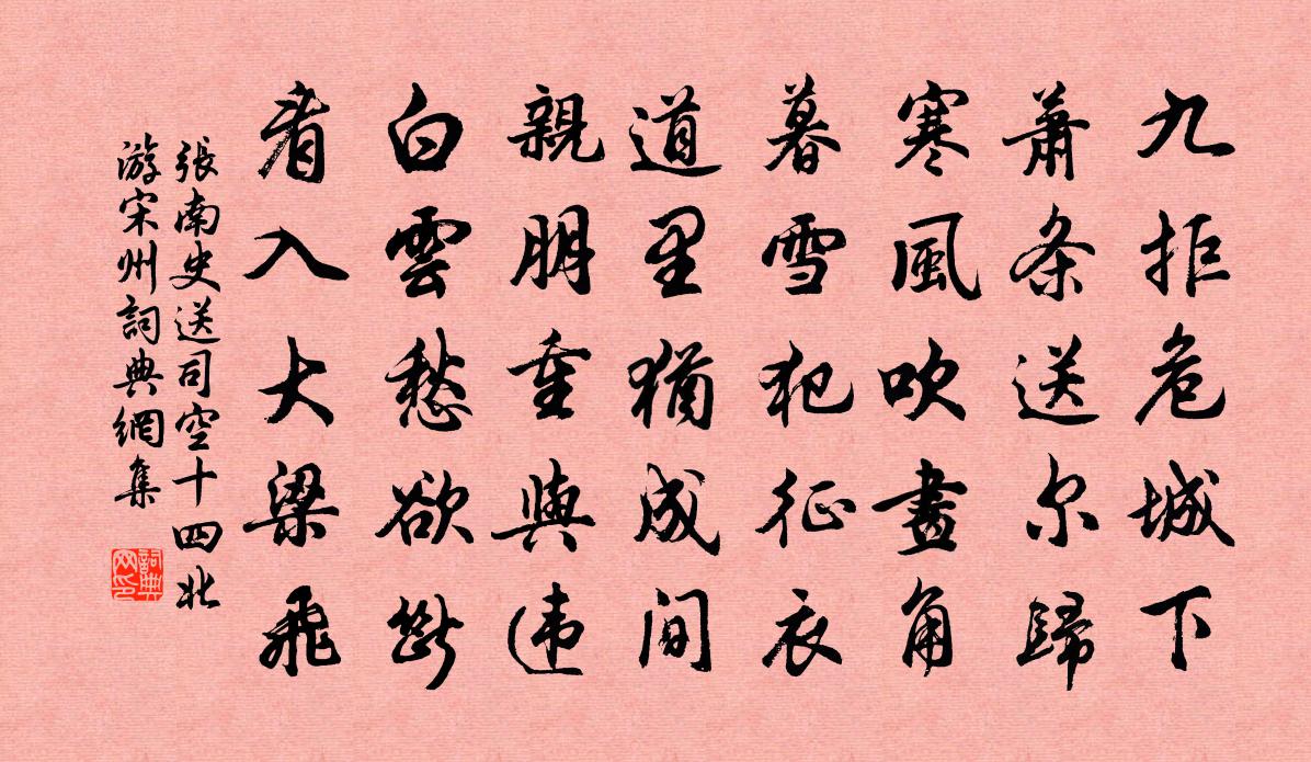 詩詞名句歷史字典書法欣賞書法字典國語詞典說文解字康熙字典古漢語字典標 題 作 者 詩 句 送司空十四北游宋州作者:張南史 朝代:唐代送司空十四北游宋州原文九拒危城下,蕭條送爾歸。寒風吹畫角,暮雪犯征衣。道里猶成間,親朋重與違。白雲愁欲斷,看入大梁飛。詩詞問答問:送司空十四北游宋州的作者是誰?答:張南史問:送司空十四北游宋州寫於哪個朝代?答:唐代張南史送司空十四北游宋州書法欣賞送司空十四北游宋州書法作品詩詞推薦忘歸亭樓鑰〔宋代〕一峰凜凜插煙霏,誰築新亭占石磯。標榜未應專一壑,此山何處不忘歸。送劉昚虛歸取宏詞解王昌齡〔唐代〕太清聞海鶴,遊子引鄉眄。聲隨羽儀遠。勢與歸雲便。青桂春再榮,白雲暮來變。遷飛在禮儀,豈復淚如霰。張仲通追賦洛中雜題和嘗歷覽者六章其六蘄竹梅堯臣〔宋代〕顋肥節腦瘦,蘄水長笛材。洛陽袁氏塢,此竹舊移來。雪霰飽已久,竅星誰為開。與君作龍吟,吹髮江南海。囉嗊曲六首·其三劉采春〔唐代〕莫作商人婦,金釵當卜錢。朝朝江口望,錯認幾人船。題新定郡齋寄孝叔二首右後池荷張伯玉〔宋代〕主人今向日邊歸,猶有清香滿謝池。為囑西風莫搖落,不禁憔悴夕陽時。庚子歲避地至玉山,酬韓司馬所贈獨孤及〔唐代〕滄海疾風起,洪波駭恬鱗。已無濟川分,甘作乘桴人。揮手謝秣陵,舉帆指甌閩。安和風塵表,偶與瓊瑤親。共悲午睡晁公溯〔宋代〕漸覺銅壺刻漏遲,捲簾花日弄晴輝。午窗睡美無人喚,夢逐遊絲自在飛。未有吟邵雍〔宋代〕未有一分功,先立十分敵。所得無分毫,所喪無紀極。初冬即事憶皇甫十白居易〔唐代〕冷竹風成韻,荒街葉作堆。欲尋聯句卷,先飲暖寒杯。帽為迎霜戴,爐因試火開。時時還有客,終不當君來。和盧明府送鄭十三還京兼寄之什孟浩然〔唐代〕昔時風景登臨地,今日衣冠送別筵。閒臥自傾彭澤酒,思歸長望白雲天。洞庭一葉驚秋早,瓠落空嗟滯江島。寄語又和酴醾韻項寅賓〔宋代〕天遣司花寶笈開,鮫綃散翦碧雲堆。芳根移自蠶叢遠,薰釀曾隨鳳詔來。只恐飄風撼新竹,卻驚殘雪觸蒼苔。水仙神弦范成大〔宋代〕雙娥一去三千秋,粉篁春淚凝古愁。神鼉悲鳴老龍怨,水為翻瀾云為留。素空逗露晚花泣,神官行水鱗僮濕。潮聲題靈山寺張喬〔唐代〕樹涼清島寺,虛閣敞禪扉。四面閒雲入,中流獨鳥歸。湖平幽徑近,船泊夜燈微。一宿秋風裡,煙波隔搗衣。題徐渭文《鐘山梅花圖》,同雲臣、南耕、京陳維崧〔清代〕十萬瓊枝,矯若銀虬,翩如玉鯨。正困不勝煙,香浮南內;嬌偏怯雨,影落西清。夾岸亭台,接天歌板,十四樓中一等吟邵雍〔宋代〕欲出第一等言,須有第一等意。欲為第一等人,須作第一等事。橫浦十詠湛泉劉黻〔宋代〕境僻遠塵跡,湛然風雨林。一泉通地脈,千古照人心。灌菊增花蘤,煎茶得味深。石渠才此爾,誰向道山尋。王才臣求園中六詩楊秘監謝尚書皆賦腴亭周必大〔宋代〕雨浥燕脂落,肌豐骨肉勻。方知杜陵老,曾寫此花真。江上書懷寄希晝釋文兆〔宋代〕扁舟宿江上,眽眽興何窮。吳楚十年客,蒹葭一夜風。東林秋信斷,南越石房空。向此都忘寐,君應與我同。贈毛仙翁李益〔唐代〕玉樹溶溶仙氣深,含光混俗似無心。長愁忽作鶴飛去,一片孤云何處尋。木蘭花慢 桃源梁寅〔元代〕愛山中日月,春漸去,又還來。望水繞人家,雲生窗戶,岫轉峰迴。層層絳桃千樹,似丹霞、散綺映樓台。世上從名句推薦有弗學,學之弗能,弗措也。有弗問,問之弗知,弗措也。有弗思,思之弗得,弗措也。有弗辨,辨之弗明,弗措子思《中庸·第二十章》 侵夜鸞開鏡,迎冬雉獻裘。李商隱《陳後宮》 蕭條亭障遠,悽慘風塵多庾信《擬詠懷二十七首·其二十六》 三冬暫就儒生學,千耦還從父老耕。陸游《觀村童戲溪上》 永豐西角荒園裡,盡日無人屬阿誰。白居易《楊柳枝二首》 疾風知勁草,板蕩識誠臣。李世民《賜蕭瑀》 背法而治,此任重道遠而無馬、牛,濟大川而無舡、楫也。商鞅《商君書·弱民》 人生不相見,動如參與商。杜甫《贈衛八處士》 綠楊煙外曉寒輕,紅杏枝頭春意鬧。宋祁《玉樓春·春景》 我醉欲眠卿且去,明朝有意抱琴來。李白《山中與幽人對酌》