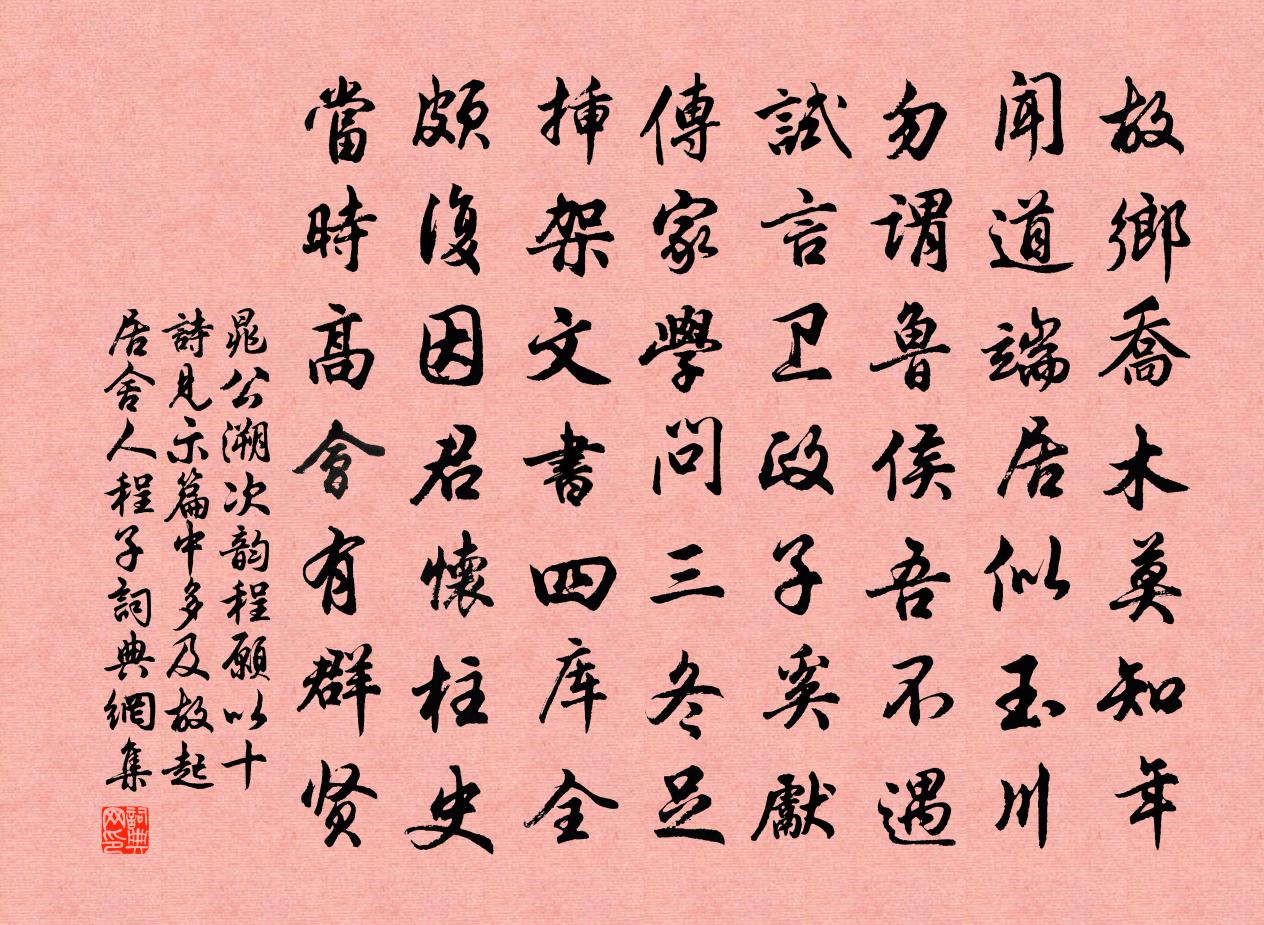 詩詞名句歷史字典書法欣賞書法字典國語詞典說文解字康熙字典古漢語字典標 題 作 者 詩 句 次韻程願以十詩見示篇中多及故起居舍人程子作者:晁公溯 朝代:宋代原文故鄉喬木莫知年,聞道端居似玉川。勿謂魯侯吾不遇,試言衛政子奚先。傳家學問三冬足,插架文書四庫全。頗復因君懷柱史,當時高會有群賢。詩詞問答問:《次韻程願以十詩見示篇中多及故起居舍人程子》的作者是誰?答:晁公溯問:該詩寫於哪個朝代?答:宋代書法欣賞次韻程願以十詩見示篇中多及故起居舍人程子書法作品詩文賞析【原題】:次韻程願以十詩見示篇中多及故起居舍人程子山老懶姑取其一用韻答之詩詞推薦不寐陸游〔宋代〕一竿江渚寄沉冥,衰疾侵凌失鬢青。困睫日中常欲閉,夜闌枕上卻惺惺。依韻和擇之惜春強至〔宋代〕何門織婦為春魔,幾聽啼鶯暗輟梭。美釀入唇宜莫算,芳期屈指已無多。迎風柳絮飄都盡,著雨花枝落半過。正好送人歸山釋文珦〔宋代〕君歸西山去,為愛山中雲。雲亦喜君歸,日夕常氤氳。雲蹤渺難期,別恨徒殷勤。他時望山色,眼中如見君。家居自戒陸游〔宋代〕平居少愧怍,動以直自遂;雖墮虎兕群,我已無死地。神仙果可學,吾輩恐差易。勿言聞道晚,努力補黥劓。嘆病鶴白居易〔唐代〕右翅低垂左脛傷,可憐風貌甚昂藏。亦知白日青天好,未要高飛且養瘡。句王禹錫〔宋代〕打葉雨拳隨手去,吹涼風口逐人來。讀書至夜半燈盡欲睡慨然有感陸游〔宋代〕白髮蕭蕭老空谷,人嘆厄窮心自足。東郊曉射墮錦雉,北崦春耕叱黃犢。區區世事何足論,未死斷知常閉門。關河鳳凰台劉次春〔宋代〕高台寥寞晚雲深,故國山河萬里心。若使當年真鳳見,不教春燕亦巢林。觀燈玉台體十首徐鉉〔唐代〕撫雲璈,吹玉簫。 * 回羅袂,香風閃步搖。能仁仁長老寫師像求贊釋正覺〔宋代〕大圓鏡性,平等智心。老兔臥寒兮清炯炯明月之窟,長鯨{左馬右展}海兮光漾漾珊瑚之林。千里雪翻波渺渺,百閔雨陸游〔宋代〕歲秋固多雨,每恨不及時。黃麈蔽赤日,苗槁已不遲。踏車聲如雷,力盡真何為!天豈不念民,雲族風散之。窮民挽歐陽梅坡吳勢卿〔宋代〕穆陵老進士,歸侍白雲鄉。前輩風流遠,斯文感慨長。平生足千載,盛德在諸郎。斜日城頭路,寒梅立莽蒼。西郊三首劉應時〔宋代〕紫槿綠籬愁意深,斜最墟落動秋砧。筆端有口江湖遠,莫寫乾時老子心。興安縣西南石峰秀拔無數曾豐〔宋代〕天限華夷數十峰,秦王始鑿始相逢。勞民浪辟嶠南國,失德徒成身後胸。楚粵未爭尋丈遠,炎涼無復半分同。賓鴻荊州十首蘇軾〔宋代〕朱檻城東角,高王此望沙。江山非一國,烽火畏三巴。戰骨淪秋草,危樓倚斷霞。百年豪傑盡,擾擾見魚蝦。中秋與諸子果飲楊萬里〔宋代〕幾年今夕一番逢,千古何人此興同?酒入銀河波底月,笛吹玉桂樹梢風。莫言秋色無多巧,淨洗清光也費工。老子挽胡季昭用王盧溪韻羅疸〔宋代〕百世期令固本支,一身寧復許安危。前瞻象郡賢方去,後有鶴山人效奇。地接宜陽山谷笑,舟回湘水屈原知。櫝中用坡仙梅花十韻訪梅劉黻〔宋代〕山寒木落峭孤台,南北常分冷暖開。自笑三生如結習,每來月下立蒼苔。水龍吟(雪霽登吳山見滄閣,聞城中簫鼓聲)翁元龍〔宋代〕畫樓紅濕斜陽,素妝褪出山眉翠。街聲暮起,塵侵燈戶,月來舞地。宮柳招鶯,水葒飄雁,隔年春意。黯梨雲,散淳熙已酉二月二日皇帝登寶位鎡獲廁廷紳輒成張鎡〔宋代〕聰哲從來簡帝心,萬方臣子合君臨。東常議事猶經歲,仰體慈皇屬意深。名句推薦猶憐慣去國,疑是夢還家。盧僎《歲晚還京台望城闕成口號先贈交親》 堂前撲棗任西鄰,無食無兒一婦人。杜甫《又呈吳郎》 夜來攜手夢同游,晨起盈巾淚莫收。白居易《夢微之》 顛狂柳絮隨風去,輕薄桃花逐水流。杜甫《絕句漫興九首·其五》 還怕掩、深院梨花,又作故人清淚。吳文英《無悶·催雪》 師之所處,荊棘生焉。大軍之後,必有凶年。老子《老子·道經·第三十章》 綺席凝塵,香閨掩霧。晏殊《踏莎行·碧海無波》 民感桑林雨,雲施李靖龍。趙汝愚《雨後送李將軍還祠偕同寅飲一杯亭》 更深人去寂靜,但照壁孤燈相映。周邦彥《關河令·秋陰時晴漸向暝》 君疑臣則臣必死。羅貫中《三國演義·第一百一十九回》