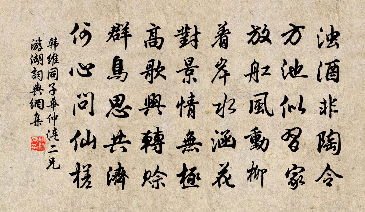 詩詞名句歷史字典書法欣賞書法字典國語詞典說文解字康熙字典古漢語字典標 題 作 者 詩 句 同子華仲連二兄游湖作者:韓維 朝代:宋代同子華仲連二兄游湖原文濁酒非陶令,方池似習家。放舡風動柳,著岸水涵花。對景情無極,高歌興轉賒。群鳥思共濟,何心問仙槎。詩詞問答問:同子華仲連二兄游湖的作者是誰?答:韓維問:同子華仲連二兄游湖寫於哪個朝代?答:宋代韓維同子華仲連二兄游湖書法欣賞同子華仲連二兄游湖書法作品詩詞推薦和孔密州五絕 東欄梨花蘇軾〔宋代〕梨花淡白柳深青,柳絮飛時花滿城。惆悵東欄二株雪,人生看得幾清明。舍東追涼陸游〔宋代〕驕陽收火傘,清露貯冰壼。海涌四更月,風生千頃蒲。砍狂忘老境,意豁失窮途。所恨朋儕盡,無人為攬須。虞丈以傷物遂再賦姜特立〔宋代〕省口須知亦省緣,食經爾雅不勞編。山中且縱無腸子,海上長隨踞殼仙。凡物身中皆有佛,何人性里獨無天。反騷登秀山至半而還有懷賓暘方回〔宋代〕擁書終日汗如漿,試上崔嵬覓晚涼。忽喜孤煙支拄杖,偶逢平石寘繩床。十年世事頭須白,六月江城草樹蒼。莫盡寄題趙侯澄碧軒秦觀〔宋代〕風流公子四難井,更引清漪作小亭。潤及玉階春漲雨,光浮藻井夜涵星。捲簾幾硯成圖書,倚檻須鬟人鍾屏。何日殘句:日來霜露後陳師道〔宋代〕日來霜露後,更覺天宇淨。燕林石澗〔宋代〕年年因社到,海闊翅飛低。故國傷新別,空梁憶舊棲。暮簾疏竹雨,春岸落花泥。紅線今何在,香愁滿繡閨。秋峽杜甫〔唐代〕江濤萬古峽,肺氣久衰翁。不寐防巴虎,全生狎楚童。衣裳垂素髮,門巷落丹楓。常怪商山老,兼存翊贊功。無題陳棣〔宋代〕斥鷃蒿蓬足,鯤鵬謾北溟。餘生薰白業,內景練黃庭。大白蟻浮綠,短檠燈閃青。欲知陶令趣,應向醉中醒。寄李處士秦韜玉〔唐代〕呂望甘羅道已彰,只憑時數為門張。世途必竟皆應定,人事都來不在忙。要路強幹情本薄,舊山歸去意偏長。因君舟行邂逅別吳子明郎中袁說友〔宋代〕杜宇催歸急,青山送客忙。去帆辭斷港,過眼接危檣。親戚五年別,尊罍一笑長。山西墮殘照,不忍酹離觴。宴坐庵范成大〔宋代〕油燈已暗忽微明,石鼎將乾尚有聲。衲被蒙頭籠兩袖,藜床無地著功名。玉泉山楊叔蘭〔宋代〕人生天地間,今古一□觀。凌空絕虛曠,萬象羅岩巒。能一故□應,物化千□端。萬端總歸一,唯悟無□言。舊聞秋熱宋祁〔宋代〕風物連南國,炎威逼早秋。墮飛波上翼,誤喘月中牛。雲杼衣全解,冰壺渴未瘳。此時班女怨,虛為素紈愁。逍遙峰訪李覯不遇饒子尚〔宋代〕疊嶂南奔似躍龍,逍遙樓畔識奇蹤。雲根盤地三千丈,石徇參天第一峰。歲久已知蒼蘚合,曉來常怪翠雲封。肩輿次韻楊君金送酒黃庭堅〔宋代〕扶衰卻老世無方,惟有君家酒未嘗。秋入園林花老眼,茗搜文字響枯腸。醡頭夜雨排檐滴,杯麵春風繞鼻香。不待高士詠南郭子綦吳筠〔唐代〕子綦方隱几,冥寂久灰心。悟來應顏游,清義杳何深。含響盡天籟,有言同鷇音。是非不足辯,安用勞神襟。雲頂山薛紹彭〔宋代〕山壓眾峰首,寺占紫雲頂。西遊金泉來,登山緩歸軫。昨暮下三峽,出谷已延頸。山名高劍外,回首陋前嶺。躋攀湖上偶成二首白玉蟾〔宋代〕湖天清曠萬緣虛,暫借僧房作宰予。夢覺風涼歸去晚,滿空飛翠撲籃輿。垂虹亭祝乂〔宋代〕冷浸三江碧,青圍四面山。帆歸煙浪杪,人住水雲間。風颭波聲碎,虹垂雨意間。無端動歸興,一棹喜輕還。名句推薦青青河畔草,綿綿思遠道。佚名《飲馬長城窟行》 採得百花成蜜後,為誰辛苦為誰甜。羅隱《蜂》 謝公宿處今尚在,淥水蕩漾清猿啼李白《夢遊天姥吟留別/夢遊天姥山別東魯諸公》 秦地羅敷女,採桑綠水邊。李白《子夜吳歌·春歌》 別離還有經年客,悵望不如河鼓星。徐凝《七夕》 年年春日異鄉悲,杜曲黃鶯可得知。韋莊《江外思鄉》 多讀兩句書,少說一句話,讀得兩行書,說得幾句話。陳繼儒《小窗幽記·集醒篇》 日落波平。愁損辭鄉去國人。朱敦儒《採桑子·彭浪磯》 離人心上秋。吳文英《唐多令·惜別》 為山九仞,功虧一簣。佚名《尚書·周書·旅獒》