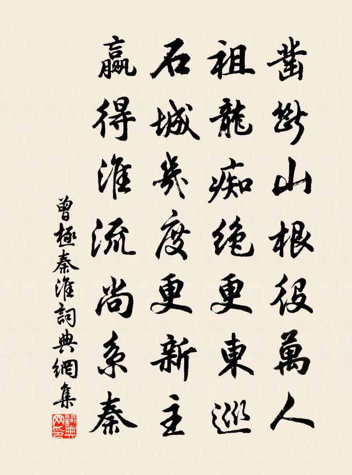 詩詞名句歷史字典書法欣賞書法字典國語詞典說文解字康熙字典古漢語字典標 題 作 者 詩 句 秦淮作者:曾極 朝代:宋代秦淮原文鑿斷山根役萬人,祖龍痴絕更東巡。石城幾度更新主,贏得淮流尚系秦。詩詞問答問:秦淮的作者是誰?答:曾極問:秦淮寫於哪個朝代?答:宋代曾極秦淮書法欣賞秦淮書法作品詩詞推薦偈頌六十首釋曇華〔宋代〕心佛及眾生,笑而還復喜。笑喜本無根,緇素誠有旨。千古萬古人,幾個識道理。道理深,何處尋。海枯終見底,和周仲容春日二律句楊萬里〔宋代〕饑民日夜去,也有不荒田。舊雨仍新雨,今年勝去年。未嫌詩得瘦,只苦茗妨眠。花氣薰人醉,來從若個邊。送西京簽判王著作王安石〔宋代〕兒曹曾上洛城頭,尚記清波繞驛流。卻想山川常在夢,可憐顏發已驚秋。辟書今日看君去,著籍長年嘆我留。三十小舟游近村舍舟步歸陸游〔宋代〕借得漁船泝小溪,繫船浦口卻扶藜。莫言村落蕭條甚,也勝京塵沒馬蹄。清靜經白玉蟾〔宋代〕大地山河一卷經,拈來題目甚分明。山花野草皆談說,蠢動含靈側耳聽。銅柱辭李宏皋〔唐代〕招靈鑄柱垂英烈,手執干戈征百越。誕今鑄柱庇黔黎,指畫風雷開五溪。五溪之險不足恃,我旅爭登若平地。五溪諷阻臨安趙府尹伐淨慈寺門松釋道濟〔宋代〕白石磷磷積翠嵐,翠嵐深處結茅庵。煮茶迎客月當戶,採藥出門雲滿籃。琴掛葛弦鳴素志,窗開風拂罷清談。今朝句黃彥平〔宋代〕湘江東西中浯溪,雲埋雨洗三吾碑。賦望雲寮劉黻〔宋代〕家山一望三午里,華發雙親七十稀。自許朴忠寬社稷,誰知甘旨悞庭闈。菜根有味逢春雨,草色無邊傍日暉。總總薄暑陸游〔宋代〕仲夏暑尚薄,孤村日尤長。僧坊初施浴,行路亦饋漿。老我絕人事,終日坐虛堂。南北兩松棚,細細吹清香。堂中千年調(開山徑得石壁,因名曰蒼壁,出望外,意天之所賜邪,喜而賦之)辛棄疾〔宋代〕左手把青霓,右手挾明月。吾使豐隆前導,叫開閶闔。週遊上下,逕入寥天一。覽縣圃,萬斛泉,千丈石。鈞天廣題汪季路尚書所藏米元暉湖山瑞雪圖樓鑰〔宋代〕筆力誰能似虎兒,思陵親為御珍題。小臣不識湖山好,但欲扁舟泛剡谿。虞美人劉辰翁〔宋代〕天香國色辭脂粉。肯愛紅衫嫩。然自取玉為衣。似是銀河水皺、織成機。寒欺薄薄春無力。月浸霓裳濕。一窠香雪句張耒〔宋代〕空林掛夕陽。夜行船楊無咎〔宋代〕怪被東風相誤。落輕帆、暫停煙渚。桐樹陰森,茅檐瀟灑,元是那回來處。相與狂朋沽綠醑。聽胡姬、隔窗言語。登仙人掌山徐元傑〔宋代〕山名仙掌足盤桓,未醉黃花半日閒。更上一層高著眺,此身擬可透天關。和梁次張謝得酒見寄四首吳芾〔宋代〕春入橫塘綠勝醅,更將清淺照寒梅。試吟秀句臨流坐,引得疏枝一晌開。浣溪沙 春日即事劉辰翁〔宋代〕遠遠遊蜂不記家。數行新柳自啼鴉。尋思舊事即天涯。睡起有情和畫卷,燕歸無語傍人斜。晚風吹落小瓶花。官采木洪咨夔〔宋代〕深山風雨幾百秋,直乾雲漢大蔽牛。輪囷離奇不尺度,一旦出應天家搜。山摧浪壓斧斤下,橫亘十畝眠蒼虬。白頭早發宗澤〔宋代〕繖幄垂垂馬踏沙,水長山遠路多花。眼中形勢胸中策,緩步徐行靜不嘩。名句推薦少年射虎名豪,等閒赤羽千夫膳元好問《水龍吟·從商帥國器獵於南陽同仲澤鼎玉賦此》 傳聞一戰百神愁,兩岸強兵過未休。曹松《己亥歲二首·僖宗廣明元年》 夫因兵死守蓬茅,麻薴衣衫鬢髮焦。杜荀鶴《山中寡婦 / 時世行》 貨無大小,缺者便貴。馮夢龍《醒世恆言·卷三十五》 移風易俗,莫善於樂。孔子及其弟子《孝經·廣要道》 誰謂傷心畫不成,畫人心逐世人情。韋莊《金陵圖》 事窮勢蹙之人,當原其初心;功成行滿之士,要觀其末路。洪應明《菜根譚·概論》 借問承恩者,雙蛾幾許長?皇甫冉《婕妤怨》 寒眼亂空闊,客意不勝秋。楊炎正《水調歌頭·登多景樓》 宮粉雕痕,仙雲墮影,無人野水荒灣。吳文英《高陽台·落梅》