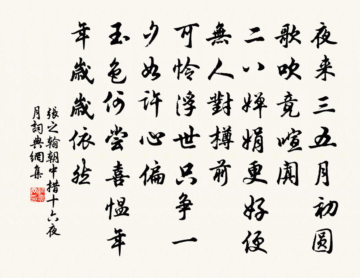 詩詞名句歷史字典書法欣賞書法字典國語詞典說文解字康熙字典古漢語字典標 題 作 者 詩 句 朝中措 十六夜月作者:張之翰 朝代:元代朝中措 十六夜月原文夜來三五月初圓。歌吹竟喧闐。二八嬋娟更好,便無人對樽前。可憐浮世,只爭一夕,如許心偏。玉色何嘗喜慍,年年歲歲依然。詩詞問答問:朝中措 十六夜月的作者是誰?答:張之翰問:朝中措 十六夜月寫於哪個朝代?答:元代問:朝中措 十六夜月是什麼體裁?答:詞張之翰朝中措 十六夜月書法欣賞朝中措 十六夜月書法作品詩詞推薦菩薩蠻 盆梅劉敏中〔元代〕纖條漸見稀稀蕾。孤根旋透溫溫水。但得一枝春。誰嫌老瓦盆。寒愁芳意懶。移近南窗暖。卻怕盛開時。香魂來索橫山劉倓〔宋代〕五更一霎清明雨,曉霧梨花夢白雲。半嶺肩輿猶兀兀,一杯卯酒尚曛曛。句孫何〔宋代〕誰如張璪工松石,擬裂鮫綃畫作圖。山居可止〔唐代〕雪消春力展,花漫洞門垂。果長纖枝曲,岩崩直道移。重猿圍淺井,斗鼠下疏籬。寒食微燈在,高風勢徹陂。贈崔禮駙馬王建〔唐代〕鳳凰樓閣連宮樹,天子崔郎自愛貧。金埒減添栽藥地,玉鞭平與賣書人。家中弦管聽常少,分外詩篇看即新。一月卜運算元張孝祥〔宋代〕萬里去擔簦,誰識新豐旅。好事些兒說與郎,奴是姮娥侶。若到廣寒宮,但道奴傳語。待我仙郎折桂枝,揀個高枝歸田(時三十七)元稹〔唐代〕陶君三十七,掛綬出都門。我亦今年去,商山淅岸村。冬修方丈室,春種桔槔園。千萬人間事,從茲不復言。今春苦雨初有春半曾無十日晴之句去立夏無幾方回〔宋代〕湖頭準擬賞新晴,雨過風號萬馬聲。宋玉未夸巫峽夢,杜陵翻作渼陂行。廣陵會三同舍各以其字為韻仍邀同賦劉貢父蘇軾〔宋代〕去年送劉郎,醉語已驚眾。如今各漂泊,筆硯誰能弄。我命不在天,羿彀未必中。作詩聊遣意,老大慵譏諷。夫子江上使風呈裴宣州耀卿張九齡〔唐代〕江路與天連,風帆何淼然。遙林浪出沒,孤舫鳥聯翩。常愛千鈞重,深思萬事捐。報恩非徇祿,還逐賈人船。觀楊之美畫梅堯臣〔宋代〕天官乘車建朱旗,赤旛前亞風卷披。二龍緩駕蒼髯垂,印箱傍挈文籍隨。雙驂推軛如畏遲,行從冠服多威儀。水官晨詣超師院讀禪經柳宗元〔唐代〕汲井漱寒齒,清心拂塵服。閒持貝葉書,步出東齋讀。真源了無取,妄跡世所逐。遺言冀可冥,繕性何由熟。道人吊屈原呈王內翰釋文兆〔宋代〕抱清誰可群,委質在湘濆。今日不同楚,無人更似君。滄波沈夜魄,古廟聚寒雲。吊罷踟躕處,漁歌忍獨聞。香山寺二絕白居易〔唐代〕空山寂靜老夫閒,伴鳥隨雲往復還。家醞滿瓶書滿架,半移生計入香山。愛風岩上攀松蓋,戀月潭邊坐石棱。且共游善區寺王諶〔宋代〕閒來古寺欲忘歸,無奈征塵染素衣。綠葉雲稠荒澗水,白雲青濕舊禪扉。窗涵遠色明丹篆,鍾冒嵐煙入翠微。盛世書文與可墨竹蘇軾〔宋代〕筆與子皆逝,詩今誰為新。空遺運斤質,卻吊斷弦人。將過單于許棠〔唐代〕荒磧連天堡戍稀,日憂蕃寇卻忘機。江山不到處皆到,隴雁已歸時未歸。行李亦須攜戰器,趨迎當便著戎衣。并州春感釋文珦〔宋代〕一年春色已摧殘,水滿陂塘草樹寒。轉覺歸愁消不得,杜鵑聲里淚闌乾。含山令尹章邦基即其所居剜山得石嵌空乃作堂王之道〔宋代〕我聞美玉地所秘,出為世用自有時。譬猶景星與慶雲,千載往往一見之。君家玉璧豈無說,鑿山得石夸瑰奇。豈惟挽劉監丞二首杜范〔宋代〕奕世詩書遠,三劉姓字香。鄉評高宿望,里社借餘光。蓮浦秋堂晚,松岡夜室長。典刑無復見,南望獨淒涼。名句推薦織婦何太忙,蠶經三臥行欲老。元稹《織婦詞》 寧可食無肉,不可居無竹。蘇軾《於潛僧綠筠軒》 山光忽西落,池月漸東上。孟浩然《夏日南亭懷辛大》 天際疏星趁馬,簾晝隙、冰弦三疊。吳文英《暗香·送魏句濱宰吳縣解組分韻得闔字》 孔子亦矙其亡也,而往拜之。孟子《孟子·滕文公章句下·第七節》 日斜江上孤帆影,草綠湖南萬里情。劉長卿《別嚴士元》 雖有其位,苟無其德,不敢作禮樂焉。雖有其德,苟無其位,亦不敢作禮樂焉。子思《中庸·第二十八章》 春朝秋夜思君甚,愁見繡屏孤枕。魏承班《滿宮花·雪霏霏》 治大者不治細,成大功者不成小列子及其弟子《列子·楊朱》 更滿眼、殘紅吹盡,葉底黃鸝自語。韓元吉《薄倖·送安伯弟》