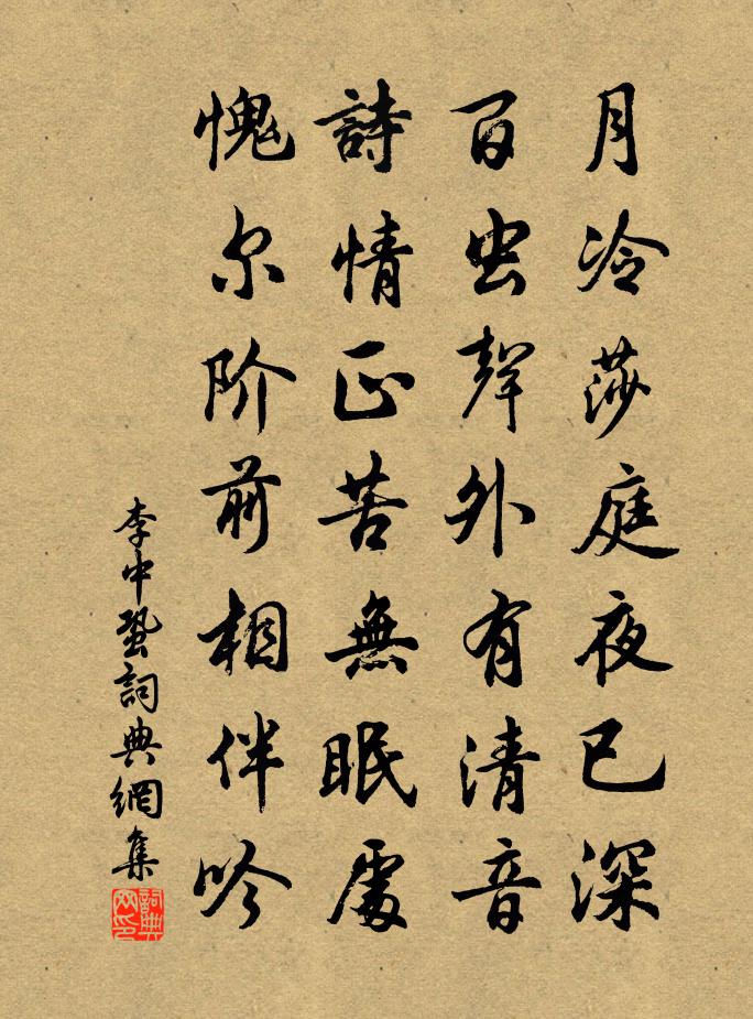 詩詞名句歷史字典書法欣賞書法字典國語詞典說文解字康熙字典古漢語字典標 題 作 者 詩 句 蛩作者:李中 朝代:唐代蛩原文月冷莎庭夜已深,百蟲聲外有清音。詩情正苦無眠處,愧爾階前相伴吟。詩詞問答問:蛩的作者是誰?答:李中問:蛩寫於哪個朝代?答:唐代問:蛩是什麼體裁?答:七絕李中蛩書法欣賞蛩書法作品注釋全唐詩:卷749-44詩詞推薦覽鏡陸游〔宋代〕鏡中老翁誰?非得少年我。誦書如布穀,拈出無一可。又非富貴逼,棄去自不果。無功博一飽,有罪當萬坐。老境望海潮 真空王吉昌〔元代〕真空根蒂,全憑神息,分開五蘊精華。和暢六神,氤氳三島,天河浪泛靈槎。乾鼎煮丹砂。正雲駕坤牛,風送羊車再次贈張學錄韻十詩陳造〔宋代〕李蔡下中爾,萬目指騫騰。何蕃頭欲白,秋窗耿青燈。次吳氏女子韻王安石〔宋代〕孫陵西曲岸烏紗,知汝淒涼正憶家。人世豈能無聚散,亦逢佳節且吹花。寄進士熊退齋李謹思〔宋代〕猶存火後書,罕識卷中字。無筆補玄經,有金酬載記。漫漫歲月馳,忽忽春秋閟。欲辨已忘言,涕淚空垂泗。殉義好事近樓采〔宋代〕人去玉屏間,逗曉柳絲風急。簾外杏花細雨,罥春紅愁濕。單衣初試麴塵羅,中酒病無力。應是繡床慵困,倚鞦韆東坡畫竹贊黃庭堅〔宋代〕孤生危苦,播盪風雨。歲不我與,誓將尋斧。刳心達節,萬籟中發。黃鍾同律,偉哉造物。門徑釋善珍〔宋代〕門徑莓苔古意深,閉門懶復事參尋。棋圖靜見孫吳法,樵唱真聞韶濩音。米盡有方烹白石,丹靈無意化黃金。花飛閒居十首陳造〔宋代〕桃李爭先不待催,梅花轉首已青苔。即今蜀種胭脂樹,壓倒群芳尚懶開。和程泰之閣學泛舟南溪遇雪韻三首袁說友〔宋代〕目斷山前浮玉,春回雪裡宜城。得意扁舟乘興,歸來好語增明。【正宮】鸚鵡曲馮子振〔元代〕序云:白無咎有〔鸚鵡曲〕云:儂家鸚鵡洲邊住,是個不識字漁父。浪花中一葉扁舟,睡煞江南煙雨句謝鳳〔宋代〕兩袖清風蓬島路,一襟明月海天秋。上荊公生辰陳輔〔宋代〕十月江南已得霜,相君門客小山房。冬深柏子和香掃,準備生辰作好香。賦是霍將軍辭第徐鉉〔唐代〕漢將承恩久,圖勛肯雇私。匈奴猶未滅,安用以家為。郢匠雖聞詔,衡門竟不移。寧煩張老頌,無待晏嬰辭。甲乙次子中兄韻三首周必大〔宋代〕黃道初開日月新,容光應不間孤臣。左螭立近焚香案,右掖名參視草人。三聖深恩空刺骨,幾年歸夢已通神。阿兄君馬黃李白〔唐代〕君馬黃,我馬白。馬色雖不同,人心本無隔。共作遊冶盤,雙行洛陽陌。長劍既照曜,高冠何赩赫。各有千金裘,補史十忠詩知潭州湖南安撫使李公芾劉壎〔宋代〕三已甘退休,十連起遲暮。伊誰急求子,流落乃不怒。黑雲來如山,殺氣震平楚。恭惟君父命,封疆以身護。闔門聞子京拜掃後周視田廬因問有可為歸計者二首宋庠〔宋代〕韓邑西南上故原,春林幾處駐行軒。何妨豫卜歸休地,從古三公亦灌園。施君作詩贈謙師亦求拙句乃作五十六字綴其後鄭獬〔宋代〕聞道天台謙上人,溪魚野鳥共忘形。林間無事結跏坐,石上更安圓覺經。定處只應山鬼護,講時還有海龍聽。何年頌古二十七首釋雲賁〔宋代〕指點深紅與昔同,更無夭艷在芳叢。南泉笑里移春去,留得殘紅醉密蜂。名句推薦雨窗和淚搖湘管。意長箋短。許棐《後庭花·一春不識西湖面》 飛鳥沒何處,青山空向人。劉長卿《餞別王十一南遊》 無論作何等人,總不可有勢利氣王永彬《圍爐夜話·第三五則》 野戰格鬥死,敗馬號鳴向天悲。李白《戰城南》 請君試問東流水,別意與之誰短長。李白《金陵酒肆留別》 願春暫留,春歸如過翼。周邦彥《六醜·落花》 秋色冷並刀,一派酸風卷怒濤。陳維崧《南鄉子·邢州道上作》 近水知魚性,近山識鳥音。佚名《增廣賢文·上集》 忘身辭鳳闕,報國取龍庭。王維《送趙都督赴代州得青字》 寧為太平犬,莫作亂離人!馮夢龍《醒世恆言·卷三》