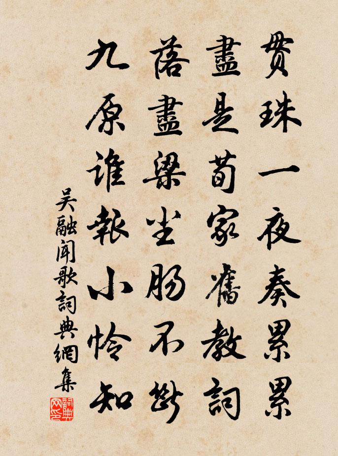 詩詞名句歷史字典書法欣賞書法字典國語詞典說文解字康熙字典古漢語字典標 題 作 者 詩 句 聞歌作者:吳融 朝代:唐代聞歌原文貫珠一夜奏累累,儘是荀家舊教詞。落盡梁塵腸不斷,九原誰報小憐知。詩詞問答問:聞歌的作者是誰?答:吳融問:聞歌寫於哪個朝代?答:唐代問:聞歌是什麼體裁?答:七絕吳融聞歌書法欣賞聞歌書法作品注釋全唐詩:卷686-11詩詞推薦丞相張公築室湘江之上若欲遠人間事盡心於山李彌遜〔宋代〕蕙櫋蘭橑濕青紅,衡岳湘江一望通。曉日雲煙隨几杖,春風花草近房櫳。赤松未結忘機伴,綠野聊從避俗翁。更欲仙岩行白玉蟾〔宋代〕醉攜七尺霜前行,雲錦山前灣幾曲。溪頭秋雨添寒綠,蛟龍冷浸一壺玉。蓼花錦岸紅欲流,稻田高下鋪棋局。碧岩憶昔陸游〔宋代〕憶昔輕裝萬里行,水郵山驛不論程。屢經漢帝燒余棧,曾宿唐家雪外城。壯志可憐成昨夢,殘年惟有事春耕。西窗中秋登樓望月米芾〔宋代〕目窮淮海滿如銀,萬道虹光育蚌珍。天上若無修月戶,桂枝撐損向西輪。和子瞻玉盤盂二首蘇轍〔宋代〕千葉團團一尺余,揚州絕品舊應無。賞傳莒國遷鍾虡,移憶胡僧置缽盂。叢底留連傾鑿落,瓶中捧擁照浮屠。強將寶閣尚書凌公輓詩虞儔〔宋代〕新學輕餘子,忠懷策萬言。治安猶涕泣,師友故淵源。日曳尚書履,風生刺史轓。漢庭誰第一,殊未遜公孫。素梅 十三王冕〔元代〕昨夜朔風吹倒人,梅花枝上十分春。老夫高臥石窗下,嬴得清香入夢頻。驀山溪 贈文登縣駱守清王哲〔元代〕守清花守淨。各花各開明花。兩兩做修持,你個個、心頭修省。虛虛實實,里花取炎涼,尋自在,覓逍遙,漸漸歸殿前生桂樹文同〔宋代〕童童彼芳桂,藹藹生廣內。靈根浹和液,柯葉冬不改。日月最臨照,雨露偏汪{左氵右歲}。願保剛勁質,與君同送陳寺丞守延平劉克莊〔宋代〕詔免延英對,輕裝見吏民。極知忙捄埋,豈是急頒春。邑為搜空壞,州因獻羨貧。此行休戚擊,未敢賀朱輸。初晴陸游〔宋代〕袖手東窗初日明,殘編未負老書生。不勝多病畏寒雨,正得一霜方快晴。客戶餉羹提赤鯉,鄰家借碓搗新粳。柴荊浣溪沙 次韻禮院孟子周僉院秋夜曲二疊虞集〔元代〕天闊秋高 * 長。浮塵消盡霧蒼茫。澄澄孤月轉危牆。金井有聲惟墜露,玉階無色乍疑霜。不聞人語只吟*。鑿磨嶺趙蕃〔宋代〕復嶺重岡向背迷,瘦筇深與病夫宜。早禾未割尤艱食,過午人家猶未炊。歲盡二首司空圖〔唐代〕明日添一歲,端憂奈爾何。沖寒出洞口,猶校夕陽多。莫話傷心事,投春滿鬢霜。殷勤共尊酒,今歲只殘陽。江上楓成彥雄〔唐代〕江楓自蓊鬱,不競松筠力。一葉落漁家,殘陽帶秋色。寄懷二十首趙蕃〔宋代〕楝樹層層細著花,日薰香暖蜜蜂衛。富來儻有論文興,活火風爐自煮茶。利交仇遠〔宋代〕一自儀秦去,從衡直到今。士級貧失節,交以利知心。乍可昏求火,何堪晝見金。狂瀾回已倒,獨幸有山林。即事陸游〔宋代〕還鄉吳語熟,伏枕越吟悲。接客寒溫簡,過鄰几杖隨。獨嗟親舊少,不覺歲時移。陌上人爭看,風欹白接籬。次韻國博九日強至〔宋代〕秋光未老已風酸,還似春來料峭寒。酒盞莫辭今日醉,人心況是在時歡。佳辰從古逾金重,遠岫登高見黛攢。且學和郡侯勸駕韻姚勉〔宋代〕睎顏欲進聖門科,何意嫦娥剪綠羅。拾紫不知如芥易,一紅也覺占春多。興賢藉此雙旌重,得士歡於五袴歌。九萬名句推薦錦帶吳鉤,征思橫雁水。吳文英《荔枝香近·送人游南徐》 瀑布風前千尺影,疑瀉銀河一派。朱栴《念奴嬌·雪霽夜月中登樓望賀蘭山作》 池上憑闌愁無侶。奈此個、單棲情緒。柳永《甘草子·秋暮》 十五入漢宮,花顏笑春紅。李白《怨歌行》 嘆息此人去,蕭條徐泗空李白《經下邳圯橋懷張子房》 青苔滿地初晴後,綠樹無人晝夢余。劉攽《新晴·青苔滿地初晴後》 夜來風雨聲,花落知多少。孟浩然《春曉》 靡不有初,鮮克有終。佚名《盪》 昨夜狂風度,吹折江頭樹李白《長干行二首》 美之所在,雖污辱,世不能賤;惡之所在,雖高隆,世不能貴。劉安及其門客《淮南子·說山訓》