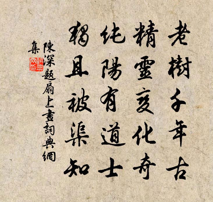 詩詞名句歷史字典書法欣賞書法字典國語詞典說文解字康熙字典古漢語字典標 題 作 者 詩 句 題扇上畫作者:陳深 朝代:宋代題扇上畫原文老樹千年古,精靈變化奇。純陽有道士,獨且被渠知。詩詞問答問:題扇上畫的作者是誰?答:陳深問:題扇上畫寫於哪個朝代?答:宋代陳深題扇上畫書法欣賞題扇上畫書法作品詩詞推薦河之水二首寄子侄老成韓愈〔唐代〕河之水,去悠悠。我不如,水東流。我有孤侄在海陬,三年不見兮使我生憂。日復日,夜復夜。三年不見汝,使我御閣端午帖子夏竦〔宋代〕五色彩絲初獻壽,九重嘉氣頌長生。庇民精意方虔鞏,垂拱仁風更穆清。新晴書事上知府宋諫議魏野〔宋代〕美化何因見,民歌處處同。雨申諸縣足,獄奏半年空。郡閣煙光里,人家霽色中。偶吟知淺拙,將獻愧明公。宿石橋聞水聲韓元吉〔宋代〕野橋曲折渡千回,古寺懸知水面開。一夜寒聲喧客枕,卻疑風雨轉山來。讀正觀政要楊萬里〔宋代〕拔士新豐逆旅中,懷賢鴨綠水波東。酒頃一斗鳶肩客,醋設三杯羊鼻公。浣溪沙向子諲〔宋代〕為姑蘇郡守,浩然有歸志,因廣其聲為浣溪沙,示姑蘇諸友樂在煙波釣是閒。草堂松桂已勝攀。梢梢新月幾回彎。春夜雪再用韻十首楊公遠〔宋代〕仙禽灑羽半天飛,疑是歸來老令威。妝點江鄉堪入畫,漁翁披得滿衰衣。好事近(再和)趙鼎〔宋代〕煙霧鎖青冥,直上九關一息。姑射有人相挽,瑩肌膚冰雪。騎鯨卻下大荒來,天風亂吹髮。慨念故人非是,漫塵埃三蕭行賀蕭丞定夫子登科傅西齋〔宋代〕吾鄉前輩多風誼,教子讀書全盛事。劉斯立在慶曆間,二子同升俱上第。後來嘉佑孔長源,三子聯登相後先。一家一念陳起〔宋代〕一念無塵雜,三更有夢回。同他石橋老,過水探寒梅。徐步杜甫〔唐代〕整履步青蕪,荒庭日欲晡。芹泥隨燕觜,花蕊上蜂須。把酒從衣濕,吟詩信杖扶。敢論才見忌,實有醉如愚。獻主司孟賓於〔唐代〕那堪雨後更聞蟬,溪隔重湖路七千。憶昔故園楊柳岸,全家送上渡頭船。正月九日有美堂飲醉歸徑睡五鼓方醒不復能眠蘇軾〔宋代〕之眾人事紛擾,志士獨悄悄。何異琵琶弦,常遭腰鼓鬧。三杯忘萬慮,醒後還皎皎。有如轆轤索,已脫重縈繞。家出疆次副使準陰舟行王之望〔宋代〕丁年慕請纓,白首翻攘袂。輶軒遽憑軾,魏闕頻回睇。兩淮經戰爭,萬物皆惟悴。雲繁雪霰舞,風猛波濤沸。椎凌奉和皇帝上禮撫事述懷應制陳子昂〔唐代〕大君忘自我,應運居紫宸。揖讓期明辟,謳歌且順人。軒宮帝圖盛,皇極禮容申。南面朝萬國,東堂會百神。雲陛次韻開府太師留別諸公蘇頌〔宋代〕經濟才謨沛有餘,幡然高謝意何如。 * 盡尋歸鞅,綠野堂成憶舊廬。漢苑宴遊聯魏丙,鄴都賓客記應徐。他時寓嘆陸游〔宋代〕久矣門無客,高齋獨掩扉。敢言消壯志,要是息危機。清露夜自滴,孤雲寒不歸。晨炊勿關念,更典篋中衣。題李氏敬聚堂家鉉翁〔宋代〕人言爾祖玉蘊石,傳到兒孫藍出青。眼底桐枝多秀色,早令授業各專經。送李將軍(一作送開府侄隨故李使君旅親卻赴上都)劉長卿〔唐代〕征西諸將一如君,報德誰能不顧勛。身逐塞鴻來萬里,手披荒草看孤墳。擒生絕漠經胡雪,懷舊長沙哭楚雲。歸去春日田園雜興劉汝鈞〔宋代〕年來夢斷百花場,安分農桑萬慮降。為喜麥青行暖逕,因看蠶出倚晴窗。草坪閒見烏犍點,畲水飛來白鷺雙。滿飲名句推薦篳路藍縷,以啟山林。左丘明《左傳·宣公·宣公十二年》 空床臥聽南窗雨,誰復挑燈夜補衣。賀鑄《半死桐·重過閶門萬事非》 朝見馬嶺黃沙合,夕望龍城陣雲起。盧思道《從軍行》 紫陌紅塵拂面來,無人不道看花回。劉禹錫《元和十年自朗州至京戲贈看花諸君子 / 玄都觀桃花》 繞池閒步看魚游,正值兒童弄釣舟。白居易《觀游魚》 牛靿咤咤,田確確,旱塊敲牛蹄趵趵。元稹《田家詞 / 田家行》 禹廟空山里,秋風落日斜。杜甫《禹廟》 今春看又過,何日是歸年。杜甫《絕句二首》 夢回人遠許多愁,只在梨花風雨處。辛棄疾《玉樓春·風前欲勸春光住》 勿言草卉賤,幸宅天池中沈約《詠新荷應詔》