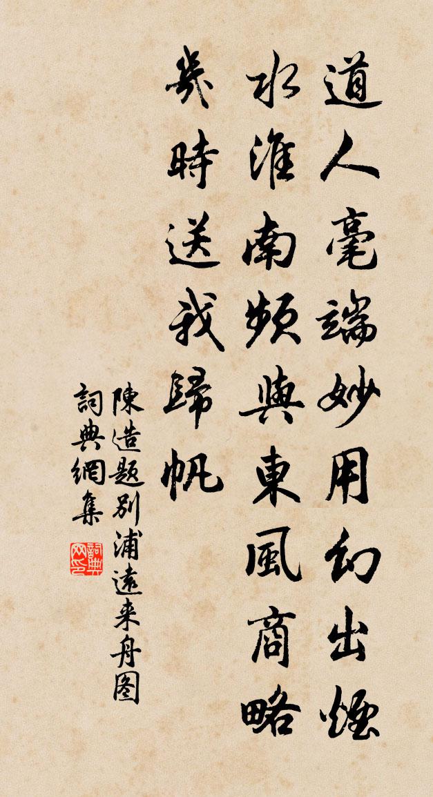 詩詞名句歷史字典書法欣賞書法字典國語詞典說文解字康熙字典古漢語字典標 題 作 者 詩 句 題別浦遠來舟圖作者:陳造 朝代:宋代題別浦遠來舟圖原文道人毫端妙用,幻出煙水淮南。頻與東風商略,幾時送我歸帆。詩詞問答問:題別浦遠來舟圖的作者是誰?答:陳造問:題別浦遠來舟圖寫於哪個朝代?答:宋代陳造題別浦遠來舟圖書法欣賞題別浦遠來舟圖書法作品詩詞推薦古釵嘆張籍〔唐代〕古釵墮井無顏色,百尺泥中今復得。鳳凰宛轉有古儀,欲為首飾不稱時。女伴傳看不知主,羅袖拂拭生光輝。蘭膏水調歌頭 和馬叔度游月波樓辛棄疾〔宋代〕客子久不到,好景為君留。西樓著意吟賞,何必問更籌?喚起一天明月,照我滿懷冰雪,浩蕩百川流。鯨飲未吞海淳化鄉飲酒三十三章佚名〔宋代〕崇丘峨峨,動植斯屢。高既自遂,大亦自足。和風斯扇,膏雨斯沐。我仁如天,以亭以育。岩花張舜民〔宋代〕托根何太遠,得地亦相宜。土石生為偶,紅香想自知。風英將片片,雨實漸離離。戍客思攀折,無何歷處危。李花二首董嗣杲〔宋代〕宜繁宜遠九標新,花露能仙雨點頻。傳姓老聃因指樹,過門方朔驗呼人。葦綃縞月明偷夜,練帨當風靜撚春。實薦頌古五十七首釋道昌〔宋代〕高揖釋迦,不拜彌勒,吃棒趁出猶費力,滴水冰生知未知,拋磚引玉有人識。子規潘牥〔宋代〕一聲啼破萬山雲,我正思歸自喜聞。莫向貴人庭樹下,王孫金彈不饒君。即事呈斯遠三首趙蕃〔宋代〕去卻蔫花意轉新,是知疏密總宜人。正由穢去清虛集,不礙蕭然冠與巾。奉酬襲美先輩吳中苦雨一百韻陸龜蒙〔唐代〕微生參最靈,天與意緒拙。人皆機巧求,百徑無一達。家為唐臣來,奕世唯稷卨。只垂青白風,凜凜自貽厥。猶殘景龍四年春祠海宋之問〔唐代〕肅事祠春溟,宵齋洗蒙慮。雞鳴見日出,鷺下驚濤鶩。地闊八荒近,天回百川澍。筵端接空曲,目外唯雰霧。暖氣寄陳居士曹勛〔宋代〕君住西山我住東,杖藜時復得相從。欣欣未見飄飄舉,楚楚先經面面松。仙事既無妻子累,丹爐自有鬼神供。來春恭和家大人將赴季弟官書示及門之作孫應求〔宋代〕少年不學待何年,長大無成莫怨天。況是各隨賢父訓,豈容弗肯播菑田。滿江紅(懷家山作)毛並〔宋代〕回首吾廬,思歸去、石溪樵谷。臨玩有、門前流水,亂松疏竹。幽草春餘荒井逕,鳴禽日在窺牆屋。但等閒、憑几春暮張耒〔宋代〕春盡空餘白日長,枝頭青杏已堪嘗。人閒簾幕燕相語,風暖園林柳半黃。病里不知時節換,老來都減少年狂。殘風浣花亭沈清臣〔宋代〕亭近城隈瞰古塘,數行官柳間群芳。沿堤草色連雲色,隔岸山光映水光。竹影日篩華徑邃,桂花風暢畫橋香。他年和文山先生何夢桂〔宋代〕坐對煙煤冷麝臍,一窗風雨懶幽棲。蠶業國破鵑啼血,王謝堂空燕落泥。華表有時歸老鶴,桃都何處聽天雞。十年和聶之美雞澤官舍詩七首柳司馬光〔宋代〕驛道苦車馬,田廬悲斧斤。誰栽官舍前,老朽完天夫。所願明府心,庇村如庇人。盧秀才南台賈島〔唐代〕居在青門裡,台當千萬岑。下因岡助勢,上有樹交陰。陵遠根才近,空長畔可尋。新晴登嘯處,驚起宿枝禽。吊黃學士三首歐陽修〔宋代〕自古蘭衰早,因令蕙嘆深。書遺茂陵◇,病作越鄉吟。蒿里無春色,閩山蔽夕陰。空嗟埋玉樹,◇志永沉沉。百字令 贈彈一弦子張文秀張可久〔元代〕一行琴秋思,記琴孫登當日,山中琴趣。誰識吾宗,父老子、自製寸金皮鼓。*截孤篁,絲抽獨繭,替盡琵琶譜。名句推薦八月湖水平,涵虛混太清孟浩然《望洞庭湖贈張丞相/臨洞庭湖贈張丞相》 落月滿屋樑,猶疑照顏色。杜甫《夢李白二首·其一》 微風搖紫葉,輕露拂朱房。沈約《詠芙蓉》 四顧山光接水光,憑欄十里芰荷香。黃庭堅《鄂州南樓書事》 大直若屈,大巧若拙,大辯若訥。老子《老子·德經·第四十五章》 小樓昨夜又東風,故國不堪回首月明中。李煜《虞美人·春花秋月何時了》 斜陽外,寒鴉萬點,流水繞孤村。秦觀《滿庭芳·山抹微雲》 采菱人語隔秋煙,波靜如橫練。王惲《平湖樂·采菱人語隔秋煙》 洛陽城東西,長作經時別。范雲《別詩》 時見幽人獨往來,縹緲孤鴻影。蘇軾《卜運算元·黃州定慧院寓居作》