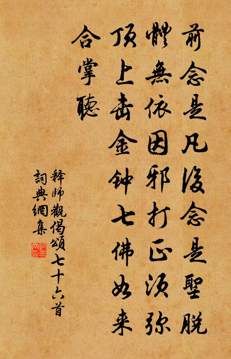詩詞名句歷史字典書法欣賞書法字典國語詞典說文解字康熙字典古漢語字典標 題 作 者 詩 句 偈頌七十六首作者:釋師觀 朝代:宋代偈頌七十六首原文前念是凡,後念是聖。脫體無依,因邪打正。須彌頂上擊金鐘,七佛如來合掌聽。詩詞問答問:偈頌七十六首的作者是誰?答:釋師觀問:偈頌七十六首寫於哪個朝代?答:宋代釋師觀偈頌七十六首書法欣賞偈頌七十六首書法作品詩詞推薦贈葆元白玉蟾〔宋代〕棄儒為見儒多誤,學道緣吾道化賢。且把功名權架閣,抱琴隨我去修仙。詠史上賈生陳普〔宋代〕衣綈英主首祠汾,他日燕齊盡羨門。玉漏聲中聞底事,反將前席待新垣。青渠追和宋金都壁間韻洪咨夔〔宋代〕汗青孰與老黃間,能為君王把蜀山。懊惱秋風吹客鬢,一年三過劍門關。和張乖崖太學生〔宋代〕四窗滅盡讀書燈,窗外唯聞步鐸聲。辜負江山好明月,閒來此地趁虛名。偶題鄭剛中〔宋代〕軒前有修竹,穿紙入窗欞。清風動搖之,壁間影縱橫。軒後有修竹,山花依以生。幽芳吐孤艷,不與翠色爭。愚翁流所贈張錫章玄同〔唐代〕黃葉因風下,甘從洛浦隈。白云何所為,還出帝鄉來。冬日王安石〔宋代〕擾擾今非昔,漫漫夜復晨。風沙不貸客,雲日欲迷人。散發愁邊老,開顏醉後春。轉思江海上,一洗白綸巾。詠史詩綿山胡曾〔唐代〕親在要君召不來,亂山重疊使空回。如何堅執尤人意,甘向岩前作死灰。題女道士居(不餌芝朮四十餘年)秦系〔唐代〕不餌住雲溪,休丹罷藥畦。杏花虛結子,石髓任成泥。掃地青牛臥,栽松白鶴棲。共知仙女麗,莫是阮郎妻。奉寄別馬巴州(時甫除京兆功曹在東川)杜甫〔唐代〕勳業終歸馬伏波,功曹非復漢蕭何。扁舟系纜沙邊久,南國浮雲水上多。獨把魚竿終遠去,難隨鳥翼一相過。知君曾伯貢主簿輓詩二首楊萬里〔宋代〕練練蘭溪秀,家家玉樹榮。興安有才子,艮老是先生。師與三冬學,詩專五字城。一官繒祭灶,作麽便銘旌。丙辰年別龜峰曹源和尚釋道沖〔宋代〕葛溪深處定宗綱,一任乾坤大地荒。但得棒頭明似日,可無臨濟解承當。王秘監令人輓詩葉適〔宋代〕頗憶朝除禫,俄驚夜徹帷。自堪從子住,何用與夫歸。起隧新藤茁,重轝宿菵排。通家只今盡,老淚逐風揮。水調歌頭(江東漕使兄高瞻叔生日端平丙申五月)魏了翁〔宋代〕堪怪兩外府,使傳載朝纓。雖雲身在江表,都號漢公卿。莫是才堪世用,莫是有人吹送,中外爾聯榮。天運自訊息舊居韋莊〔唐代〕芳草又芳草,故人楊子家。青雲容易散,白日等閒斜。皓質留殘雪,香魂逐斷霞。不知何處笛,一夜叫梅花。均州南川春日三首張舜民〔宋代〕宦名生事日悠悠,問道參禪已的頭。自笑攀緣猶未斷,每逢佳處即遲留。舟中蘇泂〔宋代〕小睡醒來欲二更,村深那聽鼓鐘聲。舟中反覆無窮事,只道寒天不會明。假山蘇軾〔宋代〕安石作假山,其中多詭怪。雖然知是假,爭奈主人愛。小桃紅/連理枝程垓〔宋代〕不恨殘花妥。不恨殘春破。只恨流光,一年一度,又催新火。縱 * 系長繩,也留春得麽。花院重教鎖。春事參政謝公輓詞黃定〔宋代〕一自參機政,居然重本兵。尤優文與武,謚重敏兼榮。行矣躋三府,天乎夢兩楹。鄱陽當日讖,端的付唐生。名句推薦林花謝了春紅,太匆匆。無奈朝來寒雨晚來風。李煜《相見歡·林花謝了春紅》 貧賤之知不可忘,糟糠之妻不下堂。范曄《後漢書·列傳·伏侯宋蔡馮趙牟韋列傳》 雨里雞鳴一兩家,竹溪村路板橋斜。王建《雨過山村》 寧可信其有,不可信其無。佚名《增廣賢文·上集》 草枯鷹眼疾,雪盡馬蹄輕。王維《觀獵》 待到黃昏月上時,依舊柔腸斷。程垓《卜運算元·獨自上層樓》 往者不可諫,來者猶可追。孔子弟子《論語·微子篇》 君有妒臣,則賢人不至。荀子《荀子·大略》 春風一夜吹鄉夢,又逐春風到洛城。武元衡《春興》 教也者,長善而救其失者也。戴聖《禮記·學記》
