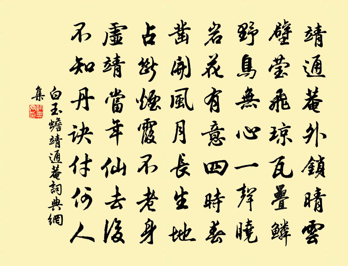 詩詞名句歷史字典書法欣賞書法字典國語詞典說文解字康熙字典古漢語字典標 題 作 者 詩 句 靖通菴作者:白玉蟾 朝代:宋代靖通菴原文靖通菴外鎖晴雲,壁瑩飛瓊瓦疊鱗。野鳥無心一聲曉,岩花有意四時春。鑿開風月長生地,占斷煙霞不老身。虛靖當年仙去後,不知丹訣付何人。詩詞問答問:靖通菴的作者是誰?答:白玉蟾問:靖通菴寫於哪個朝代?答:宋代問:靖通菴是什麼體裁?答:七律白玉蟾靖通菴書法欣賞靖通菴書法作品詩詞推薦虎丘惠長老請贊釋心月〔宋代〕萬里晴空,一聲霹靂。盡大地人,掩耳不及。浩浩清風生八極。賀新郎·別茂嘉十二弟辛棄疾〔宋代〕別茂嘉十二弟。鵜鴂、杜鵑實兩種,見《離騷補註》綠樹聽鵜鴂。更那堪、鷓鴣聲住,杜鵑聲切。啼到春歸無尋處哭公素司馬光〔宋代〕負書游上國,拾芥取榮名。雅度津涯闊,高文風雨驚。忘懷翻得謗,縱酒遂傷生。忍使泉台客,悁悁不自明。丹旌次韻慎思貽無咎文潛誦詩蔡肇〔宋代〕臥聽高齋落葉風,清詩交詠想晨鐘。故人厚意論千載,正始遺音僅一逢。膠漆初期在俄頃,雲龍莫恨不相從。芸房和黃雲甫韻陳普〔宋代〕志欲鑽研探三原,聖言爭奈遠如天。爬沙愧我遲而鈍,穿石輸君敏且專。方識立身須廣大,也知去道每輕儇。若將倚江亭會上虞伯逵送梅花並二絕句坐上次韻並王之望〔宋代〕喜見江梅又著花,插來不怕帽檐斜。高標幽韻誰真似,人在風流賀監家。不出門白居易〔唐代〕彌月不出門,永日無來賓。食飽更拂床,睡覺一嚬伸。輕箑白鳥羽,新簟青箭筠。方寸方丈室,空然兩無塵。披衣贈演說人釋慧遠〔宋代〕西湖演士妙天機,舌轉風雷口角飛。奪騎未聞沙寒冷,斬關先覺陣雲低。前賢后聖從君數,水遠山長我自知。皓首夜別韋司士高適〔唐代〕高館張燈酒復清,夜鍾殘月雁歸聲。只言啼鳥堪求侶,無那春風欲送行。黃河曲里沙為岸,白馬津邊柳向城。莫怨喜晴衛宗武〔宋代〕披霧出松關,行行破曉寒。崎嶇忽平坦,迤邐復巑屼。霜沐林光沃,山圍野色寬。朝曦開霽景,鳴鳥亦聲懽。同楊仲禮和袁集賢上都詩柳貫〔元代〕幄殿層雲障,轅門積雪峰。奇鷹皆戴角,御馬盡飛龍。瀚海將臨幸,雲亭望陟封。青丘大羽獵,有事待玄冬。江如練/蝶戀花賀鑄〔宋代〕睡鴨鱸寒熏麝煎。寂寂歌梁,無計留歸燕。十二曲闌閒倚遍。一杯長待何人勸。不識當年桃葉面。吟詠佳詞,想像李士元學士守臨邛日有谷一莖九穟者數本芝數梅堯臣〔宋代〕臨邛傳瑞物,太守在郡時。既多九穟谷,復有三秀芝。芝以保萬壽,谷以豐東菑。更看芙容葉,並蒂照清池。病中數會張道士見譏以此答之白居易〔唐代〕亦知數出妨將息,不可端居守寂寥。病即藥窗眠盡日,興來酒席坐通宵。賢人易狎須勤飲,奼女難禁莫謾燒。張道偈頌四十一首釋普寧〔宋代〕一塵入正定,諸塵三昧起。諸塵入正定,一塵三昧起。三昧與正受,土塊泥里洗。咦,白日堂堂眼見鬼。非不非,矮齋雜詠二十首春思華岳〔宋代〕東風吹恨入青樓,滿目春容總是愁。楊柳織成絲萬縷,憑誰裁作翠茸裘。滿江紅(丁未初度自賦)李曾伯〔宋代〕老去生涯,都付與、一丘一壑。功名事,慚非好手,幾逢危著。走馬鬥雞年少趣,椎牛釃酒軍中樂。到而今、渾似夏日陸游〔宋代〕山下柴荊晝不開,苔生古井暗楸槐。新詩喔罷閒無事,移取藤床睡去來。觀李湊所畫美人障子劉長卿〔唐代〕愛爾含天姿,丹青有殊智。無間已得象,象外更生意。西子不可見,千載無重還。空令浣沙態,猶在含毫間。一笑風入松張炎〔宋代〕一春不是不尋春。終是不忺人。好懷漸向中年減,對歌鐘、渾沒心情。短帽怕黏飛絮,輕衫壓撲游塵。暖香十里軟名句推薦山下蘭芽短浸溪,松間沙路淨無泥。瀟瀟暮雨子規啼。蘇軾《浣溪沙·游蘄水清泉寺》 不成便沒相逢日,重整釵鸞箏雁。張翥《陌上花·有懷》 雙槳來時,有人似、舊曲桃根桃葉。姜夔《琵琶仙·雙槳來時》 觀書老眼明如鏡,論事驚人膽滿軀辛棄疾《送湖南部曲》 巧笑東鄰女伴,採桑徑里逢迎。晏殊《破陣子·春景》 傷心千里江南,怨曲重招,斷魂在否?吳文英《鶯啼序·春晚感懷》 玉容寂寞淚闌乾,梨花一枝春帶雨。白居易《長恨歌》 今又重陽,戰地黃花分外香。 * 《採桑子·重陽》 薊城通漠北,萬里別吾鄉。李頎《古塞下曲》 天生我材必有用,千金散盡還復來。李白《將進酒》