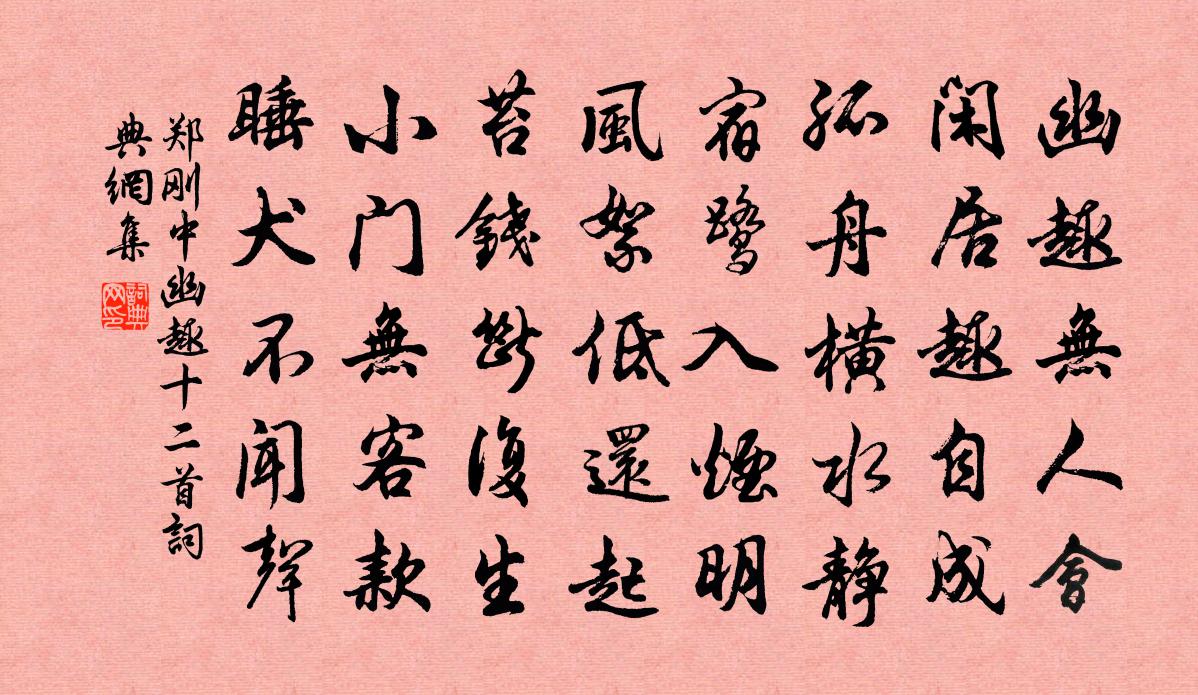 詩詞名句歷史字典書法欣賞書法字典國語詞典說文解字康熙字典古漢語字典標 題 作 者 詩 句 幽趣十二首作者:鄭剛中 朝代:宋代幽趣十二首原文幽趣無人會,閒居趣自成。孤舟橫水靜,宿鷺入煙明。風絮低還起,苔錢斷復生。小門無客款,睡犬不聞聲。詩詞問答問:幽趣十二首的作者是誰?答:鄭剛中問:幽趣十二首寫於哪個朝代?答:宋代鄭剛中幽趣十二首書法欣賞幽趣十二首書法作品詩詞推薦韓季默主簿聽雨齋葛紹體〔宋代〕一片雲陰帶日長,落花飛處燕泥香。耕畦桑塢年年事,萬點春聲夜對床。舟中雨作趙蕃〔宋代〕旱而逢小雨,月亦當季秋。便覺重陽近,還成一舸游。關余荒徑菊,愧爾沒波鷗。詩就雲如卷,推篷得縱求。絕纓歌李頎〔唐代〕楚王宴客章華台,章華美人善歌舞。玉顏艷艷空相向,滿堂目成不得語。紅燭滅,芳酒闌,羅衣半醉春夜寒,絕纓留別米雍丘二首之一賀鑄〔宋代〕明釭通夜語,累塊寫胸中。水癖推劉令,書名浼魯公。忌猜悲廩鼠,逐熱賤雲鴻。不乏佳山水,東南著兩翁。寄懷玉胡仲弓〔宋代〕別去未多時,征塵又滿衣。居時閽屢叩,避俗手頻揮。病有詩堪療,貧無家可歸。半生湖海上,莫忘北山薇。送志彌師往淮南皇甫冉〔唐代〕已能持律藏,復去禮禪亭。長老偏摩頂,時流尚誦經。獨行寒野曠,旅宿遠山青。眷屬空相望,鴻飛已杳冥。一百五歌張耒〔宋代〕山民歲時事莽鹵,猶知拜掃一百五。平明士女出城闉,黃土岡前列尊俎。箬包粉餌蒸野蔬,富家烹羊貧薦魚。日暮病中即事艾性夫〔宋代〕支身惟首健,隨事與心違。病久藥為飯,寒深火是衣。矮窗看日度,遠夢傍雲飛。可比梅花瘦,呼童試折歸。冬日峽中旅泊劉言史〔唐代〕霜月明明雪復殘,孤舟夜泊使君灘。一聲鍾出遠山里,暗想雪窗僧起寒。思歸八絕胡寅〔宋代〕傳家素業祗圖書,永日沉涵樂有餘。方信此心無所著,山林鐘鼎一蘧廬。同盧明府早秋宴張郎中海亭孟浩然〔唐代〕側聽弦歌宰,文書游夏徒。故園欣賞竹,為邑幸來蘇。華省曾聯事,仙舟復與俱。欲知臨泛久,荷露漸成珠。成都遨樂詩二十一首二日出城田況〔宋代〕初歲二之日,言出東城闉。緹騎隘重乳,淤車坌行塵。原野信滋腴,景物爭光新。青疇隱遙壩,弱柳垂芳津。隱卒青玉案吳潛〔宋代〕十年三過蘇台路。還又是、匆匆去。迅景流光容易度。鷺洲鷗渚,葦汀蘆岸,總是消魂處。蒼煙欲合斜陽暮。付與送王校書往清源徐夤〔唐代〕南國賢侯待德風,長途仍借九花驄。清歌早貫驪龍頷,丹桂曾攀玉兔宮。楊柳堤邊梅雨熟,鷓鴣聲里麥田空。吟詩蒙訓楊簡〔宋代〕父母生子身,身是父母個。如何卻言我,言我大不可。父母在此坐,子則不敢坐。不坐乃當然,父母如天大。男兒詠雪贈張籍韓愈〔唐代〕只見縱橫落,寧知遠近來。飄颻還自弄,歷亂竟誰催。座暖銷那怪,池清失可猜。坳中初蓋底,垤處遂成堆。慢有酬樂天得微之詩知通州事因成四首元稹〔唐代〕茅檐屋舍竹籬州,虎怕偏蹄蛇兩頭。暗蠱有時迷酒影,浮塵向日似波流。沙含水弩多傷骨,田仰畬刀少用牛。知得金縷曲 送茅山道人,並寄山中諸道友張之翰〔元代〕回首茅山路。渺滔滔、長江南畔,碧山無數。曾被天風吹醉夢,直到華陽深處。也親見、鸞驂鶴馭。覺後分明空記和渙之深秋月夜書事狄遵度〔宋代〕洞庭葉下涼颼颼,凍天頑白凝不流。圓月擬缺不忍缺,輕露欲浮終未浮。憶吹朱籟鳳軿上,更采紫芝雲嶠陬。玉樓八駿圖杜荀鶴〔唐代〕丹雘傳真未得真,那知筋骨與精神。只今恃駿憑毛色,綠耳驊騮賺 * 。名句推薦官不得其才,比於畫地作餅,不可食也。吳兢《貞觀政要·卷三·論擇官》 獨舞紛如雪,孤飛曖似雲。陳子昂《詠主人壁上畫鶴寄喬主簿崔著作》 惟上惟己,去表求實,奸者自見矣。來俊臣《羅織經·察奸卷第八》 暫伴月將影,行樂須及春。李白《月下獨酌四首·其一》 今夜故人來不來,教人立盡梧桐影。呂岩《梧桐影·落日斜》 鳥下綠蕪秦苑夕,蟬鳴黃葉漢宮秋。許渾《鹹陽城東樓 / 鹹陽城西樓晚眺 / 西門》 一年滴盡蓮花漏。碧井酴酥沈凍酒。毛滂《玉樓春·己卯歲元日》 曲終人不見,江上數峰青。錢起《省試湘靈鼓瑟》 樓角初銷一縷霞,淡黃楊柳暗棲鴉賀鑄《減字浣溪沙·樓角初銷一縷霞》 相思相見知何日?此時此夜難為情!李白《三五七言 / 秋風詞》