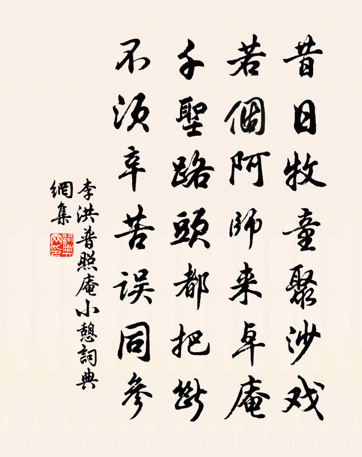 詩詞名句歷史字典書法欣賞書法字典國語詞典說文解字康熙字典古漢語字典標 題 作 者 詩 句 普照庵小憩作者:李洪 朝代:宋代普照庵小憩原文昔日牧童聚沙戲,若個阿師來卓庵。千聖路頭都把斷,不須辛苦誤同參。詩詞問答問:普照庵小憩的作者是誰?答:李洪問:普照庵小憩寫於哪個朝代?答:宋代李洪普照庵小憩書法欣賞普照庵小憩書法作品詩詞推薦翡翠劉延世〔宋代〕避人忽起鳴衣桁,掠水飛來立釣磯。靜處欲留看不足,翠光點破夕陽歸。春暮寄元九白居易〔唐代〕梨花結成實,燕卵花為雛。時物又若此,道情復何如?但覺日月促,不嗟年歲徂。浮生都是夢,老小亦何殊?唯與登雲漢閣釋斯植〔宋代〕高閣勢凌虛,天涯入望微。雲藏山鳥影,春滿野人衣。積雨催花盡,寒樵背日歸。焚午端坐處,似覺世塵稀。柳梢青張杜〔宋代〕燕里花深,鷺汀雲澹,客夢江皋。日日言歸,淮山笑我,塵鎖征袍。幾回把酒憑高。闌乾外、魂飛暮濤。只有南園守閘書事時已退居五首曹勛〔宋代〕野情漫對三眠柳,幽思空懷九畹蘭。他日倘從春步約,湖邊一笑似非難。偈三首釋梵言〔宋代〕臘月二十日,一年將欲盡,萬里未歸人。門前殘雪日輪消,室內紅塵遣誰掃。再和答為之黃庭堅〔宋代〕君勿嘲廣文,冱寒被絺葛。君勿嘲廣文,窮年飯粢糲。常恐俎豆予,與世充餚核。凡木不願材,木折小枝泄。櫟依【雙調】雁兒落過得勝令 落花楊朝英〔元代〕惜殘紅惜嫩紅,如曉夢如春夢。寂寞了金谷園,冷落了桃源洞。錯怨五更風,蜂蝶去無蹤。一徑胭脂重,千機錦繡新霜二首歐陽修〔宋代〕天雲慘慘秋陰薄,臥聽北風鳴屋角。平明驚鳥四散飛,一夜新霜群木落。南山鬱郁舊可愛,千仞巉岩如刻削。林枯三日尋李九莊常建〔唐代〕雨歇楊林東渡頭,永和三日盪輕舟。故人家在桃花岸,直到門前溪水流。社日萬監招飲不往方岳〔宋代〕土潤如酥麥已鞭,社公滿意作豐年。吹筒撾鼓兒童競,宰肉分膰父老專。欲事田園供歲課,未甘花鳥老春煙。客中窮居陸游〔宋代〕仕宦初何得,窮居半士農。清宵叔夜鍛,平旦伯鸞舂。馬磨猶支日,牛衣亦過冬。湖中有嘯父,何計得相從?賦陳太史所築凌雲亭四首劉宰〔宋代〕吏退庭空一逕深,交柯密葉布繁陰。婆娑誰識先生意,恐負當時庛物心。瑞鷓鴣趙希蓬〔宋代〕把定離觴不肯斟。聞君未醉盡衷情。丁香空結千般恨,柳線難縈一片心。只把文章酧素願,莫貪歌舞阻歸程。憑君嘗春酒王績〔唐代〕野觴浮鄭酌,山酒漉陶巾。但令千日醉,何惜兩三春。十一月二十八日大雪有感釋寶曇〔宋代〕動地飛花變鶴林,天低直欲近牆陰。共知一飽明年事,誰識三號此日心。東望眼穿秦望白,西湖淚入鏡湖深。無邊舟行到{上艹右羊}莪和清老韻王炎〔宋代〕沙尾維舟傍水楊,主人延我坐中堂。山焦石裂方亭午,借得微風一霎涼。壬辰七月十六日侵晨真率會,石湖路中書事范成大〔宋代〕白葛烏紗稱老農,溪南溪北水車風。稻頭的皪粘朝露,步入明珠翠綱中。題於潛張明甫愛拙堂強至〔宋代〕高灑潛川愛拙翁,堂閒雅與拙情同。宦塗恥用機心達,聖世寧為直道窮。千載奸纖羞白骨,一時夷坦擅清風。邑人無相寺道中葉適〔宋代〕傍水人家柳十餘,靠山亭子菊千株。竹雞露啄堪幽伴,蘆菔風乾待歲除。與仆抱樵趨絕澗,隨僧尋磬禮精廬。不知名句推薦透內閣香風陣陣,掩重門暮雨紛紛。王實甫《十二月過堯民歌·別情》 翠華想像空山里,玉殿虛無野寺中。杜甫《詠懷古蹟五首·其四》 不知江月待何人,但見長江送流水。張若虛《春江花月夜》 前村深雪裡,昨夜一枝開。齊己《早梅》 唯願當歌對酒時,月光長照金樽里。李白《把酒問月·故人賈淳令予問之》 縱被無情棄,不能羞。韋莊《思帝鄉·春日游》 好一似食盡鳥投林,落了片白茫茫大地真乾淨。曹雪芹《紅樓夢·第五回》 樂遊原上清秋節,鹹陽古道音塵絕。李白《憶秦娥·簫聲咽》 相尋夢裡路,飛雨落花中。晏幾道《臨江仙·鬥草階前初見》 功被天下,守之以讓。荀子《荀子·宥坐》