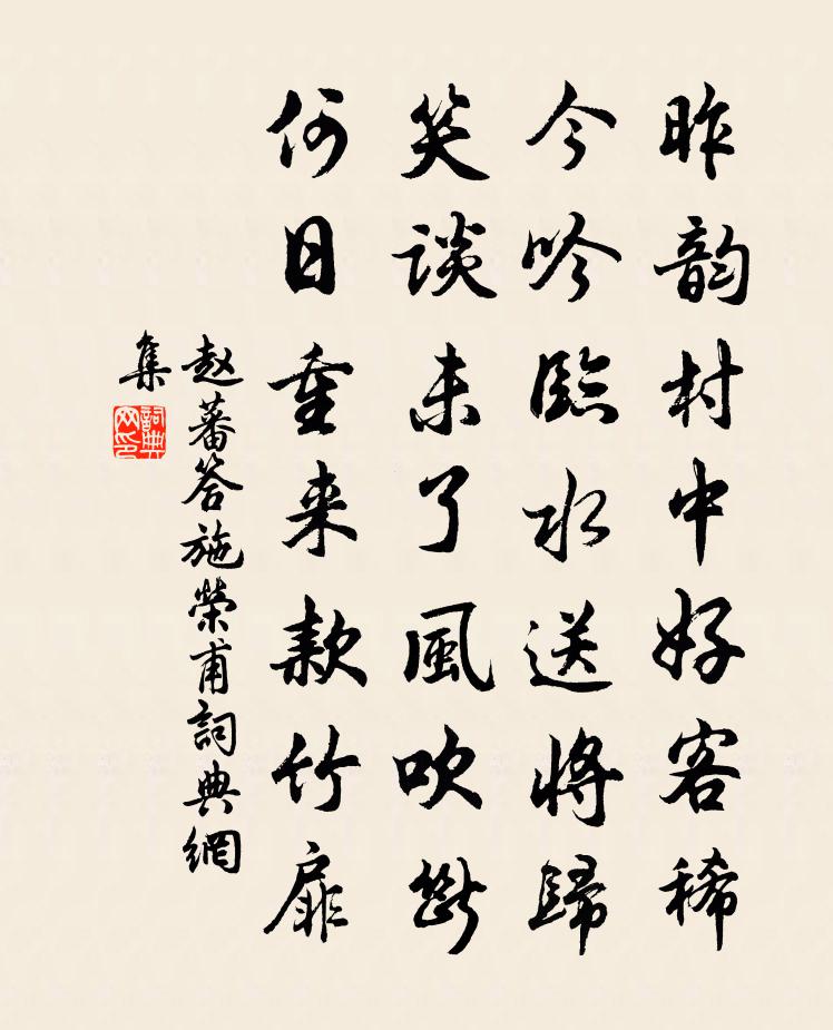 詩詞名句歷史字典書法欣賞書法字典國語詞典說文解字康熙字典古漢語字典標 題 作 者 詩 句 答施榮甫作者:趙蕃 朝代:宋代答施榮甫原文昨韻村中好客稀,今吟臨水送將歸。笑談未了風吹斷,何日重來款竹扉。詩詞問答問:答施榮甫的作者是誰?答:趙蕃問:答施榮甫寫於哪個朝代?答:宋代趙蕃答施榮甫書法欣賞答施榮甫書法作品詩詞推薦呈雪竇僧野翁陳著〔宋代〕雨屋又留連,回頭七載前。同游半黃土,百感兩霜顛。睡醒茶為祟,吟清山結緣。他年北窗下,誰復對床眠。齊天樂方千里〔宋代〕碧紗窗外黃鸝語,聲聲似愁春晚。岸柳飄綿,庭花墮雪,惟有平蕪如剪。重門尚掩。看風動疏簾,浪鋪湘簟。暗想東平劉左車坎止春歌張元乾〔宋代〕先朝相國今幾家,我嗟夫子鬢已華。瓊艘頗慣倒 * ,老來手釀尊仍窪。百年彈指法界觀,萬事過眼天女花。聊學擊舟詹羲〔宋代〕石廩岩前擊小舟,娟娟明月照清秋。仙人一夜吹長笛,三十六峰雲盡收。寂住閣黃庭堅〔宋代〕莊周夢為胡蝶,胡蝶不知莊周。當處出生隨意,急流水上不流。題峽州三游洞魏了翁〔宋代〕可怪忠州與虢州,偶因起廢得茲游。蘇歐諸老亦何德,千古聯芳未肯休。頌古十首釋行鞏〔宋代〕學洚波瀾卷未乾,幾煩仙屐上林巒。天香吹落秋風老,不覺相攜到廣寒。東門行張載〔宋代〕古風出東門,我行樂巾綦。今歌樂門行,牽衣強留甘餔糜。仗劍去,忽如遺,時清君去予心哀。木蘭花慢 壽陳公望王旭〔元代〕問東原豪傑,先屈指,到元龍。看瀟灑風標,汪洋學海,磊落詞鋒。沂川歲回來往,把乾坤、歌入舞雩風。妙理鳶題蠟屐金貂二亭呂巽伯表弟命賦蘇泂〔宋代〕蠟屐登山去,金貂換酒來。一生須幾兩,萬事付三杯。飲爾非狂耳,歸歟有旨哉。何時兩亭暮,吾與汝徘徊。十一月十四夜誦康節詩至憶弟三首潸然有感陳文蔚〔宋代〕人生雖是有愚賢,到底天倫只一般。惆悵同安何處所,不堪歲暮更天寒。雲山閣許琮〔宋代〕雲山依舊接清秋,高閣荒榛悵舊遊。二十四橋何處所,西風吹盡白蘋洲。句洪天錫〔宋代〕平生要識瓊崖面,到此當堅鐵石心。【雙調】蟾宮曲 自樂孫周卿〔元代〕想天公自有安排,展放愁眉,開著吟懷。款系紅牙,低歌玉樹,爛醉金釵。花謝了逢春又開,燕歸時到社重來。蘭金山寺王安石〔宋代〕招提憑高岡,四面斷行旅。勝地猶在險,浮梁裊相拄。大江當我前,颭灩翠綃舞。通流與廚會,甘美勝牛乳。扣欄景福東廂詩夜意司馬光〔宋代〕清夜四無嘩,深嚴上帝家。星翻珠綱白,斗掛玉樓斜。風靜虛成韻,霜輕未作花。還疑漢津客,浩蕩寄流槎。寄上田僕射韓翃〔唐代〕家封薛縣異諸田,報主榮親義兩全。僕射臨戎謝安石,大夫持憲杜延年。金裝晝出羅千騎,玉案晨餐直萬錢。應念峽山飛來殿李昴英〔宋代〕龍門鑿破碧天池,呈佛高峰插翠微。對岸鐘聲猶隱耳,御風檐角尚如翬。二神擇地非著相,雙錫騰空向上機。此境送皇甫曾赴上都劉長卿〔唐代〕東遊久與故人違,西去荒涼舊路微。秋草不生三徑處,行人獨向五陵歸。離心日遠如流水,回首川長共落暉。楚客龍門寺一首王阮〔宋代〕傍石尋幽徑,窮源得梵城。塔光侵地發,龍氣逼山清。是處堪吾老,何年遂此生。霜林知客意,一夜戰秋聲。名句推薦隔戶楊柳弱裊裊,恰似十五女兒腰。杜甫《絕句漫興九首·其一》 來是空言去絕蹤,月斜樓上五更鐘。李商隱《無題四首》 青山一道同雲雨,明月何曾是兩鄉。王昌齡《送柴侍御》 一字無題外,落葉都愁。張炎《八聲甘州·記玉關踏雪事清游》 已訝衾枕冷,復見窗戶明。白居易《夜雪》 雁聲遠過瀟湘去,十二樓中月自明。溫庭筠《瑤瑟怨》 紅顏未老恩先斷,斜倚薰籠坐到明。白居易《後宮詞》 擬借寒潭垂釣,又恐鷗鳥相猜,不肯傍青綸。蘇舜欽《水調歌頭·滄浪亭》 霰雪紛其無垠兮,雲霏霏而承宇。屈原《九章》 國君好仁,天下無敵焉。孟子《孟子·盡心章句下·第四節》