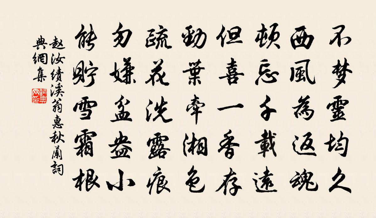 詩詞名句歷史字典書法欣賞書法字典國語詞典說文解字康熙字典古漢語字典標 題 作 者 詩 句 溪翁惠秋蘭作者:趙汝績 朝代:宋代溪翁惠秋蘭原文不夢靈均久,西風為返魂。頓忘千載遠,但喜一香存。勁葉牽湘色,疏花洗露痕。勿嫌盆盎小,能貯雪霜根。詩詞問答問:溪翁惠秋蘭的作者是誰?答:趙汝績問:溪翁惠秋蘭寫於哪個朝代?答:宋代趙汝績溪翁惠秋蘭書法欣賞溪翁惠秋蘭書法作品詩詞推薦答行簡上人書釋智圓〔宋代〕偶依溪上居,三見改時候。來書問蹤跡,行坐置懷袖。學道不加前,多慵還似舊。苦吟徹宵夜,閒眠消白晝。古屋即景黃庚〔宋代〕籬落西風野老家,閒看景物感年華。柳衰荷改芙蓉死,交割秋光與菊花。念奴嬌(九日作)姚述堯〔宋代〕山城秋好,正西風淅淅,登高時候。杖倚徘徊凝望處,翠疊萬山如繡。雲繞禾場,熢沈戎馬,田野歡聲湊。琴堂無採桑子·塞上詠雪花納蘭性德〔清代〕非關癖愛輕模樣,冷處偏佳。別有根芽,不是人間富貴花。謝娘別後誰能惜,漂泊天涯。寒月悲笳,萬里西風瀚海窺開吟邵雍〔宋代〕物理窺開後,人情照破時。可嗟兼可唾,堪鄙又堪嗤。濜口治張繼先〔宋代〕真真相襲養真材,萬木深沉一水回。珠逞夜明秋浪定,磬含霜韻曉霞開。二仙已遠教誰遇,三粒還能待我來。若遣和襲美泰伯廟陸龜蒙〔唐代〕故國城荒德未荒,年年椒奠濕中堂。邇來父子爭天下,不信人間有讓王。鏟孟郊體七首謝翱〔宋代〕越禽惜羽毛,不向惡木棲。木奴重逾淮,愛爾巢其枝。巢枝不食實,中有二老棋。乳子月明中,夢繞東南飛。紹熙癸丑二月二十六日蔣助教言正招游陽華婆李長庚〔宋代〕春風今日扇微和,觸目江山發興多。如畫幽岩無十里,輕衫短帽得婆娑。登東陽沈隱侯八詠樓崔融〔唐代〕旦登西北樓,樓峻石墉厚。宛生長定□,俯壓三江口。排階銜鳥衡,交疏過牛斗。左右會稽鎮,出入具區藪。越岩題黃州謝深道國正山庵戴復古〔宋代〕就荒山竹重抽筍,新種池荷晚著花。意象全然似村落,又添茅屋兩三家。送賈訥倅眉二首蘇軾〔宋代〕當年入蜀嘆空回,未見峨眉肯再來。童子遙知頌襦袴,使君先已洗樽罍。(李大夫,眉之賢守也。)鹿頭北望應逢聽僧彈琴貫休〔唐代〕家近吳王古戰城,海風終日打牆聲。今朝鄉思渾堆積,琴上聞師大蟹行。送李芝還舊隱宋祁〔宋代〕章冠慣趁舞雩春,屬疾彌年素產貧。舊隱卻招三徑菊,歸裝不受九街塵。平時戲服歡為采,日後迎蒲待裹輪。天下次韻宋尚書山居十五詠見溪亭方岳〔宋代〕碧壺時與故人提,山帶僧鍾日去西。深不知寒雙鷺浴,雪灘煙重碎玻璃。立春帖子太上皇后閣周必大〔宋代〕白玉重鐫冊,黃金再鑄章。宮中饒樂事,大典對春陽。三月望日微雨汎舟西湖四首張鎡〔宋代〕清明才過雨連風,著色湖山便面中。草上踏青人自出,艤船無地不飛紅。已亥雜詩 261龔自珍〔清代〕絕色呼他心未安,品題天女本來難。梅魂菊影商量遍,忍作人間花草看。和傅山父小園十詠李曾伯〔宋代〕一室掃除才斗許,幾番醉夢與梅清。琱戈翠節成可事,紙帳 * 了此生。春感詩李白〔唐代〕茫茫南與北,道直事難諧。榆莢錢生樹,楊花玉糝街。塵縈遊子面,蝶弄美人釵。卻憶青山上,雲門掩竹齋。名句推薦一看腸一斷,好去莫回頭。白居易《南浦別》 至道深微,惟人是弘李大師、李延壽《南史·本紀·卷四》 弱柳青槐拂地垂,佳氣紅塵暗天起。盧照鄰《長安古意》 雁過孤峰曉,猿啼一樹霜。賈島《送天台僧》 今宵樓上一尊同。雲濕紗窗。辛棄疾《一剪梅·中秋元月》 一自胡塵入漢關,十年伊洛路漫漫。陳與義《詠牡丹》 北斗七星高,哥舒夜帶刀。西鄙人《哥舒歌》 吾本乘興而行,興盡而返,何必見戴!劉義慶《世說新語·任誕》 居庸關上子規啼,飲馬流泉落日低。朱彝尊《出居庸關》 觀說之流,可以知其術也;久而復之,可以知其信矣;觀其所愛親,可以知其人矣。戴聖《大戴禮記·曾子立事第四十九》