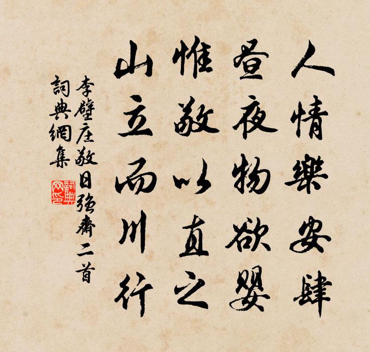 詩詞名句歷史字典書法欣賞書法字典國語詞典說文解字康熙字典古漢語字典標 題 作 者 詩 句 莊敬日強齋二首作者:李壁 朝代:宋代莊敬日強齋二首原文人情樂安肆,晝夜物慾嬰。惟敬以直之,山立而川行。詩詞問答問:莊敬日強齋二首的作者是誰?答:李壁問:莊敬日強齋二首寫於哪個朝代?答:宋代李壁莊敬日強齋二首書法欣賞莊敬日強齋二首書法作品詩詞推薦挽費潔堂馬廷鸞〔宋代〕井路璠璵瑞,江乾英簜馳。萬屯孤宿飽,一旅共時危。行地嗟蓬轉,呼天泣黍離。百年公有盡,一慟我非私。金鄉張氏園亭石延年〔宋代〕亭館連城敵謝家,四時園色斗明霞。窗迎西渭封侯竹,地接東陵隱士瓜。樂意相關禽對語,生香不斷樹交花。縱游青霞蒲壽宬〔宋代〕百尺長松岩下風,一輪明月屋西峰。夢回細數登山路,知在青霞第幾重。紹熙庚戍十月偕趙仲宗舜和潘謙之曾魯仲游九黃榦〔宋代〕行行益以遠,愜此心期幽。一徑險復夷,千林密相樛。回首天際山,矗面懸飛流。銀潢倚石壁,玉龍下山湫。光搖飲袁國宗趙文〔宋代〕一丈明窗便有餘,四人燕坐小蓬壺。可憐一月半晴雨,未省百花今在無。眼底是詩皆可賦,樽中有酒不須沽。更闌室人墓下葉茵〔宋代〕楚愴埋香地,卿須念藁砧。齊眉中道訣,同穴百年心。刀尺凝餘澤,松梧帶老陰。可能如饁婦,相對白頭吟。雨中懶困楊萬里〔宋代〕城頭欲上苦新泥,暖氣薰人軟欲痴。睡又不成行不是,強來看打洛神碑。菩薩蠻(賦玉蕊花)史達祖〔宋代〕唐昌觀里東風軟。齊王宮外芳名遠。桂子典刑邊。梅花伯仲間。籠茸鎪暖雪。瑣細雕晴月。誰駕七香車。綠雲飛玉送沈鍊師歸武夷胡仲弓〔宋代〕焚香禮象緯,步虛聲摩空。千趄古洞天,依稀五明宮。寶珠如黍米,懸懸太虛中。鍊師於此時,金丹滿爐紅。挽方宮使何夢桂〔宋代〕鼎湖弓墮賦歸來,地拆天分泰華頹。膝上二雛兵血燐,樓頭萬卷劫池灰。百年豪傑埋荒草,半世功名落大槐。身後鑄年五十八因病廢得旨休致一絕寄呈姑蘇毗陵賀鑄〔宋代〕求田問舍向吳津,欲著衰殘老病身。未拜君恩賜剡曲,歸來且醉監湖春。曾耆英錄先提舉著述及屠龍禾譜與先世志文見趙蕃〔宋代〕試用初如江發源,斯人欠使百其年。有孫解保書如束,過我不嫌寒乏氈。郡守舊聞曾奏疏,鄉人今日有經筵。縱雲三部樂(黃鐘商,俗名大石調賦姜石帚漁隱)吳文英〔宋代〕江ED42初飛,盪萬里素雲,際空如沐。詠情吟思,不在秦箏金屋。夜潮上、明月蘆花,傍釣蓑夢遠,句清敲玉高縣丞不負堂詩何夢桂〔宋代〕閒丞八品一官卑,許贊男邦問便宜。議論是非晴雨異,刑囚出入重輕疑。案頭涉筆余心愧,松下喔詩官事隳。丞得夏夜露坐白玉蟾〔宋代〕披襟岸幘藕花橋,一片哀鴻度碧霄。新月出來真解事,嫩蟬吟得自無聊。贈老僧顧逢〔宋代〕眾僧尊夏臘,靈岳遍曾登。渡水手中杖,行山溪畔藤。心空默是印,眉白雪為棱。自得巡方道,棲禪老未能。次韻和康侍郎雪後小雨二首林季仲〔宋代〕殘霙初伴梅梢月,小雨仍禁柳底春。莫厭酒搖金盞浪,更聽歌繞畫染塵。郢城懷古李百藥〔唐代〕客心悲暮序,登墉塘瞰平陸。林澤窅芊綿,山川郁重複。王公資設險,名都拒江隩。方城次北門,溟海窮南服。長再賦酬吳鞠潭施樞〔宋代〕酌酒酬春醉晚紅,誰知書劍兩無功。漁竿冷浸半絲月,牛背閒消一笛風。仙夢不隨狂蝶亂,家書只倩素魚通。友聲嘉禾百詠馬塘涇張堯同〔宋代〕疑著風波惡,民謠亦畏人。築塘成堰後,斬馬祭河神。名句推薦智者不危眾以舉事,仁者不違義以要功。范曄《後漢書·列傳·竇融列傳》 今年歡笑復明年,秋月春風等閒度。白居易《琵琶行 / 琵琶引》 雪裡已知春信至。寒梅點綴瓊枝膩。李清照《漁家傲·雪裡已知春信至》 疏條交映,有時見日。吳均《與朱元思書》 博學篤志,切問近思,此八字是收放心的工夫王永彬《圍爐夜話·第一七六則》 害人之心不可有,防人之心不可無!佚名《增廣賢文·下集》 幽徑無人獨自芳,此恨憑誰訴。曹組《卜運算元·蘭》 冷冷水向橋東去。漠漠雲歸溪上住。劉鎮《玉樓春·東山探梅》 夜中不能寐,起坐彈鳴琴。阮籍《詠懷八十二首·其一》 肥水東流無盡期。當初不合種相思。姜夔《鷓鴣天·元夕有所夢》