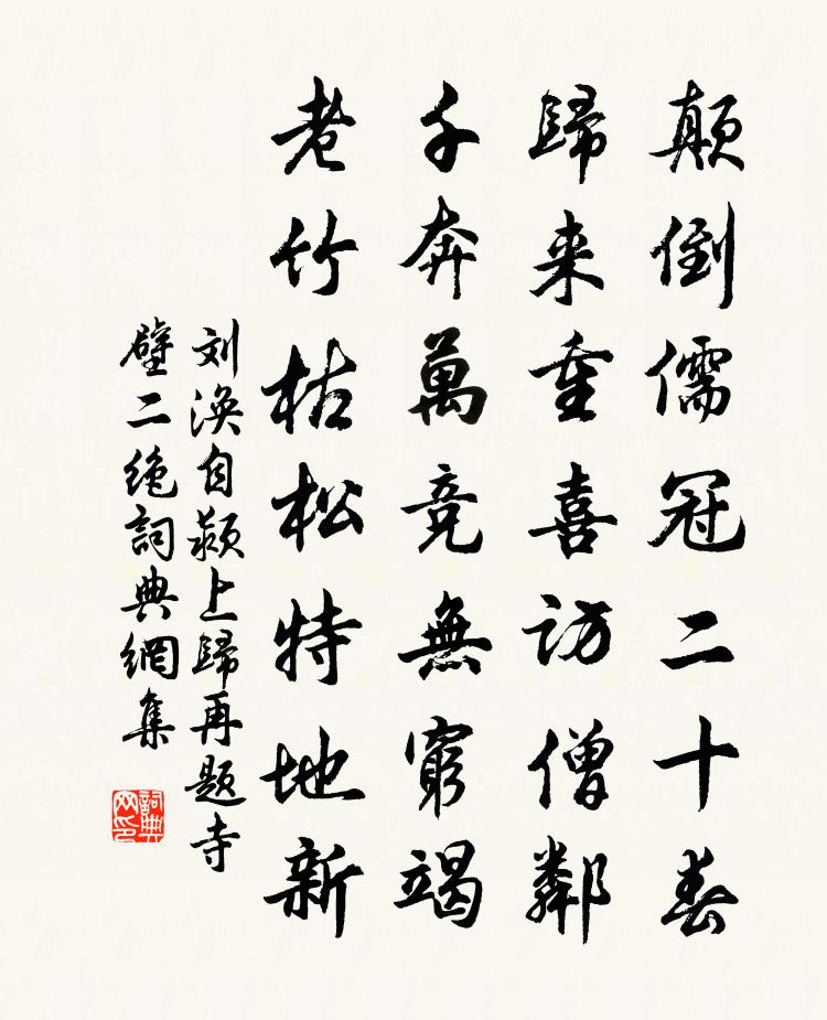 詩詞名句歷史字典書法欣賞書法字典國語詞典說文解字康熙字典古漢語字典標 題 作 者 詩 句 自潁上歸再題寺壁二絕作者:劉渙 朝代:宋代自潁上歸再題寺壁二絕原文顛倒儒冠二十春,歸來重喜訪僧鄰。千奔萬競無窮竭,老竹枯松特地新。詩詞問答問:自潁上歸再題寺壁二絕的作者是誰?答:劉渙問:自潁上歸再題寺壁二絕寫於哪個朝代?答:宋代劉渙自潁上歸再題寺壁二絕書法欣賞自潁上歸再題寺壁二絕書法作品詩詞推薦筆答趙蕃〔宋代〕拔毛知不免,受縛嘆何窮。屢沐雖蒙賜,披心每盡忠。憤然成臆對,老矣實頭童。醉素今安在,歸真托此公。人愛九日多以靖節之故仆以邠老七字為可以益趙蕃〔宋代〕東籬滿把菊,柯山一句詩。四時皆有節,九日獨如斯。潘子夙所尚,陶翁何敢師。是故逢此日,愛慕仍淒悲。所願送殷侍御赴同州賈島〔唐代〕馮翊蒲西郡,沙岡擁地形。中條全離岳,清渭半和涇。夜暮眠明月,秋深至洞庭。猶來交辟士,事別偃林扃。懷高真動二首貫休〔唐代〕知爾今何處,孤高獨不群。論詩唯許我,窮易到無文。貰酒兒穿雪,尋僧月照雲。何時再相見,兵寇尚紛紛。久別十月十五日同黃大博出城李流謙〔宋代〕休沐來尋九里松,故因晴日覺晴容。寒余淺水紅衣盡,淡抹輕煙紫翠重。倦向山僧談白葉,歸從逋客醉黃封。塵埃浦湘曲(為金壇教諭乾壽道考滿悵詞)蔡士裕〔宋代〕功名早。步武青雲繚繞。斯文近有成效。絳紗拍拍春風滿,香動一池芹藻。瓜期到。便勇撤皋比,此去應光耀。立送僧歸靈隱釋重顯〔宋代〕白雲無羈,冷淡清奇。雪格未可,鶴態還卑。垂天沃日兮似結不結,為雨從龍兮後期必期。噫,悠悠忽爾春風吹,讀王逢原文奇其才擇甚精者錄為一編孔武仲〔宋代〕人喜相知自昔然,況君埋玉未多年。雄文一讀千行淚,青眼相期萬古傳。已掇條枚收美實,更披沙石貯清泉。東齊壬戌正月十四日陸游〔宋代〕老子居然健,上元如許晴。湖平波不起,天闊月徐行。散發漁舟穩,臨風野笛清。安能擁笳鼓,萬里將幽并。一落索楊 * 〔宋代〕識盡人間甘苦。不如歸去。先來孤館客愁多,更傾下、連宵雨。盡日登山繞樹。祿非尺素。竹雞啼了杜鵑啼,甚都題耕織圖二十四首奉懿旨撰趙孟頫〔元代〕忽忽歲將盡,人事可稍休。寒風吹桑林,日夕聲颼飀。牆南地不凍,墾掘為坑溝。斫桑埋其中,明年芽早抽。是月桂林還珠洞賈黃中〔宋代〕赫赫威聲震百蠻,昔攜筐筥溷谷山。無人為起文淵問,端的珠還薏苡還。瑞岩仰老見和復酬前韻七首曹勛〔宋代〕雙澗流泉徹底清,五峰晴掛白雲輕。泉流雲散遲歸步,猶欲思豐問此生。送盧少府使入秦孟浩然〔唐代〕楚關望秦國,相去千里余。州縣勤王事,山河轉使車。祖筵江上列,離恨別前書。願及芳年賞,嬌鶯二月初。吳耿先生還北山舊居陳洙〔宋代〕蒼浪兩鬢斑,盡意六經間。有術佐明主,無官歸故山。釣台春水碧,吟榭暮雲閒。見說還家後,重將舊史刪。和永叔六篇其六啼鳥梅堯臣〔宋代〕提胡蘆,提胡蘆,爾莫勸翁沽美酒。公多金錢賜醇酎,名聲壓時為不朽。百舌子,百舌子,春泥方滑滑。泥雖滑滑句虞德觀〔宋代〕我因國破家何在,君為唇亡齒亦寒。丹霞誧法弟新建暖堂以頌慶之釋子淳〔宋代〕暖堂新構侵雲表,桂月松風常滿抱。玉燭光中靜應時,言前妙唱般陽道。【正宮】醉太平_春情烏雲髻張可久〔元代〕春情烏雲髻松,金鳳釵橫。伯勞飛燕自西東,惱離愁萬種。碧溶溶滿溪綠水桃源洞,淡濛濛半窗白月梨雲夢,恨匆卜運算元(李季允屷約登鄂州南樓即席次韻)魏了翁〔宋代〕攜月上至南樓,月已穿雲去。莫照峨眉最上峰,同在峰前住。東望極青齊,西顧窮商許。酒到憂邊總未知,猶認胡名句推薦碧雲無渡碧天沉,是湖心,是儂心。張惠言《江城子·填張春溪西湖竹枝詞》 日暮漢宮傳蠟燭,輕煙散入五侯家。韓翃《寒食》 秋晚蓴鱸江上,夜深兒女燈前。辛棄疾《木蘭花慢·滁州送范倅》 獨寫菖蒲竹葉杯,蓬城芳草踏初回。湯顯祖《午日處州禁競渡》 日射紗窗風撼扉,香羅拭手春事違。李商隱《日射》 郴江幸自繞郴山,為誰流下瀟湘去。秦觀《踏莎行·郴州旅舍》 去歲江南見雪時,月底梅花發。張孝祥《卜運算元·雪月最相宜》 細影將圓質,人間幾處看。薛濤《月》 今古河山無定據。納蘭性德《蝶戀花·出塞》 故人書報,莫因循、忘卻蓴鱸。辛棄疾《漢宮春·會稽秋風亭觀雨》