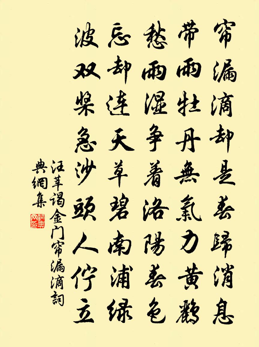 詩詞名句歷史字典書法欣賞書法字典國語詞典說文解字康熙字典古漢語字典標 題 作 者 詩 句 謁金門·簾漏滴作者:汪莘 朝代:宋代謁金門·簾漏滴原文簾漏滴,卻是春歸訊息。帶雨牡丹無氣力,黃鸝愁雨濕。爭著洛陽春色,忘卻連天草碧。南浦綠波雙槳急,沙頭人佇立。詩詞問答問:謁金門·簾漏滴的作者是誰?答:汪莘問:謁金門·簾漏滴寫於哪個朝代?答:宋代汪莘謁金門·簾漏滴書法欣賞謁金門·簾漏滴書法作品注釋①南浦:泛指面南的水邊。 詩文賞析這首小令,抒寫暮春懷人之情。上片寫暮春景色。牡丹帶雨,黃鸝含愁,春將歸去。下片抒寫懷人之情。眼前春色,使人忘卻了連天草碧。南浦槳急,佇立沙頭,情思無限。本詞融情於景,情景交融,曲折含蓄,婉媚新倩,精巧工麗,確是一首美妙的短歌。標籤:婉約,春天,寫景,懷人詩詞推薦過百家渡四絕句楊萬里〔宋代〕出得城來事事幽,涉湘半濟值漁舟。也知漁父赴魚急,翻著春衫不裡頭。卜運算元·樽前一曲歌杜安世〔宋代〕尊前一曲歌。歌里千重意,才欲歌時淚已流,恨應更、多於淚。 試問緣何事。不語如痴醉。我亦情多不忍聞,怕採桑子·而今才道當時錯納蘭性德〔清代〕而今才道當時錯,心緒淒迷。紅淚偷垂,滿眼春風百事非。情知此後來無計,強說歡期。一別如斯,落盡梨花月又酒泉子·花映柳條溫庭筠〔唐代〕花映柳條,吹向綠萍池上。憑欄乾,窺細浪,雨蕭蕭。近來音信兩疏索,洞房空寂寞。掩銀屏,垂翠箔,度春宵。哭孟浩然王維〔唐代〕故人不可見,漢水日東流。借問襄陽老,江山空蔡州。登樓望水顧況〔唐代〕鳥啼花發柳含煙,擲卻風光憶少年。更上高樓望江水,故鄉何處一歸船。採桑子納蘭性德〔清代〕冷香縈遍紅橋夢,夢覺城笳。月上桃花,雨歇春寒燕子家。箜篌別後誰能鼓,腸斷天涯。暗損韶華,一縷茶煙透碧春思詩王僧孺〔南北朝〕雪罷枝即青,冰開水便綠。復聞黃鳥聲,全作相思曲。答謝中書書陶弘景〔南北朝〕山川之美,古來共談。高峰入雲,清流見底。兩岸石壁,五色交輝。青林翠竹,四時俱備。曉霧將歇,猿鳥亂鳴;酹江月·夜涼黃升〔宋代〕西風解事,為人間、洗盡三庚煩暑。一枕新涼宜客夢,飛入藕花深處。冰雪襟懷,琉璃世界,夜氣清如許。劃然長送劉司直赴安西王維〔唐代〕絕域陽關道,胡沙與塞塵。三春時有雁,萬里少行人。苜蓿隨天馬,葡萄逐漢臣。當令外國懼,不敢覓和親。江城子·江景蘇軾〔宋代〕湖上與張先同賦,時聞彈箏鳳凰山下雨初晴,水風清,晚霞明。一朵芙蕖,開過尚盈盈。何處飛來雙白鷺,如有意春夜竹亭贈錢少府歸藍田王維〔唐代〕夜靜群動息,時聞隔林犬。卻憶山中時,人家澗西遠。羨君明發去,采蕨輕軒冕。春晚書山家屋壁二首貫休〔唐代〕柴門寂寂黍飯馨,山家煙火春雨晴。庭花蒙蒙水泠泠,小兒啼索樹上鶯。水香塘黑蒲森森,鴛鴦鸂鶒如家禽。前村朝中措·蜀弦秦柱不關情納蘭性德〔清代〕蜀弦秦柱不關情,盡日掩雲屏。已惜輕翎退粉,更嫌弱絮為萍。東風多事,余寒吹散,烘暖微酲。看盡一簾紅雨,岳陽樓記范仲淹〔宋代〕慶曆四年春,滕子京謫守巴陵郡。越明年,政通人和,百廢具興,乃重修岳陽樓,增其舊制,刻唐賢今人詩賦於其詠柳 / 柳枝詞賀知章〔唐代〕碧玉妝成一樹高,萬條垂下綠絲絛。不知細葉誰裁出,二月春風似剪刀。長壽樂(般涉調)柳永〔宋代〕繁紅嫩翠。艷陽景,妝點神州明媚。是處樓台,朱門院落,弦管新聲騰沸。恣遊人、無限馳驟,嬌馬車如水。竟尋村居高鼎〔清代〕草長鶯飛二月天,拂堤楊柳醉春煙。兒童散學歸來早,忙趁東風放紙鳶。離亭燕·一帶江山如畫張昪〔宋代〕一帶江山如畫。風物向秋瀟灑。水浸碧天何處斷,翠色冷光相射。蓼岸荻花中,隱映竹籬茅舍。天際客帆高掛。門名句推薦秋送新鴻哀破國,晝行飢虎齧空林。鄭思肖《二礪》 窮則變,變則通,通則久。佚名《易傳·繫辭傳下·第二章》 秋草獨尋人去後,寒林空見日斜時。劉長卿《長沙過賈誼宅》 至言忤於耳而倒於心,非賢聖莫能聽韓非及後人《韓非子·難言》 一月不讀書,耳目失精爽。蕭掄謂《讀書有所見作》 下貧則上貧,下富則上富。荀子《荀子·富國》 雖慚老圃秋容淡,且看黃花晚節香。韓琦《九日水閣》 殊方日落玄猿哭,舊國霜前白雁來。杜甫《九日五首·其一》 寒食不多時,牡丹初賣。晁沖之《感皇恩·寒食不多時》 誓將掛冠去,覺道資無窮。岑參《與高適薛據同登慈恩寺浮圖》