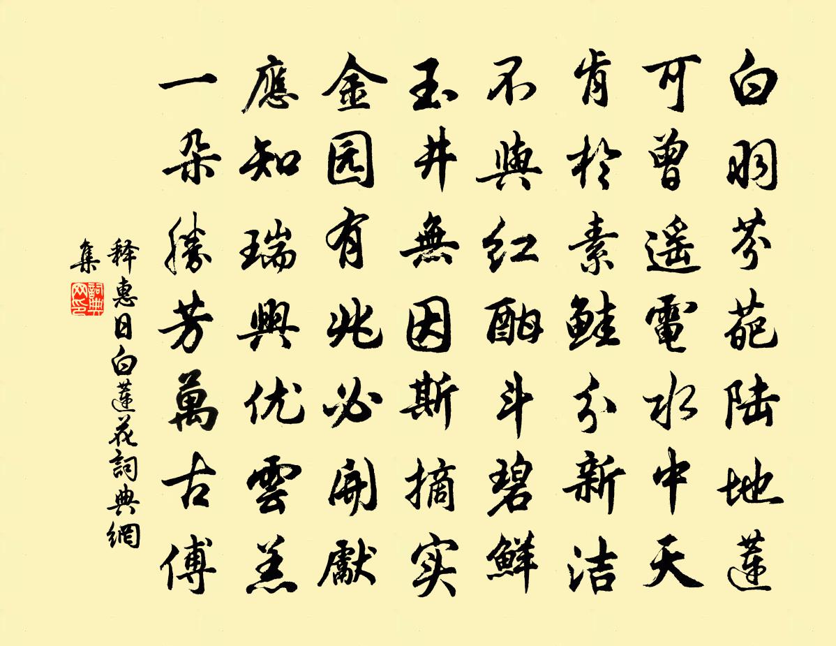詩詞名句歷史字典書法欣賞書法字典國語詞典說文解字康熙字典古漢語字典標 題 作 者 詩 句 白蓮花作者:釋惠日 朝代:宋代白蓮花原文白羽芬葩陸地蓮,可曾遙電水中天。肯於素鮭分新潔,不與紅酣斗碧鮮。玉井無因斯摘實,金園有兆必開先。應知瑞興優雲羔,一朵勝芳萬古傅。詩詞問答問:白蓮花的作者是誰?答:釋惠日問:白蓮花寫於哪個朝代?答:宋代釋惠日白蓮花書法欣賞白蓮花書法作品詩詞推薦高宗皇帝賢訓終編錫賚進詩程珌〔宋代〕紅雲一朵金爐煙,黃傘亭亭午漏傅。龍床猶御金華殿,方進群儒讀寶編。編中並載神堯語,三十六年真復古。祗今侃老舍天寧寺往游何道二山二首袁說友〔宋代〕拍手笑無語,挑包去不還。行行餘一缽,歷歷上諸山。明月隨方照,孤雲任意閒。猊床待師處,猿鳥撤松關。水調歌頭(和陸放翁多景樓)王奕〔宋代〕迢迢嶓冢水,直瀉到東州。不揀秦淮吳楚,明月一家樓,何代非卿非相,底事柴桑老子,偏恁不推劉。半體鹿皮服問寇校書雙溪王維〔唐代〕君家少室西。為復少室東。別來幾日今春風。新買雙溪定何似。餘生欲寄白雲中。丙申至前五日復坐南窗憶去年詩又成兩章張栻〔宋代〕新晴物物有春意,正值一陽來復時。變化無窮俱是易,探原密處起乾知。河瀆神·風緊雁行高納蘭性德〔清代〕風緊雁行高,無邊落木蕭蕭。楚天魂夢與香消,青山暮暮朝朝。斷續涼雲來一縷,飄墮幾絲靈雨。今夜冷紅浦漵,何處難忘酒十首王令〔宋代〕何處難忘酒,君臣草昧初。謀臣偷賊膽,力士斡凶鋤。日月明將霽,乾坤害欲除。此時無一盞,何以壯雄圖。句曹良史〔宋代〕雲生畫佛壁,葉落病僧房。閒來閉門處,認得讀書聲。深樹月昏神火出,斷煙雪霽獵人回。牆圍敗屋知無主,風響離峽州後回寄元珍表臣歐陽修〔宋代〕經年遷謫厭荊蠻,惟有江山興未闌。醉里人歸青草渡,夢中船下武牙灘。野花零落風前亂,飛雨蕭條江上寒。荻◇句周伯仁〔宋代〕照天下夜梨花月,落地無聲柳絮風。挽寧宗皇帝章六首王邁〔宋代〕驛報行天下,君王棄萬幾,鶴翔雲漢遠,龍向鼎湖飛。杞國天初隱,鹹池日尚微。臨軒思往事,備淚不停揮。將下山有作林用中〔宋代〕昔日乘輿住此山,愛山五日住山間。今朝忽動思歸興,得伴先生杖屨還。和羅隱詩再題多景樓王奕〔宋代〕老子英雄費了吟,鹿兒化馬不消尋。死生壽夭蒼生命,治亂存亡上帝心。嶓冢西來山疊疊,焦金東望海深深。眼前嶺梅張道洽〔宋代〕到處皆詩境,隨時有物華。應酬都不暇,一嶺是梅花。文太師輓歌三首司馬光〔宋代〕美化流民物,薰然遺愛多。欒公當日社,邵父至今歌。庭有三鱣集,門容駟馬過。欲知餘慶在,公鼎格平和。華陽吟三十首白玉蟾〔宋代〕飢餐一兩黑龜肝,寒向丹田猛火山。但見心頭無點事,不知人世有饑寒。使東川駱口驛二首元稹〔唐代〕郵亭壁上數行字,崔李題名王白詩。盡日無人共言語,不離牆下至行時。二星徼外通蠻服,五夜燈前草御文。我到再次寄肯堂韻五首陳造〔宋代〕眼向朱門每懶抬,今朝笑口為君開。別來卻喜人爭席,浪遣長須掃徑苔。偈頌一百六十首釋宗杲〔宋代〕妙喜與師兄,俱是圜悟子。妙喜移住徑山,師兄遷來在此。雖與師兄同條生,不與師兄同條死。八兩與半斤,青紅和宋中道元夕二首梅堯臣〔宋代〕春風來解吹殘雪,燈燭迎陽萬戶燃。竟看繁星在平地,不妨明月滿中天。赭袍已向端門御,仙曲初聞法部傳。車馬名句推薦君子將說富貴,必勉於仁也。戴聖《大戴禮記·曾子制言中第五十五》 招魂楚些何嗟及,山鬼暗啼風雨。元好問《摸魚兒·雁丘詞 / 邁陂塘》 松江上,念故人老矣,甘臥閒雲。吳文英《沁園春·送翁賓暘游鄂渚》 修身以敬,勿托以尊。房玄齡《晉書·列傳·第八章》 其出彌遠,其知彌少。老子《老子·德經·第四十七章》 中夜四五嘆,常為大國憂。李白《經亂離後天恩流夜郎憶舊遊書懷贈江夏韋太守良宰》 人無遠慮,必有近憂。佚名《增廣賢文·上集》 故國山川,故園心眼,還似王粲登樓。周密《一萼紅·登蓬萊閣有感》 其身正,不令而行;其身不正,雖令不從。孔子弟子《論語·子路篇》 一寸柔腸情幾許?薄衾孤枕,夢回人靜,徹曉瀟瀟雨。惠洪《青玉案·絲槐煙柳長亭路》