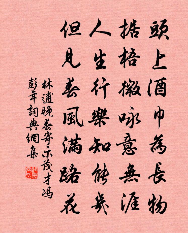詩詞名句歷史字典書法欣賞書法字典國語詞典說文解字康熙字典古漢語字典標 題 作 者 詩 句 晚春寄示茂才馮彭年作者:林逋 朝代:宋代晚春寄示茂才馮彭年原文頭上酒巾為長物,據梧微詠意無涯。人生行樂知能幾,但見春風滿路花。詩詞問答問:晚春寄示茂才馮彭年的作者是誰?答:林逋問:晚春寄示茂才馮彭年寫於哪個朝代?答:宋代林逋晚春寄示茂才馮彭年書法欣賞晚春寄示茂才馮彭年書法作品詩詞推薦劉園九日燕同寮效陶謝體吳泳〔宋代〕霜林剪生綃,煙樹織晴綺。萬寶新告成,百工亦休止。嘉辰屬南山,彡事如栗里。謬為陶長官,寧惜此中醉。良朋贈趙侍御張說〔唐代〕祿放跡異端,偏荒事同蹇。苟忘風波累,俱會雲壑踐。險式壓西湖,僑廬對南峴。夜樓江月入,朝幌山雲卷。山勢偈頌一百二十三首釋普度〔宋代〕正覺山前,明星皎皎。夜半打失鼻孔,將謂一了便了。中竺看來,有些短處,不說也好。開得眼來天大嘵。壽周樞使楊炎正〔宋代〕文武今三相,東西冠兩班。公身為九鼎,國勢屹南山。經濟談間了,昇平掌上還。腐儒徒醉頌,窮老愧心顏。秋風引曹勛〔宋代〕閶闔天門開九重,金莖肅蕭搖霜風。吳江木落龍庭空,雞鳴起舞何匆匆。胡塵高翳山□東,邊聲夜入烏號弓。寄姚諫議劉得仁〔唐代〕鳴鞭靜路塵,籍籍諫垣臣。函疏封還密,爐香侍立親。篋多臨水作,窗宿臥雲人。危坐開寒紙,燈前起草頻。允成載酒見過作此示之李流謙〔宋代〕乘興初非約,相過不作難。酒寬隨量飲,花好盡情看。春已無多子,人誰有此歡。明朝各行身,塵土上征鞍。賞心亭曹組〔宋代〕白鷺洲邊蘆葉黃,石頭城下水茫茫。江山不管事興廢,今古坐令人感傷。六代豪華空處所,千秋城闕委荒涼。空餘梅花林逋〔宋代〕小園煙景正淒迷,陣陣寒香壓麝臍。湖水倒窺疏影動,屋檐斜入一枝低。畫工空向閒時看,詩客休徵故事題。慚愧送秘上人游京皎然〔唐代〕共君方異路,山伴與誰同。日冷行人少,時清古鎮空。暖瓶和雪水,鳴錫帶江風。撩亂終南色,遙應入夢中。六代祖師畫像贊五祖大滿禪師釋正覺〔宋代〕奇女之兒,雙峰之嗣。傳衣世稱乎妙齒,栽松我愧乎頹齒。前後兩身,古今一心。孤鸞風舞玻璃鏡,長鯨月轉珊瑚詩二首趙與時〔宋代〕達人澄此心,肯為萬法起。眼看聲色塵,不直一杯水。和李生九日二首胡寅〔宋代〕騷客悲秋心易催,主人醪醴正時哉。登高何必仙家術,酬節聊憑笑口開。鳳嶺勝游詩自好,龍山高宴首空回。獨余雒城作羅隱〔唐代〕大鹵旌旗出洛濱,此中煙月已埃塵。更無樓閣尋行處,只有山川識野人。早得鑄金夸范蠡,旋聞垂釣哭平津。舊遊一春風雨太半有感陸游〔宋代〕忽忽春將老,寒暄尚未齊。雨昏雞唱晚,風惡鵲巢低。寫物才殊退,尋芳思欲迷。餘年不須較,只是死秦稽。頌古二十八首釋道川〔宋代〕罰錢出院,眾人皆見。有理難伸,風流滿面。直饒興化全提,未免令行一半。這一半,明眼衲僧點檢看。已亥雜詩 19龔自珍〔清代〕卿籌爛熟我籌之,我有忠言質幻師。觀理自難觀勢易,彈丸壘到十枚時。鷓鴣天(送試)史浩〔宋代〕曉日日童日龍花露稀。明光已報敞金扉。三千彩仗翔鸞舞,數百銀袍振鷺飛。開雉扇,正垂衣。奏篇初得上彤墀。和朱嚴留別王禹偁〔宋代〕之子有文行,常流竊比難。援毫秋露下,開卷古風寒。場屋推盟主,聲詩立將壇。論儒輕五霸,議古嫉三桓。師仰奉使契丹二十八首其二十二學士院端午帖子二蘇轍〔宋代〕九門已散秦醫藥,百辟初頒凌室冰。飲食祈君千萬壽,良辰更上辟兵繒。名句推薦思則有備,有備無患左丘明《左傳·襄公·襄公十一年》 冉冉年華吾自老。水滿汀洲,何處尋芳草。辛棄疾《蝶戀花·月下醉書雨岩石浪》 華而不實,恥也。左丘明《國語·晉語·秦伯享重耳以國君之禮》 酒逢知己飲,詩向會人吟。佚名《增廣賢文·上集》 長太息以掩涕兮,哀民生之多艱。屈原《離騷》 風驅急雨灑高城,雲壓輕雷殷地聲。劉基《五月十九日大雨》 天不再與,時不久留,能不兩工,事在當之。呂不韋《呂氏春秋·覽·孝行覽》 越鳥巢乾後,歸飛體更輕。李商隱《晚晴》 這次第,怎一個愁字了得!李清照《聲聲慢·尋尋覓覓》 千步虹橋,參差雁齒,直趨水殿。柳永《破陣樂·露花倒影》