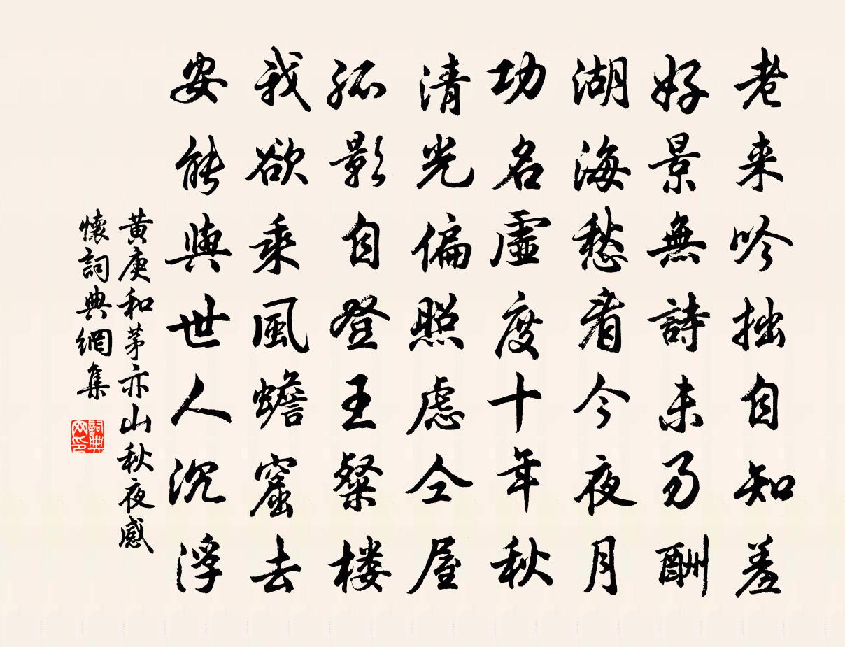 詩詞名句歷史字典書法欣賞書法字典國語詞典說文解字康熙字典古漢語字典標 題 作 者 詩 句 和茅亦山秋夜感懷作者:黃庚 朝代:宋代和茅亦山秋夜感懷原文老來吟拙自知羞,好景無詩未易酬。湖海愁看今夜月,功名虛度十年秋。清光偏照慮仝屋,孤影自登王粲樓。我欲乘風蟾窟去,安能與世人沉浮。詩詞問答問:和茅亦山秋夜感懷的作者是誰?答:黃庚問:和茅亦山秋夜感懷寫於哪個朝代?答:宋代黃庚和茅亦山秋夜感懷書法欣賞和茅亦山秋夜感懷書法作品詩詞推薦病中作陸游〔宋代〕苦雨侵衰骨,余寒著弊裘。病多辭社飲,貧甚輟春遊。日日親蔬圃,時時弄釣舟。回頭語造物,與子兩無求。蓬萊客馬鈺〔元代〕熬煎急。熬煎煎逼熬煎客。熬煎客。妻男魔障,妙玄牆隔。遇予便把清涼測。清涼路上難緣溺。難緣溺。氣通和氣黃君輓詞樓鑰〔宋代〕積慶源流遠,鄉評數大門。吏才堪世用,心事與誰論。骯髒才三徑,淒涼遽九原。傳家五男子,留眼看騰騫。送汪時法歸金華呂祖儉〔宋代〕歸去兒曹欲與言,相思切處莫窺園。吾宗事業無多子,守得簞瓢始見根。和柯東海趣歸韻陳宓〔宋代〕塵土三年事一官,歸心如馬脫鞿鞍。莫嫌頭髮半斑白,留得雙眸看歲寒。月岩曾豐〔宋代〕岩腹刳為半月形,全功天且不能成。勿嗟圓處便生缺,猶幸晦中堪養明。更朔還多終有望,受虧已久得無盈。願言壬辰過鄂渚簡張子直總乾二首李曾伯〔宋代〕一自檀溪把酒余,年來夷路崎嶇。棲頭落日人空老,局面西風事頓殊。故國山容增黯淡,舊時柳色半荒蕪。草堂想宋傳道輓詞二首韓元吉〔宋代〕留落東州彥,相期幸卜鄰。筒詩餘唱永,樽酒記情親。舊國歸無日,諸鄉見有人。佳城千載恨,雪涕楚江濱。送李先輩罷官之四明趙湘〔唐代〕官滿鶴衣輕,全家在四明。上船秋月白,到岸海山青。藥妙初痊病,詩高舊振名。遙思落帆處,太守出郊迎。善惡吟邵雍〔宋代〕瞽鯀有子,堯舜無嗣。餘慶餘殃,何故如此。送裴陟歸常州皇甫冉〔唐代〕夜雨須停棹,秋風暗入衣。見君嘗北望,何事卻南歸。宿北樂館陳潤〔唐代〕欲眠不眠夜深淺,越鳥一聲空山遠。庭木蕭蕭落葉時,溪聲雨聲聽不辨。溪流潺潺雨習習,燈影山光滿窗入。棟里十月十五日觀月黃樓席上次韻蘇軾〔宋代〕中秋天氣未應殊,不用紅紗照座隅。山下白雲橫匹素,水中明月臥浮圖。未成短棹還三峽,已約輕舟泛五湖。為問頌古十一首釋有權〔宋代〕秀才覓火和煙得,長沙賣石著雲饒。欲知千佛居何土,贏得詩禪價轉高。晚雲釀雨二首楊萬里〔宋代〕昨來一雨斷人行,恰則晴時雲又生。梅月如何休得雨,麥秋卻是要它晴。陳佐藏之溫陵劉克莊〔宋代〕蔚郁相門望,新書在所銜。昔隨翁出宰,今見子封男。大錄鶩行至,遺民馬首參。擊鮮良不惡,何日返槐庵。江城子張泌〔唐代〕碧闌乾外小中庭,雨初晴,曉鶯聲。飛絮落花,時節近清明。睡起捲簾無一事,勻面了,沒心情。浣花溪上見卿卿金線草舒岳祥〔宋代〕金線比方渾未盡,玉函收錄尚多遺。盈盈蜂蝶菩提葉,裊裊蜻蜓菡萏枝。寒女有針縫不得,山人無袞補何為。芝莖濟川阻雪九月二十七日客況 其二王冕〔元代〕濟州城南寒雪飛,濟州城北凍成圍。客情自古不稱意,世事於今轉覺非。白馬少年頻喚酒,黑紗老婦泣無衣。逢郵朱東父作室袁說友〔宋代〕貪夫築室齊雲湄,滿溢既死不可持。佳哉高人世念薄,丈室緝綴如繭絲。門前流水照明月,門裡有詩清更絕。汲泉名句推薦如何肯到清秋日,已帶斜陽又帶蟬。李商隱《柳》 綠葉素榮,紛其可喜兮。屈原《九章》 善無主於心者不留,行莫辯於身者不立。墨子《墨子·02章 修身》 汴水流,泗水流,流到瓜州古渡頭。吳山點點愁白居易《長相思·汴水流》 家有常業,雖飢不餓;國有常法,雖危不亡。韓非及後人《韓非子·飾邪》 那裡有鬧紅塵香車寶馬?祗不過送黃昏古木寒鴉。王磐《古蟾宮·元宵》 寵錫從仙禁,光華出漢京。張九齡《奉和聖制送尚書燕國公赴朔方》 一寸柔腸情幾許?薄衾孤枕,夢回人靜,徹曉瀟瀟雨。惠洪《青玉案·絲槐煙柳長亭路》 士為知己者死,女為悅己者容。劉向《戰國策·趙一·晉畢陽之孫豫讓》 德不孤,必有鄰。孔子弟子《論語·里仁篇》