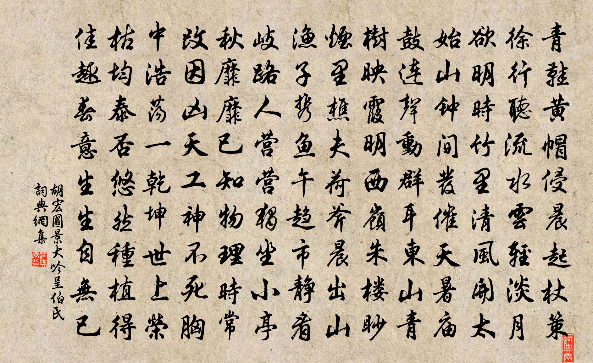 詩詞名句歷史字典書法欣賞書法字典國語詞典說文解字康熙字典古漢語字典標 題 作 者 詩 句 圃景大吟呈伯氏作者:胡宏 朝代:宋代圃景大吟呈伯氏原文青鞋黃帽侵晨起,杖策徐行聽流水。雲輕淡月欲明時,竹里清風開太始。山鍾間發催天暑,廟鼓連聲動群耳。東山青樹映霞明,西嶺朱樓眇煙里。樵夫荷斧晨出山,漁子攜魚午趨市。靜看岐路人營營,獨坐小亭秋靡靡。已知物理時常改,因凶天工神不死。胸中浩蕩一乾坤,世上榮枯均泰否。悠然種植得佳趣,春意生生自無已。詩詞問答問:圃景大吟呈伯氏的作者是誰?答:胡宏問:圃景大吟呈伯氏寫於哪個朝代?答:宋代胡宏圃景大吟呈伯氏書法欣賞圃景大吟呈伯氏書法作品詩詞推薦陝州河亭陪韋五大夫雪後眺望因以留別與韋有…遷貶而歸劉禹錫〔唐代〕雪霽太陽津,城池表里春。河流添馬頰,原色動龍鱗。萬里獨歸客,一杯逢故人。登高向西望,關路正飛塵。呈伯父元仲二首周麟之〔宋代〕干戈十年余,荏苒百憂至。誰憐齒未壯,遽失彩衣戲。捫心天不聞,空下千斛淚。藐然一星孤,未忍隨以逝。雨濕別山中友釋文珦〔宋代〕人生貴適意,窮達奚卟論。此意君能知,方喜吾道存。於心既莫逆,彼此俱忘言。胡為又當別,誰能不消魂。送丁元珍峽州判官歐陽修〔宋代〕為客久南方,西遊更異鄉。江通蜀國遠,山閉楚祠荒。油幕無軍事,清猿斷客腸。惟應陪主諾,不費日飛觴。胡使曾鞏〔宋代〕南傑鱗鱗多送北,北兵林林長備胡。胡使一來大梁下,塞頭彎弓士如無。折衝素恃將與相,大策合副艱難須。還來句釋曉瑩〔宋代〕胸中歷歷古兼今。送物寺丞赴辟秦州判官司馬光〔宋代〕征西大府開,後乘得高材。區脫烽煙靜,渠搜職貢來。隴雲低玉帳,羌舞奉金罍。信美從軍樂,修梧茂帝台。編聯偶作蘇籀〔宋代〕躭飫神奇致,思研理趣幽。崎嶇由考仿,勉勵似鉏耰。明耀鑒頻拭,醇精酒屢酘。編聯存隻字,解悟失全牛。曷可題法院常建〔唐代〕勝景門閒(開)對遠山,竹深松老半含煙。皓(皎,素)月殿中三度磬,水晶宮裡一僧禪。旦氣詩陳普〔宋代〕書氣如大霧,蒙我大明鏡。主人莫如鄉,奴柰竊權柄。不能巍巍蒞,惟聽紛紛命。是非既昧瞀,操執豈中正。不惟次韻三首曾幾〔宋代〕御冬無過酒,得酒政應難。可愛惟晴日,相依度歲寒。雖非挾纊坐,且作擁爐看。飢亦何堪忍,斜陽掛食單。狗馬辭楊維楨〔元代〕狗有烏龍癘馬有的盧,的盧徇主兮烏龍食奴。於呼交之借兮無解,孤之託兮無嬰。吁嗟烏龍兮狗之解,吁嗟的盧兮老而健貧而詩自志其喜八首方回〔宋代〕清而貧最樂,健以老何傷。短髮蓬加雪,貞心菊耐霜。凍吟乏薪炭,醉臥混衾裳。冰檗憐兒女,年皆四十強。次韻李參政和薛秘書詩見寄魏了翁〔宋代〕寒城眺晚牛羊下,翠盪涵秋鸛鶴飛。風雨燈前話疇昔,應懷坡潁不成歸。憶鄉歌四首馮夢得〔宋代〕儂是劍南人,慣識故鄉好。綠葉接紅花,輝映綏安道。曾相士約過意釣答以絕句趙蕃〔宋代〕為竹作亭還斫竹,取詩名榜更題詩。歸來十日未一往,聊待蕭然雨後時。依韻和酬順安使君王大觀見寄之什強至〔宋代〕蒼鬢蕭疏並曲台,北門笑口屢同開。仲升投筆燕南去,王粲從軍陝右來。月冷戍樓悲短笛,天寒戎幕賴深杯。更為酬夢得窮秋夜坐即事見寄白居易〔唐代〕焰細燈將盡,聲遙漏正長。老人秋向火,小女夜縫裳。菊悴籬經雨,萍銷水得霜。今冬暖寒酒,先擬共君嘗。奉和齊竟陵王郡縣名詩范雲〔南北朝〕撫戈金城外。解佩玉門中。白馬騰遠雪。蒼松壯寒風。臨涇方辨渭。安夷始和戎。取禾廣田北。驅獸飛狐東。新城拔蒲二首佚名〔〕青蒲銜紫茸,長葉復從風。與君同舟去,拔蒲五湖中。朝發桂蘭渚,晝息桑榆下。與君同拔蒲,竟日不成把。名句推薦好夢欲成還又覺,綠窗但覺鶯啼曉。施耐庵《蝶戀花·一別家山音信杳》 蒼蒼竹林寺,杳杳鐘聲晚。劉長卿《送靈澈上人》 鐵馬紅旗寒日暮,使君猶寄邊城。周紫芝《臨江仙·送光州曾使君》 說法者無法可說。是名說法。鳩摩羅什譯《金剛經·非說所說》 遼東小婦年十五,慣彈琵琶解歌舞。李頎《古意》 無情燕子,怕春寒、輕失花期。晁沖之《漢宮春·梅》 去年五月黃梅雨,曾典袈裟糴米歸。與恭《思母》 忽大風起,塵氣莽莽然,城市依稀而已。蒲松齡《山市》 非我而當者,吾師也;是我而當者,吾友也。荀子《荀子·修身》 至長反短,至短反長,天之道也。呂不韋《呂氏春秋·論·似順論》