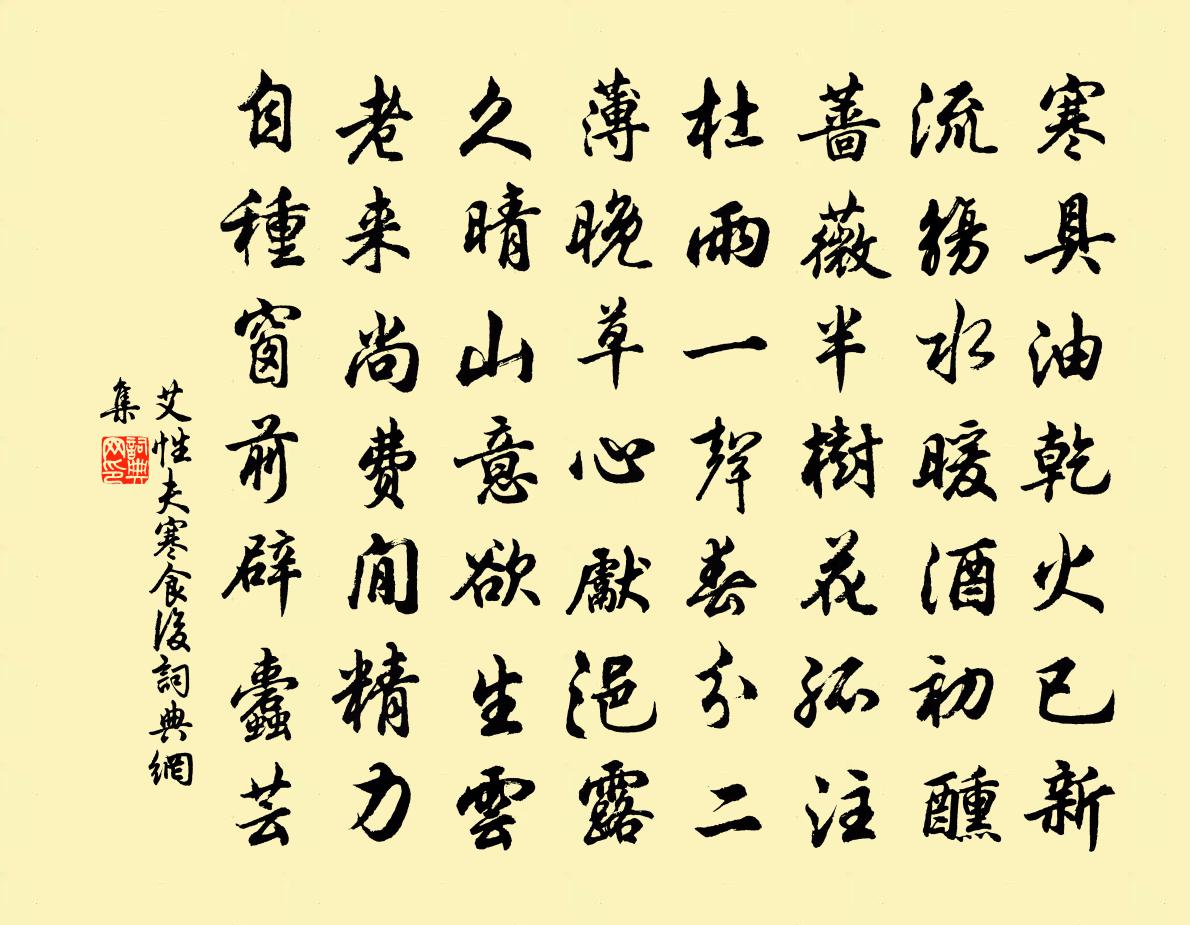 詩詞名句歷史字典書法欣賞書法字典國語詞典說文解字康熙字典古漢語字典標 題 作 者 詩 句 寒食後作者:艾性夫 朝代:宋代寒食後原文寒具油乾火已新,流觴水暖酒初醺。薔薇半樹花孤注,杜雨一聲春分二。薄晚草心先浥露,久晴山意欲生雲。老來尚費閒精力,自種窗前辟蠹芸。詩詞問答問:寒食後的作者是誰?答:艾性夫問:寒食後寫於哪個朝代?答:宋代問:寒食後是什麼體裁?答:七律艾性夫寒食後書法欣賞寒食後書法作品詩詞推薦送儲十二還莊城綦毋潛〔唐代〕西坂何繚繞,青林問子家。天寒噪野雀,日晚度城鴉。寂歷道傍樹,曈曨原上霞。茲情不可說,長恨隱淪賒。和子厚弟九日登魏文振亭園七首王之道〔宋代〕雨余東北望銀屏,一帶寒山映骨清。誰道西風能換物,染紅楓樹亦多情。頌古釋道顏〔宋代〕拄杖頭邊無孔竅,大千沙界猶嫌小。毗婆尸佛早留心,直至而今不得妙。郊廟歌辭。祀九宮貴神樂章。豫和佚名〔唐代〕於昭上穹,臨下有光。羽翼五佐,周流八荒。誰其饗之,時文對揚。虞經夏典,茲禮未遑。黑帝旋馭,青躔導日。贈劉仲固胡寅〔宋代〕恭惟事契逾三紀,一醉昇州十八年。回念壯遊多契闊,欣逢情話重留連。珠庭骨相封侯在,金奏詩章落筆傳。預恐次韻穆父尚書侍祠郊丘,瞻望天光,退而相慶蘇軾〔宋代〕千章杞梓蔭雲天,樗散誰收老鄭虔。喜氣到君浮白里,豐年及我掛冠前。令嚴鐘鼓三更月,野宿貔貅萬灶煙。太息贈鄭交黃庭堅〔宋代〕高居大士是龍象,草堂丈人非熊羆。不逢壞衲乞香飯,唯見白頭垂釣絲。鴛鴦終日愛水鏡,菡萏晚風雕舞衣。開徑浣溪沙晏幾道〔宋代〕浦口蓮香夜不收。水邊風裡欲生秋。棹歌聲細不驚鷗。涼月送歸思往事,落英飄去起新愁。可堪題葉寄東樓。萬州范成大〔宋代〕晨炊維下岩,晚酌艤南浦。波心照州榜,雲腳響衙鼓。前山如屏牆,得得正當戶。西江朝宗來,循屏復東去。官曹岳陽樓望洞庭甄龍友〔宋代〕風定空澄氣渾然,恍如太極未分前。只因有浪知為水,若遇無雲總是天。舊說君山嶷帝樂,新同老木識飛仙。而今木蘭花慢 桃源梁寅〔元代〕愛山中日月,春漸去,又還來。望水繞人家,雲生窗戶,岫轉峰迴。層層絳桃千樹,似丹霞、散綺映樓台。世上從車軒花時將過感懷陸游〔宋代〕小軒風月得婆娑,盡付流年與嘯歌。細數一春今過半,正令百歲亦無多。還家常恐難全璧,閱世深疑已爛柯。只欲宋玉劉筠〔宋代〕楚國驕荒日已深,山川朝暮劇登臨。曾傷積毀亡師道,只托微辭盪主心。江草東西多恨色,峽雲高下結層陰。潘郎北庭作岑參〔唐代〕雁塞通鹽澤,龍堆接醋溝。孤城天北畔,絕域海西頭。秋雪春仍下,朝風夜不休。可知年四十,猶自未封侯。和運司園亭小亭孫甫〔宋代〕蕭森玉谿南,小亭屹相向。使華雙軺車,禪境二方丈。固將物理齊,室隘志自廣。松竹周四檐,足以備幽賞。武昌懷古十詠西塞白玉蟾〔宋代〕落盡桃花水滿湖,西山西塞長新蒲。斜風細雨今如許,青笠綠蓑誰又無。聖主龍飛邦有道,醉仙睡到日高梧。何時春日北園早起李復〔宋代〕雨斷雲猶在,風回氣已明。林花含宿潤,露沼散余清。喜靜心常澹,居閒意寡營。流光隨轉盼,所向達吾生。送芮國器察院漕廣東周必大〔宋代〕星聚曾尊德,箕張客避風。別離雙鬢異,邂逅一尊同。五嶺皇華使,扁舟漁釣翁。江分鴻不到,書札若為通。以近詩寄尤運使趙蕃〔宋代〕求識尤太史,泛舟維豫章。秋天值搖落,行色況蒼茫。竟乏驚人句,莫升君子堂。學詩雖老矣,獲擬遍諸方。滿江紅蔣捷〔宋代〕秋本無愁,奈客里、秋偏岑寂。身老大、忺敲秦缶,懶移陶甓。萬誤曾因疏處起,一閒且向貧中覓。笑新來、多事名句推薦掛席幾千里,名山都未逢。孟浩然《晚泊潯陽望廬山》 踏破鐵鞋無覓處,得來全不費工夫。馮夢龍《醒世恆言·卷十三》 寒食時看郭外春,野人無處不傷神。雲表《寒食詩》 風風雨雨梨花,窄索簾櫳,巧小窗紗。喬吉《折桂令·客窗清明》 酒意詩情誰與共?淚融殘粉花鈿重。李清照《蝶戀花·暖雨晴風初破凍》 竹馬踉蹡沖淖去,紙鳶跋扈挾風鳴。陸游《觀村童戲溪上》 遠去不逢青海馬,力窮難拔蜀山蛇。李商隱《詠史二首·其二》 建官惟賢,位事惟能。佚名《尚書·周書·武成》 雲邊雁斷胡天月,隴上羊歸塞草煙。溫庭筠《蘇武廟》 此情可待成追憶?只是當時已惘然。李商隱《錦瑟》