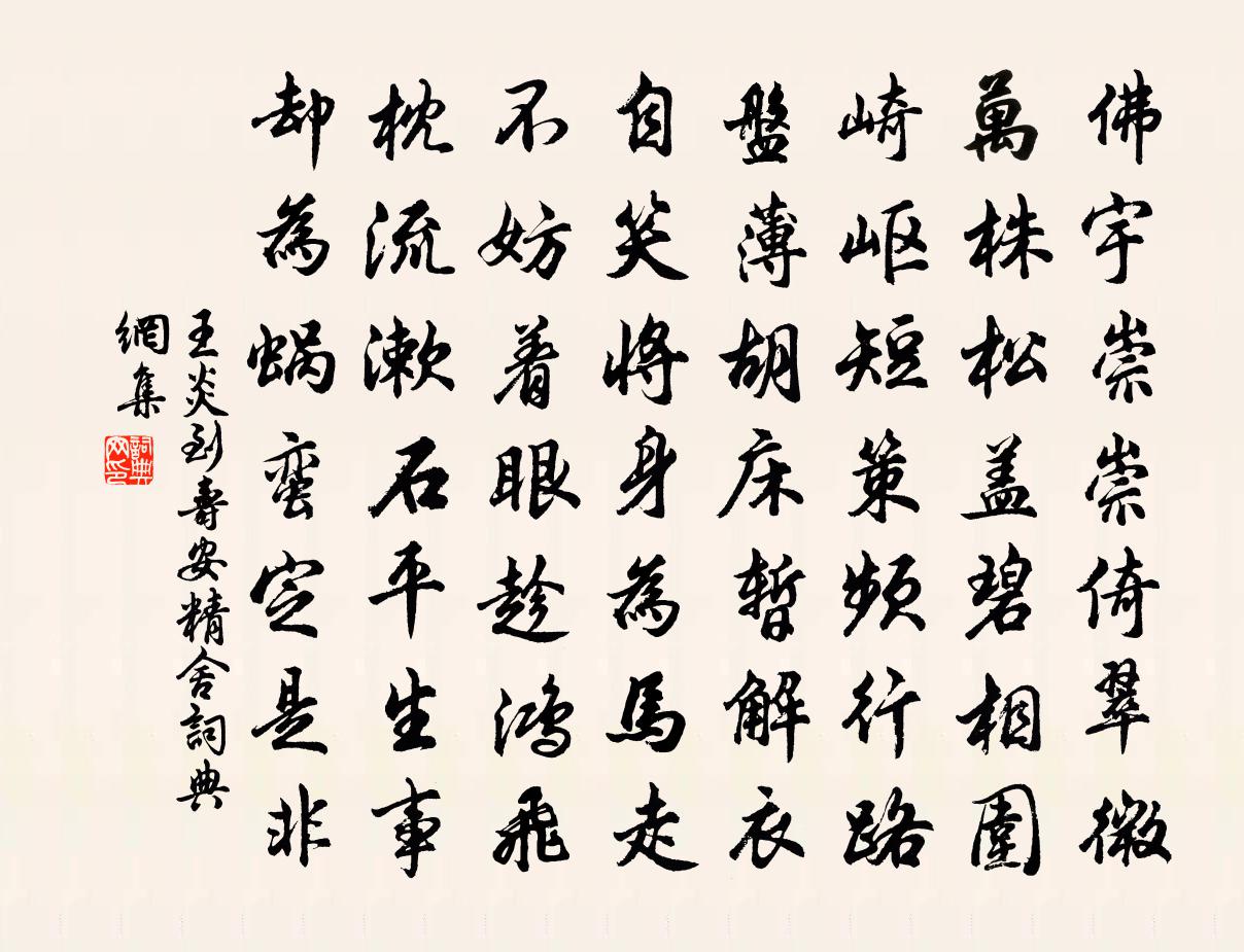 詩詞名句歷史字典書法欣賞書法字典國語詞典說文解字康熙字典古漢語字典標 題 作 者 詩 句 到壽安精舍作者:王炎 朝代:宋代到壽安精舍原文佛宇崇崇倚翠微,萬株松蓋碧相圍。崎嶇短策頻行路,盤薄胡床暫解衣。自笑將身為馬走,不妨著眼趁鴻飛。枕流漱石平生事,卻為蝸蠻定是非。詩詞問答問:到壽安精舍的作者是誰?答:王炎問:到壽安精舍寫於哪個朝代?答:宋代王炎到壽安精舍書法欣賞到壽安精舍書法作品詩詞推薦湖山堂董嗣杲〔宋代〕彩檻雕闌倚地仙,南堂深架北堂先。湖光十里饒春日,山色三堤合霽煙。簾幕香傳歌扇底,鶯花影落酒旗邊。紅塵太上皇帝合端午帖子詞汪應辰〔宋代〕弦歌密意寄南風,豈易形容長養功。地厚天高何以報,祝堯惟有壽無窮。十用喜雨韻三首吳潛〔宋代〕喜極夫何恨不禁,五更霜角夜聲沈。滴殘塞北征夫淚,點碎江南遊子心。久客情懷愁似織,休官時候夢非簪。寶陀憶王孫王丹桂〔元代〕三田常用鐵牛耕。種得黃芽漸漸生。法雨時時澆灌頻。轉滋榮。採摘灞陵亭高蟾〔唐代〕一條歸夢朱弦直,一片離心白羽輕。明日灞陵新霽後,馬頭煙樹綠相迎。瑞鶴仙趙聞禮〔宋代〕客邊情味惡。花漏遠、春靜風鳴鳳鐸。空梁燕泥落。映柔紅微罥,海棠簾箔。愁鍾恨角。怕催人、黃昏索寞。擁吟望江南吳潛〔宋代〕家山好,不是撰虛名。世上盛衰常倚伏,天家日月也虧盈。退步是前程。且恁地,卷索了收繩。六宇五胡生口面,海棠次蘇子瞻韻趙汃夫〔宋代〕海棠別得一風光,恨不生香轉曲廊。春睡太真困未足,胭脂露冷濕紅妝。生查子·鞭影落春堤納蘭性德〔清代〕鞭影落春堤,綠錦鄣泥卷。脈脈逗菱絲,嫩水吳姬眼。齧膝帶香歸,誰整櫻桃宴。蠟淚惱東風,舊壘眠新燕。七言二首答黎教授歐陽修〔宋代〕共坐欄邊日欲斜,更將金蕊泛流霞。欲知卻老延齡藥,百草枯時始見花。竹枝歌孫嵩〔宋代〕漢世明妃猶有付,荒祠歌舞與招魂。胡琴好入巴渝曲,萬里還鄉釃酒樽。跋某人詩卷劉克莊〔宋代〕元祐賦律古,熙寧經義新。請君忙改藝,詩好誤終身。春日會飲懷丘思同林成之作四首又和前韻蘇頌〔宋代〕詩論心膽見天真,酒逐羈懷若有神。一夕所思惟我友,四時最樂是熙春。及第後歸覲,留別諸同年白居易〔唐代〕十年常苦學,一上謬成名。擢第未為貴,賀親方始榮。時輩六七人,送我出帝城。軒車動行色,絲管舉離聲。得意春中憶元二韋應物〔唐代〕雨歇萬井春,柔條已含綠。徘徊洛陽陌,惆悵杜陵曲。遊絲正高下,啼鳥還斷續。有酒今不同,思君瑩如玉。幽趣十二首鄭剛中〔宋代〕幽趣無人會,清閒五月中。魚跳荷葉綠,猿笑荔枝紅。撥竹看新月,鉤簾入好風。神仙赤松地,正恐自相通。句王安石〔宋代〕大木百圍生遠籟,朱玄三嘆有一音。卜運算元沈瀛〔宋代〕只管要參禪,又被禪縈繞。好笑西來老禿奴,賺了人多少。你待更瞞咱,咱也今知曉。只這喃喃說底人,又被傍人蚤晴發廣安軍,晚宿萍池村莊范成大〔宋代〕夜雨洗煩蒸,曉風薦清穆。雲頭聵鐵山,日腳迸金瀑。暑塗一日涼,遠客萬事足。羈人正奔波,觀者何陸續。翠蓋七夕詩何遜〔南北朝〕仙車駐七襄。鳳駕出天潢。月映九微火。風吹百合香。來歡暫巧笑。還淚已沾裳。依稀如洛汭。倐忽似高唐。別離名句推薦戚施不可使仰左丘明《國語·晉語·胥臣論教誨之力》 江涵雁影梅花瘦,四無塵、雪飛雲起,夜窗如晝。盧祖皋《賀新郎·挽住風前柳》 洛陽城裡見秋風,欲作家書意萬重。張籍《秋思》 一自胡塵入漢關,十年伊洛路漫漫。陳與義《詠牡丹》 秋至搗羅紈,淚滿未能開。江淹《悼室人》 盡教春思亂如雲,莫管世情輕似絮晏幾道《玉樓春·雕鞍好為鶯花住》 晚妝初了明肌雪,春殿嬪娥魚貫列。李煜《木蘭花·晚妝初了明肌雪》 天降下民,作之君,作之師。惟曰其助上帝,寵之。孟子《孟子·梁惠王章句下·第三節》 烏鵲倦棲,魚龍驚起,星斗掛垂楊。陳亮《一叢花·溪堂玩月作》 怒髮衝冠,憑欄處、瀟瀟雨歇。岳飛《滿江紅·寫懷》