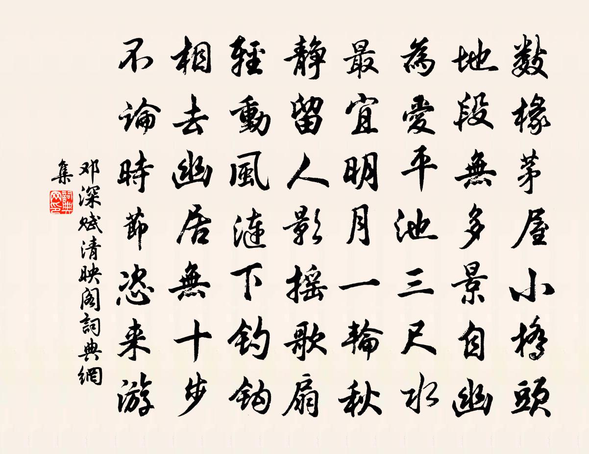 詩詞名句歷史字典書法欣賞書法字典國語詞典說文解字康熙字典古漢語字典標 題 作 者 詩 句 賦清映閣作者:鄧深 朝代:宋代賦清映閣原文數椽茅屋小橋頭,地段無多景自幽。為愛平池三尺水,最宜明月一輪秋。靜留人影搖歌扇,輕動風漣下釣鉤。相去幽居無十步,不論時節恣來游。詩詞問答問:賦清映閣的作者是誰?答:鄧深問:賦清映閣寫於哪個朝代?答:宋代鄧深賦清映閣書法欣賞賦清映閣書法作品詩詞推薦吟元郎中白須詩兼飲雪水茶因題壁上白居易〔唐代〕吟詠霜毛句,閒嘗雪水茶。城中展眉處,只是有元家。西華道中張耒〔宋代〕我行陳許郊,千里平若掌。居民雜荊榛,耕少地多曠。野兔乍跳奔,驚鳶或高揚。喬林多疾風,寒澗有餘漲。棘籬送僧之京師林逋〔宋代〕皇城十二衢,埃塵滿香裓。何以待歸期,山中桂花色。讀書至夜半燈盡欲睡慨然有感陸游〔宋代〕白髮蕭蕭老空谷,人嘆厄窮心自足。東郊曉射墮錦雉,北崦春耕叱黃犢。區區世事何足論,未死斷知常閉門。關河新晴項安世〔宋代〕幸甚乾逢甲,皤然雨變霜。彩衣雲漸衣,紋線日初長。預想慈懷動,先憑喜信將。背人三數鵲,飛去覺匆忙。環照閣口占呈德良李處權〔宋代〕高情接巾屨,雅志在丘壑。林疏見鳥下,池靜聞魚躍。歲月已屢改,風煙只如昨。我知造物心,遺子良不薄。畏途天竺道中許志仁〔宋代〕紫蘭念春風,日暮香更遠。澗道水平分,曲折渡清淺。飛花當面墮,顛倒落苔蘚。念此芳意闌,歸思紛莫遣。明德皇太后輓歌詞五首楊億〔宋代〕太姒徽音盛,長秋命數崇。黃圖分丙殿,玄象應軒宮。紀注無窮美,聲詩內助功。雲陽復土後,陵柏自悲風。偶成李清照〔宋代〕十五年前花月底,相從曾賦賞花詩。今看花月渾相似,安得情懷似往時!書仇遠吟卷後釋文珦〔宋代〕昔在英豀識仇遠,憶意別來陵谷變。死生契闊不相知,一十四年如過電。蓮花峰下得重逢,老色駸駸驚上面。袖出次韻陳勉仲登群山觀王之道〔宋代〕十年放江湖,親朋益疏散。不知跬步間,遊覽有奇觀。因君寄新詩,心目益淒斷。東城俯荻洲,下有魚鳥亂。想見浣溪沙晏幾道〔宋代〕日日雙眉斗畫長。行雲飛絮共輕狂。不將心嫁冶遊郎。濺酒滴殘歌扇字,弄花熏得舞衣香。一春彈淚說淒涼。題巫山廟劉滄〔唐代〕十二嵐峰掛夕暉,廟門深閉霧煙微。天高木落楚人思,山迥月殘神女歸。觸石晴雲凝翠鬢,度江寒雨濕羅衣。嬋娟訴衷情(宮怨)謝絳〔宋代〕銀缸夜永影長孤。香草續殘爐。倚屏脈脈無語,粉淚不成珠。雙粲枕,百嬌壺。憶當初。君恩莫似,秋葉無情,欲中秋黃池舟中獨酌五首陽枋〔宋代〕居家賞朋天常雨,遠客逢秋月倍明。世事美時難兩得,化工好處少雙成,詩如遇興須重賦,酒若逢辰且再傾。不是仲春有懷張栻〔宋代〕楚翠亭邊花正開,道鄉台下石崔嵬。主人今有此客否,客亦思君日百回。獨夜詞崔公遠〔唐代〕晴天霜落寒風急,錦帳羅幃羞更入。秦箏不復續斷弦,回身掩淚挑燈立。登禪罔寺望和虞記室詩何遜〔南北朝〕南望南郭門。拱樹稍雲密。北窗北溱道。重樓霧中出。接樹隱高蟬。交枝承落日。光陰不可舍。懷抱何由悉。田侍中宴席王建〔唐代〕香熏羅幕暖成煙,火照中庭燭滿筵。整頓舞衣呈玉腕,動搖歌扇露金鈿。青蛾側座調雙管,彩鳳斜飛入五弦。雖是言志唐寅〔明代〕不鍊金丹不坐禪,不為商賈不耕田。閒來寫就青山賣,不使人間造孽錢!名句推薦馬逢伯樂而嘶,人遇知己而死。羅貫中《三國演義·第六十回》 日往菲薇,月來扶疏。左思《三都賦》 秋色冷並刀,一派酸風卷怒濤。陳維崧《南鄉子·邢州道上作》 晚來天欲雪,能飲一杯無?白居易《問劉十九》 馬色雖不同,人心本無隔。李白《君馬黃》 無由持一碗,寄與愛茶人。白居易《山泉煎茶有懷》 凡兵家之法,要在應變,好在知兵,舉動必先料敵。佚名《百戰奇略·第十卷·變戰》 從此信音稀,嶺南無雁飛。李師中《菩薩蠻·子規啼破城樓月》 人到情多情轉薄,而今真箇不多情。納蘭性德《山花子·風絮飄殘已化萍》 終日兩相思。為君憔悴盡,百花時。溫庭筠《南歌子·倭墮低梳髻》