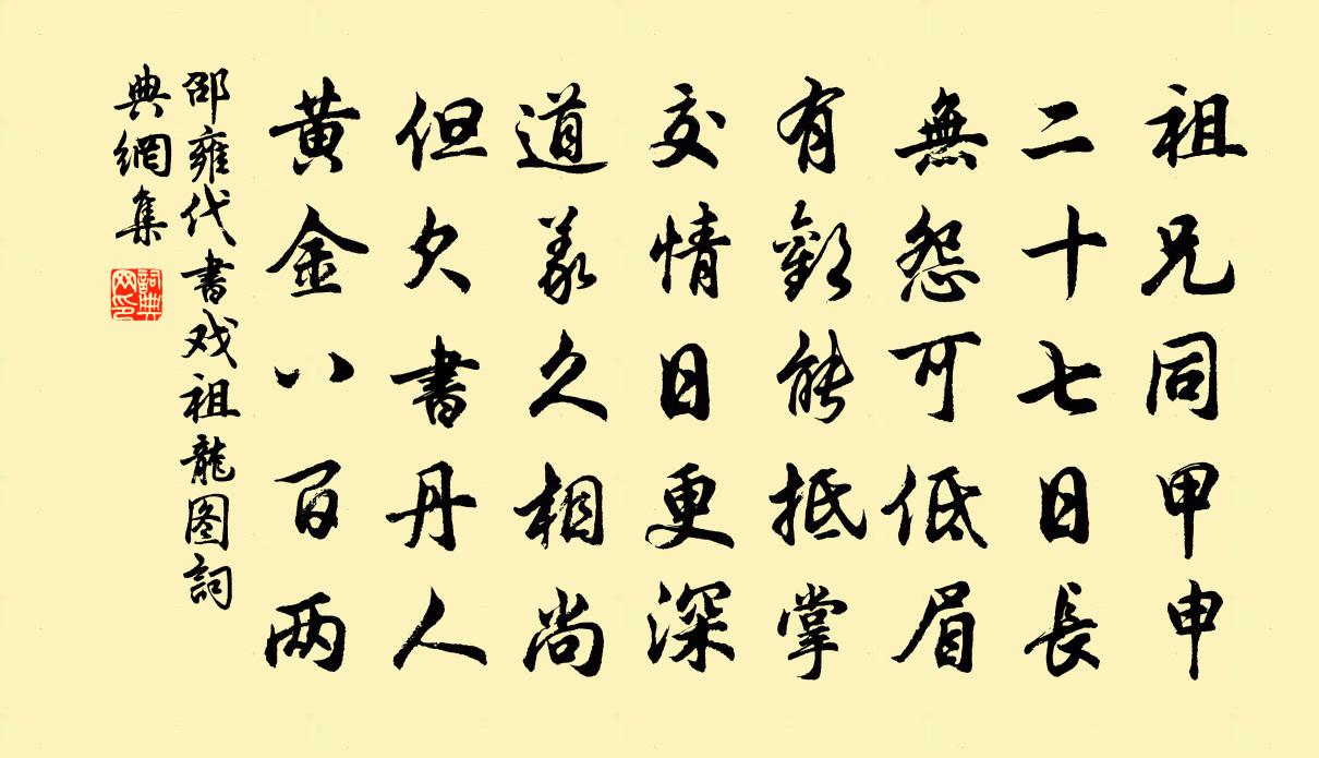 詩詞名句歷史字典書法欣賞書法字典國語詞典說文解字康熙字典古漢語字典標 題 作 者 詩 句 代書戲祖龍圖作者:邵雍 朝代:宋代代書戲祖龍圖原文祖兄同甲申,二十七日長。無怨可低眉,有歡能抵掌。交情日更深,道義久相尚。但欠書丹人,黃金八百兩。詩詞問答問:代書戲祖龍圖的作者是誰?答:邵雍問:代書戲祖龍圖寫於哪個朝代?答:宋代邵雍代書戲祖龍圖書法欣賞代書戲祖龍圖書法作品詩詞推薦奉酬於中丞登越王樓見寄之什楊牢〔唐代〕劍外書來日,驚忙自折封。丹青得山水,強健慰心胸。事少勝諸郡,江回見幾重。寧悲久作別,且似一相逢。詩合郢城西樓吟(一作張繼詩)郎士元〔唐代〕連山盡處水縈迴,山上戍門臨水開。朱欄直下一百丈,日暖游鱗自相向。昔人愛險閉層城,今日愛閒江復清。沙洲落花李山甫〔唐代〕落拓東風不藉春,吹開吹謝兩何因。當時曾見笑筵主,今日自為行路塵。顏色卻還天上女,馨香留與世間人。明年雜感陸游〔宋代〕自古文章與命仇,功名身外更悠悠。一從識得元無事,窮死逢人不說愁。題竹石鄭燮〔清代〕咬定青山不放鬆,立根原在破岩中;千磨萬擊還堅韌,任爾東西南北風。點絳唇(六月十四日夜,與社友泛湖過西陵橋,已子夜矣)史達祖〔宋代〕山月隨人,翠苹分破秋山影。釣船歸盡。橋外詩心迥。多少荷花,不蓋鴛鴦冷。西風定。可憐潘鬢。偏浸秦台鏡。上已日約同僚過蟆頤晚視新開橫江堰魏了翁〔宋代〕朏魄雙交氣候新,古今為樂屬茲辰。蘭堂坐上皆豪逸,韋曲水邊多麗人。雇我未能真免俗,邀賓聊復共行春。卻因南鄉子王哲〔元代〕物物要休休。打破般般是徹頭。認得本來真面目,修修。一個靈芽穩穩求。火里好行舟。焰裏白蓮素臉幽。復郁風送李知章下第歸河北晁補之〔宋代〕鬥雞擊劍鄴王台,萬古英雄死不埋。子去悲歌宜有和,露螢白首亦常材。再次武公望雪梅韻五首廖行之〔宋代〕休論青瑣與黃扉,只有西湖不受欺。每向冰霜見全操,笑渠長夏受蒸炊。句晏殊〔宋代〕祭畢崇壇冷玉球,月斜星澹思悠悠。見諸公唱和暮春詩軸次韻作九首晁說之〔宋代〕嘆惜芳菲盡,香腮越女紅。簾垂啼鳥散,鐿掩舞鸞空。梅豆嬌含雨,蓴絲懶倚風。高歌君輩在,老子柰途窮。再和前韻答賦五首魏了翁〔宋代〕甫田之田驕驕莠,大國之郊濯濯山。養且難成摧則折,寧居材與不材間。梅花引向子諲〔宋代〕花如頰。梅如葉。小時笑弄階前月。最盈盈。最惺惺。閒愁未識、無計定深情。十年空省春風面。花落花開不相見斛律丞相司馬光〔宋代〕君臣日荒宴,歌舞諱言愁。老相猶當國,疆鄰不敢謀。謠言雖未出,奸謗已先流。誰察忠臣意,通宵抱膝憂。侍香金童蔡伸〔宋代〕寶馬行春,緩轡隨油壁。念一瞬、韶光堪重惜。還是去年同醉日。客里情懷,倍添悽惻。記南城、錦徑名園曾遍歷卞壺忠教堂錢汝元〔宋代〕哀哉戰死國門邊,忠孝千年獨兩全。蓋有完軀保妻子,誕謾奏凱說麋捐。登滕王閣曾豐〔宋代〕落霞未厭我來頻,一度來觀一度新。出沒無時鷗弄暖,飛鳴不禁鵲思春。物華幾換江如故,沙界常空世自塵。料得鶴鳴亭絕句四首辛棄疾〔宋代〕安石榴花翠竹枝,婆娑其下更何為。溪流自有無聲處,鶴舞不如閒立時。彥桓奉檄將行同飯素於龍泉寺李復〔宋代〕西江吸水試龐翁,再訪只園問色空。古殿香寒消宿篆,晴林葉暗退殘紅。衰年再乞千家飯,逸馭初乘五日風。曉去名句推薦閒鷺棲常早,秋花落更遲。錢起《谷口書齋寄楊補闕》 裳裳者華,其葉湑兮。佚名《裳裳者華》 佳辰強飲食猶寒,隱几蕭條戴鶡冠。杜甫《小寒食舟中作》 凌波不過橫塘路,但目送、芳塵去。賀鑄《青玉案·凌波不過橫塘路》 秀色掩今古,荷花羞玉顏。李白《西施 / 詠薴蘿山》 池上憑闌愁無侶。奈此個、單棲情緒。柳永《甘草子·秋暮》 誰謂傷心畫不成,畫人心逐世人情。韋莊《金陵圖》 公生明,偏生暗荀子《荀子·不苟》 誠之者,擇善而固執之者也。子思《中庸·第二十章》 小人不激不勵,不見利不勸。王通《中說·卷一·王道篇》