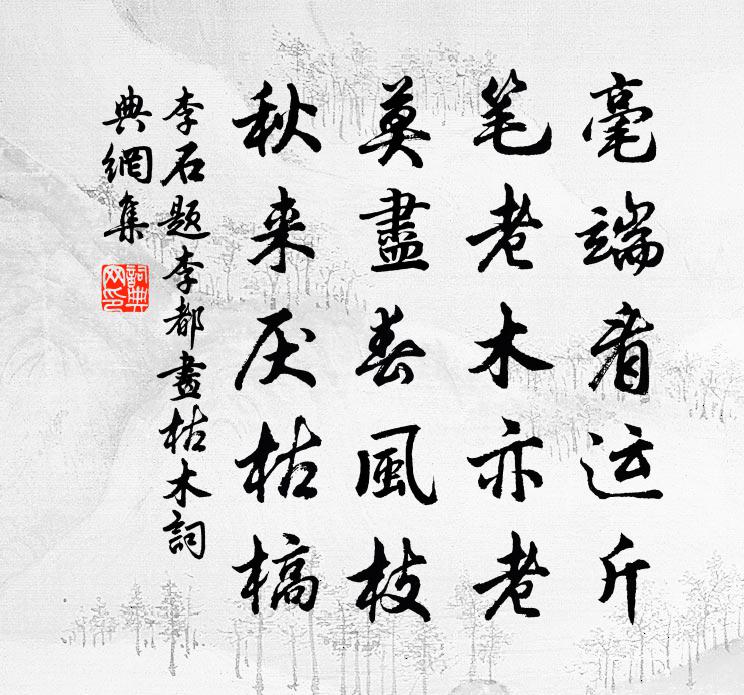 詩詞名句歷史字典書法欣賞書法字典國語詞典說文解字康熙字典古漢語字典標 題 作 者 詩 句 題李都畫枯木作者:李石 朝代:宋代題李都畫枯木原文毫端看運斤,筆老木亦老。莫盡春風枝,秋來厭枯槁。詩詞問答問:題李都畫枯木的作者是誰?答:李石問:題李都畫枯木寫於哪個朝代?答:宋代李石題李都畫枯木書法欣賞題李都畫枯木書法作品詩詞推薦小園春思陸游〔宋代〕重台諼草初離土,百葉緗梅已滿枝。莫道山家殺風景,也能醉倒向東籬。京庠校文和同考官王義山〔宋代〕文堂翕聚眾星明,剖蚌揚沙著意精。幸執楮毫陪末席,敢將文字品諸生。烘堂莫共賡酬笑,徹夜惟聞倡嘆聲。要使冬夜思里中多不濟者愴然有賦陸游〔宋代〕大耋年光病日侵,久辭微祿臥山林。雖無嘆老嗟卑語,猶有哀窮悼屈心。力薄不能推一飯,義深常願散千金。夜闌光宗皇帝輓詩程珌〔宋代〕厭聽人間樂,催成海上丹。雲車分白象,天仗高下鸞。梧野朝煙波,鹹陽莫日寒。龍舟宵濟處,清血漲紅乾。謾書周邦彥〔宋代〕麗日烘簾幔影斜,酒余春思托韶華。高樓不隔東南望,苦霧游雲莫謾遮。霽夜孔平仲〔宋代〕寂歷簾櫳深夜明,睡回清夢戍牆鈴。狂風送雨已何處?淡月籠雲猶未醒。早有秋聲隨墮葉,獨將涼意伴流螢。明朝蟾宮曲 夢中作鄭光祖〔元代〕敝裘塵土壓征鞍,鞭倦裊蘆花,弓箭蕭蕭,一逕入煙霞,動羈懷,西風禾黍,秋水蒹葭,千點萬點,老樹寒鴉,三句俞君錫〔宋代〕荒店難尋酒,長途半趁船。踏莎行何夢桂〔宋代〕夜月樓台,夕陽庭院。都將前事思量遍。當初識面待尋常,爭知識後情如線。只怕梅梢,參橫斗轉。催人歸去天涯雙溪釋紹曇〔宋代〕朝過正派競分支,那個源頭肯放低。堪笑截流人不薦,從東過了又從西。病中戲書陸游〔宋代〕五十忽過二,流年消壯心。避人便小疾,移竹喜微陰。洗瓮閒篘酒,焚香靜斫琴。鏡中青鬢在,切莫遣愁侵。句佚名〔唐代〕伴行惟瘦鶴,尋步入深雲。(《贈廖融》,見《紀事》)有感三首劉子翬〔宋代〕八葉炎圖茂,千齡聖主昌。農桑開漢域,禮樂煥周庠。晏粲三登樂,謳吟七閏長。徽名辭鏤玉,盛舉冠前王。夏日舊疢間發宋祁〔宋代〕老至非無素,憂來詎一源。河魚真得疾,床蟻誤成喧。嗲咀供晨匕,蹣跚逼夕軒。何宜忝蓬觀,祗合令文園。霜挫鴛鴦湖棹歌 之四十二朱彝尊〔清代〕繡線圖存陸晃遙,唐家花鳥棘針描。只愁玉面無入畫,須是傳神盛子昭。 題茅山觀許堅〔唐代〕常恨清風千載郁,洞天令得恣游遨。松楸古色玉壇靜,鸞鶴不來青漢高。茅氏井寒丹已化,玄宗碑斷夢仍勞。分明綺閣吟嘉州李使君命官妓段倩乞詩席上為賦李新〔宋代〕秋風瑟瑟吹簾旌,浪英碎玉秋渚平。綺閣美人抱明月,坐灑銀鉤錐畫雪。神情何似衛夫人,小年學歌風挽雲,錦囊四色詩范雲〔南北朝〕素鱗揚北渚。白水杜南宛。獻環潤玉塞。歸珠照瓊轅。奉和聖制賜諸州刺史以題座右張九齡〔唐代〕聖人合天德,洪覆在元元。每勞蒼生念,不以黃屋尊。興化俟群辟,擇賢守列藩。得人此為盛,咨岳今復存。降鑒泛月乾隆〔清代〕泛月宜何處,山莊景最新。夏宵含颯爽,塞水漾明淪。鶴唳孤松頂,鹿尋曲澗濱。錘峰玉台迥,溫嶠早痴人。名句推薦圓魄上寒空,皆言四海同。李嶠《中秋月二首·其二》 莊生曉夢迷蝴蝶,望帝春心托杜鵑。李商隱《錦瑟》 一生傲岸苦不諧,恩疏媒勞志多乖。李白《答王十二寒夜獨酌有懷》 月黑見漁燈,孤光一點螢。查慎行《舟夜書所見》 布帛尋常,庸人不釋。韓非及後人《韓非子·五蠹》 歡宴良宵好月,佳人修竹清風。吳文英《風入松·麓翁園堂宴客》 天長地久。天地所以能長且久者,以其不自生,故能長生。是以聖人後其身而身先,外其身而身存。非以其無私邪老子《老子·道經·第七章》 世間無限丹青手,一片傷心畫不成。高蟾《金陵晚望》 凡道字,重且舒。勿急疾,勿模糊。李毓秀《弟子規·信》 公天下之身,公天下之物,其唯至人矣!列子及其弟子《列子·楊朱》