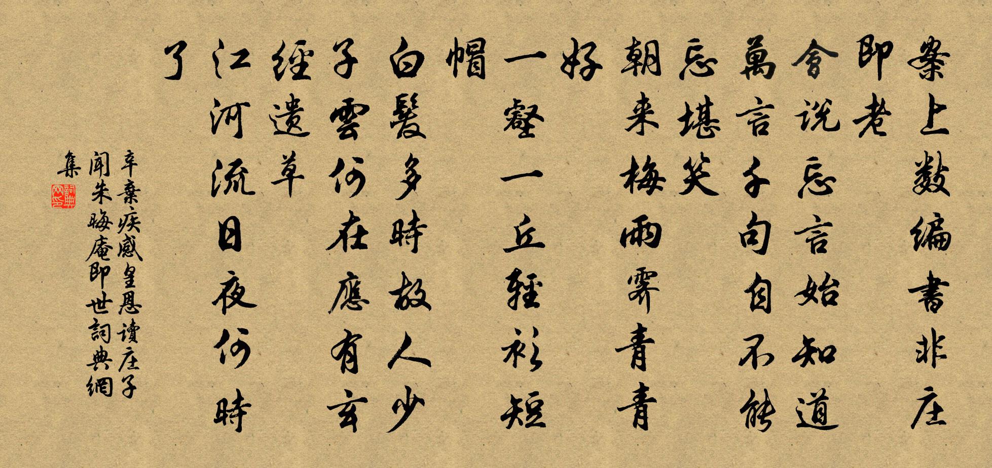 詞的上片“案上數編書”五句,是說自己熟讀老莊之書 ,口頭上也會說“忘言始知道”那一套玄理,而實際上未能做到“忘言 ”。“萬言千句 ,不自能忘堪笑 ”,作者是一位詞人,平時不廢吟詠,這不是與“忘言知道”產生明顯的矛盾了嗎?這幾句表面上似乎自嘲,實際上是對老莊哲學的否定,說明作者讀老莊之書乃意有所寄,而並非真的信仰老莊那一套。另一方面,就老莊本身來說,他們一面提倡什麼“忘言知道 ”,一面卻又著書立說,可見他們自己也不能做到“忘言 ”。從這兩層意思不難體會到作者這裡實際是在批評老莊的“忘言知道”是虛偽的。話說得非常深曲。“今朝梅雨霽,青天好”兩句,表面是說天氣,實際上是暗示作者對老莊哲學有了真正的體會,不受其惑,仿佛雨過天晴,豁然開朗一樣。這兩句以景喻情,不著痕跡。下片“一壑一丘”三句,寫自己放浪山林的隱退生涯 ,顯得語淡情深,似曠達而實哀傷;尤其是“白髮多時故人少”一句,感情真摯,語意深邃。“白髮多 ”,是感嘆歲月蹉跎 ,有壯志消磨的隱痛;“故人少”,則見故舊凋零,健在者已經寥寥無幾了。這一“多”一“少 ”,充分表達了作者嗟己悼人的情懷。這樣,詞的語氣也就自然地過渡到對朱熹這位故人的悼念 。“子云何在”四句,是以繼承儒家道統的揚雄相比,稱道朱熹的文章著述將傳之後世。由此可見,這首詞上下片貌離神合,命意深曲而仍有蹤跡可尋。從表面上看,正面悼念的話沒有幾句,其實,通篇都滲透著追悼之意。不論正說、反說、曲說、直說,其主旨都歸結到“立言不朽 ”。所以說,辛棄疾這首短小的悼人詞,既富有哲理意味,又顯得情致深長,在藝術手法上是相當成功的。