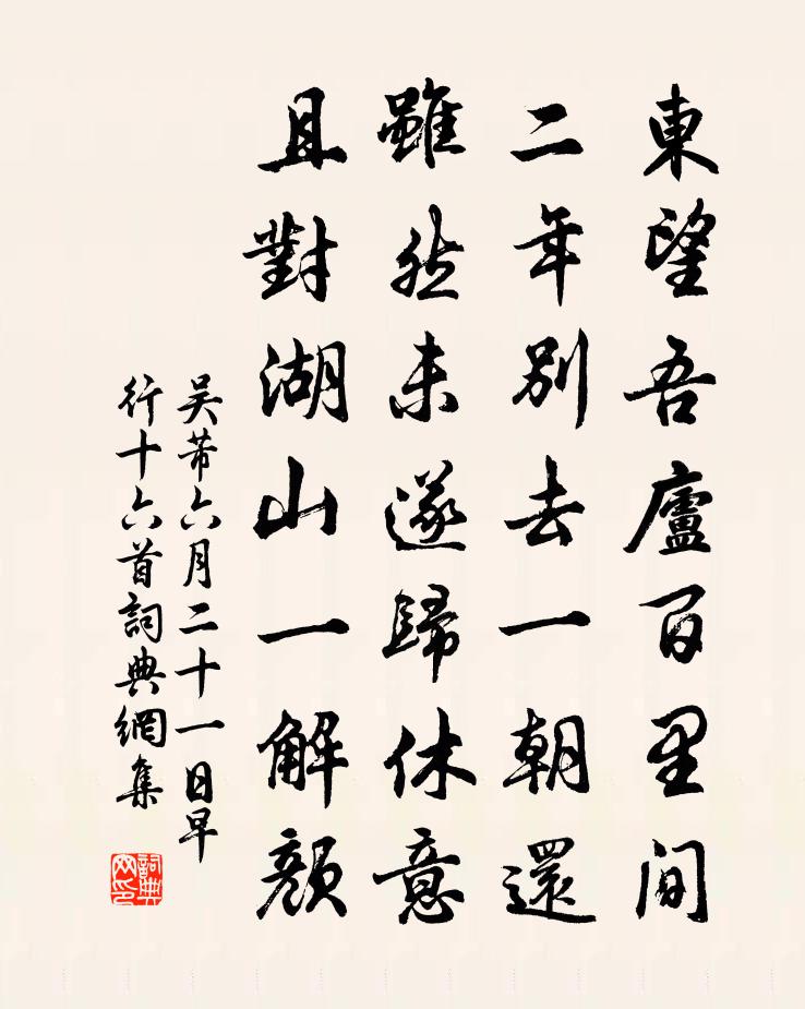 詩詞名句歷史字典書法欣賞書法字典國語詞典說文解字康熙字典古漢語字典標 題 作 者 詩 句 六月二十一日早行十六首作者:吳芾 朝代:宋代六月二十一日早行十六首原文東望吾廬百裡間,二年別去一朝還。雖然未遂歸休意,且對湖山一解顏。詩詞問答問:六月二十一日早行十六首的作者是誰?答:吳芾問:六月二十一日早行十六首寫於哪個朝代?答:宋代吳芾六月二十一日早行十六首書法欣賞六月二十一日早行十六首書法作品詩詞推薦偈頌四首釋了朴〔宋代〕洞山麻三斤,趙州庭前柏。滯貨賣不行,未免著潤色。五彩畫牛頭,便道是極則。七寶絡象身,此個更奇物。首尾吟邵雍〔宋代〕堯夫非是愛吟詩,詩是堯夫忖度時。先見固能無後悔,至誠方始有前知。已之欲處人須欲,心可欺時天可欺。只被中巖圜老像贊陸游〔宋代〕我遊中巖,拜師於床。巍巍堂堂,鳳舉龍驤。公住無為,訪我成都。雄辯縱橫,玉色敷腴。別未十日,梁木告摧。桃花洲徐良弼〔宋代〕歷騁禪扉到暮鍾,苦無勝事可深窮。歸來喚渡青溪上,唯有山桃滿路紅。雜劇·四丞相高會麗春堂王實甫〔元代〕第一折(沖末扮押宴官引祗從上,詩云)小帽虬頭裹絳紗,征袍砌就雁銜花。花根本艷公卿子,虎體鵷班將相家。謝彭守送花李石〔宋代〕別去名園走路塵,啼妝猶浥露痕新。且陪東閣諸侯客,粗了西湖一半春。試與清泉召魂魄,已驚黃蠟損精神。回頭人日吳明輔招不往方岳〔宋代〕江湖老我百無堪,懶過岫書太史談。雨腳又連人日暗,酒腸那似少年酣。一生出處龜藏六,萬事乘除狙賦三。且試題峻極中院法堂壁佚名〔宋代〕一團茅草亂蓬蓬,驀地燒天驀地空。爭似滿爐煨榾柮,漫騰騰地暖烘烘。晚夏夜簡程至釋惠崇〔宋代〕中夕坐清簟,繁星時複流。扇聲微變暑,井氣忽生秋。為客方經楚,思鄉欲上樓。雲山殊未返,相顧兩悠悠。梁廣文歸自襄陽作古樂章迎之陳造〔宋代〕自君之出矣,無心惜流光。但記燕營巢,俄復蜂割房。煩君驗節物,可孤北窗涼。戎葵一笑粲,竹萌十尺強。中運使寄酒清明日到以詩謝之張孝純〔宋代〕芳樽到日恰清明,似與嘉辰默計程。擬助林園延勝賞,肯容桃李落繁英。老來官爵渾無味,閒里杯盤卻有情。見說續姚梁公坐右銘貫休〔唐代〕善為爾諸身,行為爾性命。禍福必可轉,莫愨言前定。見人之得,如己之得,則美無不克。見人之失,如己之失,送程子方歸蜀仇遠〔宋代〕薄葺田園溧澤邊,鄉心常夢蜀山川。梨花知幾逢寒食,麥飯誰能灑墓田。矍鑠老翁輕客路,扶攜稚子上江船。東還元伯示清水泊之什因和酬黃庶〔宋代〕十年不踏故溪上,有時夢去千里游。每思魚行鑒中見,青衫手板如仇讎。秋風鱸肥美無價,莫怪張翰不可留。前日偶題陳宓〔宋代〕忿欲喪軀真狂死,孝忠致命勝偷生。此心一片陽剛德,莫遣纖毫暫不明。書事三首呈郎中機宜廉布〔宋代〕避地意何適,同時得二賢。才名誰敢並,蕭散或堪憐。濁酒寧非道,枯藤自會禪。尚須浮碧海,風月夜同船。謝趙生惠芍藥三首陳師道〔宋代〕從微至老走風塵,喜見鄉園第四春。獨舞東風醉西子,政緣無語郤宜人。緩轡入東宮門,望見漁浦山楊萬里〔宋代〕漁浦孤峰入九城,承華門裡最分明。馬頭看得山低去,夾道芙蓉紅露聲。首夏山中行吟祝允明〔明代〕梅子青,梅子黃,菜肥麥熟養蠶忙。山僧過嶺看茶老,村女當壚煮酒香。皇子生獻詩蔡挺〔宋代〕昨夜薰風入舜韶,君王未御正衙朝。陽暉已得前星助,陰滲潛隨夜雨消。名句推薦萬里橋西一草堂,百花潭水即滄浪。杜甫《狂夫》 坐蔭從容煩暑退,清心恍惚微香觸。陸容《滿江紅·詠竹》 宣和舊日,臨安南渡,芳景猶自如故。劉辰翁《永遇樂·璧月初晴》 察己則可以知人,察今則可以知古。呂不韋《呂氏春秋·覽·慎大覽》 多少六朝興廢事,盡入漁樵閒話。張昪《離亭燕·一帶江山如畫》 江山留勝跡,我輩復登臨。孟浩然《與諸子登峴山》 聖人忘情,最下不及情;情之所鍾,正在我輩。劉義慶《世說新語·傷逝》 後人收得休歡喜, 還有收人在後頭。范仲淹《書扇示門人》 輕汗微微透碧紈,明朝端午浴芳蘭。蘇軾《浣溪沙·端午》 靡蕪盈手泣斜暉,聞道鄰家夫婿歸。魚玄機《閨怨》