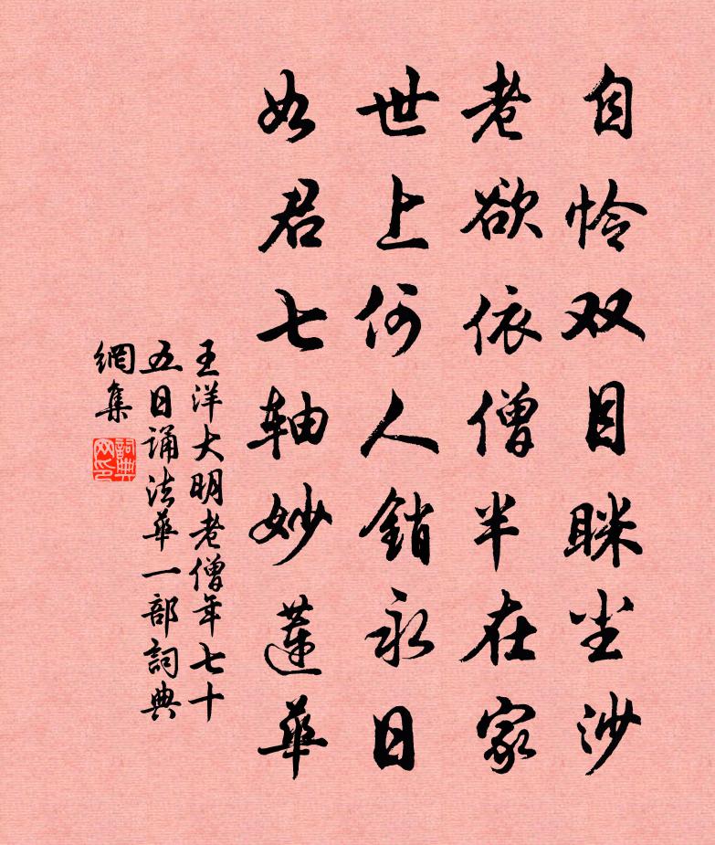 詩詞名句歷史字典書法欣賞書法字典國語詞典說文解字康熙字典古漢語字典標 題 作 者 詩 句 大明老僧年七十五日誦法華一部作者:王洋 朝代:宋代原文自憐雙目眯塵沙,老欲依僧半在家。世上何人銷永日,如君七軸妙蓮華。詩詞問答問:《大明老僧年七十五日誦法華一部》的作者是誰?答:王洋問:該詩寫於哪個朝代?答:宋代書法欣賞大明老僧年七十五日誦法華一部書法作品詩詞推薦廣陰亭詩陳士徽〔宋代〕唐翁靜者閉門飲水啜粥無知音,我能發爾一片冰清心。巨風吹天振海浪如屋,此翁林中眠正熟。中天渴烏吐火六合淳熙四年二月既望靜江守臣張某奉詔勸農於郊張栻〔宋代〕爾或自陷,予疚予恫。曷使予懷,寘於爾衷。梅釋行海〔宋代〕難將羯鼓喚春回,一種風光傍雪開。婀娜水仙難作弟,山礬猶自欠清才。上浙西張帥十首廖行之〔宋代〕曾上雲端款祝融,更臨濤海揖清風。於今又見張夫子,眼底紛紛一洗空。出自薊門行汪元量〔宋代〕出自薊門行,行行望天北。何處愁 * ,黑風走沙石。華裾者誰子,意氣萬人敵。金鞍鞁白馬,馬奮飛虎生翼。書謝湖州太守王成之給事送百花春糟蟹楊萬里〔宋代〕烏衣巷裡批敕手,整頓乾坤渠盡有。天風吹入水精宮,一夜陽和遍花柳。愛殺苕溪波底雲,揉雲釀出蒲萄春。更挼爛柯山四首。仙人棋劉迥〔唐代〕靈境偶一尋,洞天碧雲上。爛柯有遺蹟,羽客何由訪。日暮悵欲還,晴煙滿千嶂。黔之驢柳宗元〔唐代〕黔無驢,有好事者船載以入。至則無可用,放之山下。虎見之,龐然大物也,以為神,蔽林間窺之。稍出近之,慭詠史上光武陳普〔宋代〕金匱哀草正共哀,又將符命議靈台。太山千古黃泉路,底事鑾輿愛上來。寄道士楊休文岳珂〔宋代〕羽衣來自合山前,見說山中老散仙。出岫無心雲傍日,歸巢有意澗鳴泉。同襟汗漫尋常客,掉鞅文章四十年。我亦金陵雜興二百首蘇泂〔宋代〕青漆樓高製作奇,當時純不用琉璃。東昏幸自嗤梁武,不道東昏更可嗤。甲午歲朝寓桂林,記去年是日泊桐江,謁嚴子范成大〔宋代〕去年曉纜解江皋,也把屠蘇泛濁醪。一席飽風漁浦闊,千山封雪釣台高。將軍老矣鳴孤劍,客子歸哉詠大刀。早晚送惠雅法師歸玉泉賈島〔唐代〕只到瀟湘水,洞庭湖未游。飲泉看月別,下峽聽猿愁。講不停雷雨,吟當近海流。降霜歸楚夕,星冷玉泉秋。水龍吟(金陵作)楊冠卿〔宋代〕渡江天馬龍飛,翠華小駐興王地。石城鍾阜,雄依天塹,鼎安神器。鳷鵲樓高,建章宮闊,玉繩低墜。望郁蔥佳氣前歲上元與趙任卿寓臨安追逐甚今年同在建溪家鉉翁〔宋代〕山城燈火已蕭然,掃巷遊人更雪天。厭聽落梅翻永夜,喜看飛絮卜豐年。狂隨戲蝶裝羅髻,巧逐纖腰上舞筵。明日頌十玄談還源釋印肅〔宋代〕賓主穆時全是妄,相逢迎送分階巷。老胡不識警梁王,寶積摩尼歡喜藏。居厚弟和七十四吟再賦劉克莊〔宋代〕曾厭承明儤直勞,中宵麻卷攬衣操。退閒已久袖雙手,老懶渠能注二螯。雲水生涯今易足,人天供養昔非饕。三家湖州歌九十八首 其十汪元量〔宋代〕太湖風卷浪頭高,錦柁搖搖坐不牢。靠著篷窗垂兩目,船頭船尾爛弓刀。浪淘沙(祝壽)米芾〔宋代〕祝壽慶生申。德日維新。期頤眉壽壽長春。五福三靈祿永永,長壽仙人。遐算等莊椿。□德康寧。年年歡會笑欣欣記正月二十五日西湖之游十五首方回〔宋代〕石樑石柱石為碑,山拔泉飛石可移。兩玉堂仙一髠叟,自應名字萬年垂。名句推薦一簞食,一瓢飲,在陋巷,人不堪其憂,回也不改其樂。賢哉,回也!孔子弟子《論語·雍也篇》 白雲初下天山外,浮雲直向五原間。盧思道《從軍行》 一物不成,兩物見在。施耐庵《水滸傳·第十二回二》 太上,不知有之;其次,親而譽之;其次,畏之;其次,侮之。信不足焉,有不信焉。老子《老子·道經·第十七章》 白骨露於野,千里無雞鳴。曹操《蒿里行》 亂鴉三四點,愁坐話無憀。陳維崧《臨江仙·寒柳》 槐葉初勻日氣涼,蔥蔥鼠耳翠成雙。范成大《夏日田園雜興》 畫閣朱樓盡相望,紅桃綠柳垂檐向。王維《洛陽女兒行》 撥雪尋春,燒燈續晝。暗香院落梅開後。毛滂《踏莎行·元夕》 人有短,切莫揭。人有私,切莫說。李毓秀《弟子規·泛愛眾》