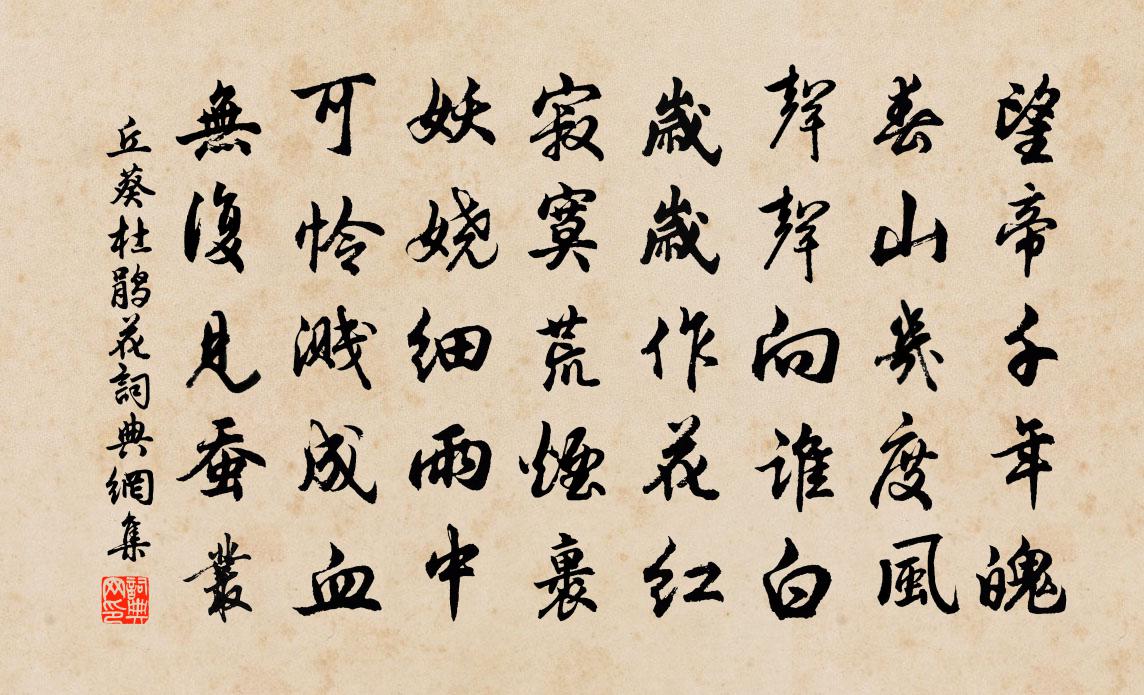 詩詞名句歷史字典書法欣賞書法字典國語詞典說文解字康熙字典古漢語字典標 題 作 者 詩 句 杜鵑花作者:丘葵 朝代:宋代杜鵑花原文望帝千年魄,春山幾度風。聲聲向誰白,歲歲作花紅。寂寞荒煙裹,妖嬈細雨中。可憐濺成血,無復見蠶叢。詩詞問答問:杜鵑花的作者是誰?答:丘葵問:杜鵑花寫於哪個朝代?答:宋代丘葵杜鵑花書法欣賞杜鵑花書法作品詩詞推薦朱字蘭亭方回〔宋代〕傾城國色著胭脂,紅字蘭亭又出奇。比換鵝書更姿媚,一杯卯酒醉西施。次韻劉元舉子規吳可〔宋代〕蜀魄悲鳴楚國春,試憑清些與招魂。柔腸欲斷雲橫嶺,幽夢初回月掛村。客舍花光隨野光,故園柳色負柴門。飽聞念奴嬌·書東流村壁辛棄疾〔宋代〕野棠花落,又匆匆、過了清明時節。剗地東風欺客夢,一枕雲屏寒怯。曲岸持觴,垂楊系馬,此地曾輕別。樓空人鷓鴣天(燈夕天谷席上作)葛長庚〔宋代〕翠幄張天見未曾。駝峰鵝掌出庖烹。醉酣渾是迷天地,但見尊前萬點星。人似玉,酒如餳。果盤簇飣不知名。東風句袁陟〔宋代〕瓊田收{左禾右巴}稏,玉溜注琅玕。先天易吟三十首方回〔宋代〕嗜慾損為益,榮華降是升。圓圖觀起處,生意伏陰凝。宿陳處士書齋朱慶餘〔唐代〕結茅當此地,下馬見高情。菰葉寒塘晚,杉陰白石明。向爐新茗色,隔雪遠鐘聲。閒得相逢少,吟多寐不成。沁園春佚名〔宋代〕長至陽生,律轉黃鍾,門左弧垂。記當年瑞世,夢傳玉燕,今朝誕節。香爇金猊。 * 明,北山堂邃,松檜蒼蒼朱買臣廟劉克莊〔宋代〕翁子平生最苦貧,晚將丹頸博朱輪。老儒五十無章綬,歸去何妨且負薪。五徵君松陰獨坐圖郭禮〔宋代〕盤石走新蘿,飛流下層巘。抱琴如有期,心與孤雲遠。鳥來天際微,林光澹將晚。受此鬆氣清,坐嘯不知返。踏雲行 次重陽韻馬鈺〔元代〕因遇風仙,頭分丫角。從今陡頓忘形殼。攀援愛念上心來,被予慧照先知覺。景滅澄明,道光遙邈。爐中露就靈靈萬松亭有感張耒〔宋代〕微雨濕青松,松間多好風。翠光濃欲滴,對舞千蛟龍。可惜青玉釵,道邊委蒿蓬。幽人不汝棄,應有綠毛翁。逢年與德粲同之溫陵謁大智禪師醫作四小詩送洪邁〔宋代〕石樑跨蠔山,永與方壺久。憑君持一杯,往酹濟川手。遙知相攜處,溟渤浸箕斗。作詩問大鈞,猶有斯人否。山行陸游〔宋代〕五尺桄榔杖,二寸栟櫚冠,往來山谷中,發白面渥丹。初非乳石力,所得懷抱寬。入寺不尋僧,自愛松風寒。松風連雪不已復作絕句詠之及六而止殆未免不愁凍趙蕃〔宋代〕不假丹青手,居成水墨圖。莫嗟玄尚白,靡嘆糞難污。陽春謠曹勛〔宋代〕臨東皇,萬物昌。君陶唐,宣重光。臣皋夔,熙元良。協三辰,撫萬方,物無夭札人無傷。人無傷,繄元良。錫以偈頌一百零二首釋紹曇〔宋代〕鴆鳥毛,蠱毒水。毒不傷人,何妨服餌。只有這些兒,含毒噴泉人,深入骨髓。三世諸佛畏之如兔見蒼鷹,歷代祖鷓鴣天 夜寒一作怎得心胸浩氣沖許衡〔元代〕土榻侵尋夜半風。眼羞無睡強朦朧。新詩暗琢拳攣里,往事都思展轉中。膚起粟,脊彎弓。須知玉汝是天衷。*間幽懷韓愈〔唐代〕幽懷不能寫,行此春江潯。適與佳節會,士女競光陰。凝妝耀洲渚,繁吹盪人心。間關林中鳥,亦知和為音。豈無汴京姚望之〔宋代〕蛇豕腥膻經幾年,故都宮闕尚巍然。八陵蒼莽知何地,九廟英靈如在天。重整六軍嚴宿衛,旋興百堵慰氓編。微臣名句推薦淚濕羅巾夢不成,夜深前殿按歌聲。白居易《後宮詞》 女蘿發馨香,菟絲斷人腸。李白《古意》 愛親者,不敢惡於人;敬親者,不敢慢於人。孔子及其弟子《孝經·天子》 學者非必為仕,而仕者必如學。荀子《荀子·大略》 一月不讀書,耳目失精爽。蕭掄謂《讀書有所見作》 敗軍之將,不可以言勇。司馬遷《史記·淮陰侯列傳》 忘卻成都來十載,因君未免思量。蘇軾《臨江仙·送王緘》 水國蒹葭夜有霜,月寒山色共蒼蒼。薛濤《送友人》 欲把相思說似誰,淺情人不知。晏幾道《長相思·長相思》 明日復明日,明日何其多。錢福《明日歌》
