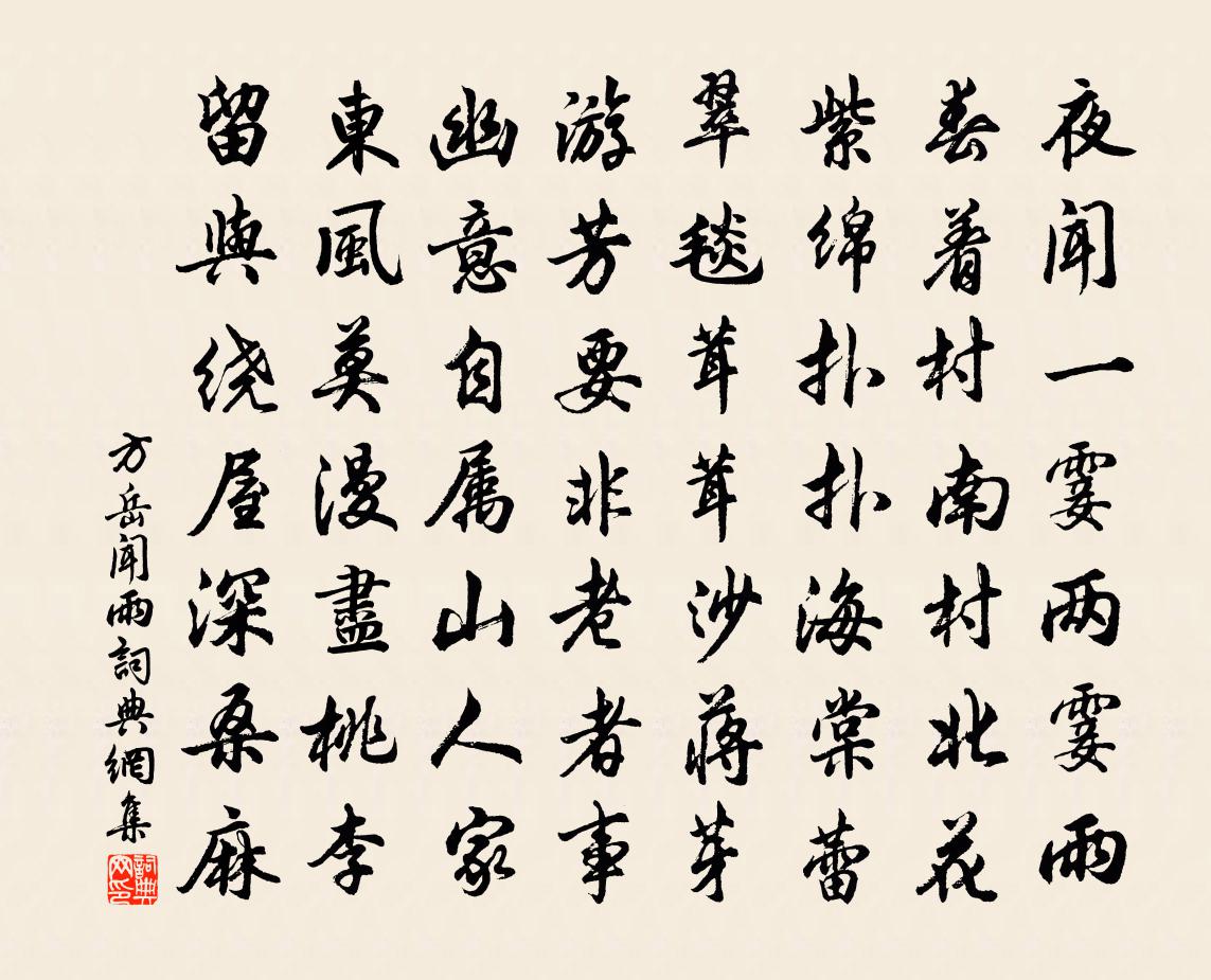 詩詞名句歷史字典書法欣賞書法字典國語詞典說文解字康熙字典古漢語字典標 題 作 者 詩 句 聞雨作者:方岳 朝代:宋代聞雨原文夜聞一霎兩霎雨,春著村南村北花。紫綿撲撲海棠蕾,翠毯茸茸沙蔣芽。游芳要非老者事,幽意自屬山人家。東風莫漫盡桃李,留與繞屋深桑麻。詩詞問答問:聞雨的作者是誰?答:方岳問:聞雨寫於哪個朝代?答:宋代方岳聞雨書法欣賞聞雨書法作品詩詞推薦書感陸游〔宋代〕茅檐住穩勝華屋,芋糝味甘如大烹。靜觀萬事付一默,掃空白髮非黃精。丈人祠西鶴傳信,小姑山前鼉報更。興闌馬上陸游〔宋代〕殘年流轉似萍根,馬上傷春易斷魂。烘暖花無經日蕊,漲深水過去年痕。迷行每問樵夫路,投宿時敲竹寺門。不信記夢關注〔宋代〕玄衣仙子從雙鬢,緩節長歌一解顏。滿引銅杯效鯨吸,低回紅袖作弓彎。舞留月殿春風冷,樂奏鈞天曉夢還。行聽自笑陸游〔宋代〕宦途昔似伏轅駒,退處今如縱壑魚。手自掃除松菊徑,身常枕藉老莊書。郊居本自依農圃,社飲何妨逐里閭。白髮題它山善政侯廟史彌寧〔宋代〕粲曉輕舠掠水飛,趁閒來款長官祠。雲巒著色四時畫,石瀨有聲千古詩。華黍幾沾膏澤潤,基棠長起後人思。渠伊題李杜蘇黃像少陵洪咨夔〔宋代〕風雲慘澹豺貙吼,日憂無飯仍無酒。秋來東屯熟 * ,舉家歡呼拍銅斗。老天欲釀兒欲炊,老夫怕醒兒怕飢。商量曾伯貢主簿輓詩二首楊萬里〔宋代〕我壯君初冠,相逢便定交。即今俱白首,赴告忽黃茅。人物王兼謝,詩聲島與郊。病來無氣力,不得奠蘭餚。偈頌一百四十一首釋師範〔宋代〕過去已過去,未來亦未來,即今名現在,現在安在哉。秋懷陳師道〔宋代〕稍稍昏煙集,冬冬一再更。短檠昏細字,高枕忘平生。來雁妨身健,新楊喚眼明。己須甘酒力,不用占時名。上古之什補亡訓傳十三章陵霜之華一章顧況〔唐代〕(陵霜之華,傷不實也。)陵霜之華,我心憂嗟。陰之勝矣,而陽不加。坱軋陶鈞,乃帝乃神,乃舒乃屯。烈烈嚴句杜衍〔宋代〕如何九老人猶少,應許東歸伴醉吟。窺開吟邵雍〔宋代〕物理窺開後,人情照破時。情中明事體,理外見天機。秋夜對客王邁〔宋代〕旋燒香鴨剔銀缸,風卷銀蟾上矮窗。詩癖苦無廳藥療,睡魔賴有建茶降。迴環蛙部疑成兩,接續蟬笙不計雙。好友薛王花燭行閻德隱〔唐代〕王子仙車下鳳台,紫纓金勒馭龍媒。□□□□□□出,環佩鏘鏘天上來。鳷鵲樓前雲半卷,鴛鴦殿上月裴回。玉盤送顧子敦赴河東三首黃庭堅〔宋代〕頭白書林二十年,印章今領晉山川。紫參可掘宜包貢,青鐵無多莫鑄錢。勸課農桑誠有道,折衝樽俎不臨邊。要知枕簟入林僻花瓜留客遲十韻葉茵〔宋代〕一會良不易,載言翻令愁。清風有時度,白日不可留。送劉山人歸洞庭李頻〔唐代〕君逐雲山去,人間又絕蹤。半湖乘早月,中路入疏鍾。秋盡草蟲急,夜深山雨重。平生心未已,豈得更相從。示公佐王安石〔宋代〕殘生傷性老枕書,年少東來復起予。各據槁梧同不寐,偶然聞雨落階除。隱靜遺枇杷梅堯臣〔宋代〕五月枇杷實,青青味尚酸。獼猴定撩亂,欲待熱應難。奉簡才元探梅有作兼懷舊遊張元乾〔宋代〕遮莫胡僧問劫灰,且陪東閣賦官梅。春梢慣識宮妝樣,花信偏隨驛使回。痛飲我曹身總健,浩歌誰怕老相催。疏枝名句推薦芝蘭生於深林,不以無人而不芳,君子修道立德,不謂窮困而改節。佚名《孔子家語·在厄》 清愁詩酒少,寒食雨風多。張鎡《寒食》 江山如有待,花柳自無私。杜甫《後游》 師也者,教之以事而喻諸德者也戴聖《禮記·文王世子》 野戰格鬥死,敗馬號鳴向天悲。李白《戰城南》 東風惆悵欲清明,公子橋邊沉醉。張泌《滿宮花·花正芳》 武公不但歌淇澳,賢女猶能唁衛侯。姜塘《摘星樓九日登臨》 臨淵羨魚,不如歸而結網。班固《漢書·志·禮樂志》 想牧之、千載尚神遊,空山冷。吳潛《滿江紅·齊山繡春台》 兩岸荔枝紅,萬家煙雨中。李師中《菩薩蠻·子規啼破城樓月》