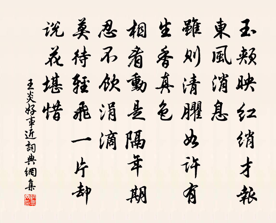 詩詞名句歷史字典書法欣賞書法字典國語詞典說文解字康熙字典古漢語字典標 題 作 者 詩 句 好事近作者:王炎 朝代:宋代好事近原文玉頰映紅綃,才報東風訊息。雖則清臞如許,有生香真色。相看動是隔年期,忍不飲涓滴。莫待輕飛一片,卻說花堪惜。詩詞問答問:好事近的作者是誰?答:王炎問:好事近寫於哪個朝代?答:宋代問:好事近是什麼體裁?答:詞王炎好事近書法欣賞好事近書法作品詩詞推薦和江鄰幾有菊無酒梅堯臣〔宋代〕種菊將飲酒,菊開酒無有。雖不負爾目,且已負爾口。昨日三兩人,淡坐飢腹吼。徒與喔其傍,誰能置升斗。當時送袁恭安赴江州節推樓鑰〔宋代〕袁氏四世凡五公,唐朝三相傳家風。君家幾代擅儒業,高曾藝苑俱稱雄。大父謙尊古君子,諸父名高表吾里。一門再和張栻〔宋代〕閉門謝客少過從,獨倚修篁傲碧空。忽喜千條發瓊蕊,紛如萬鶴出樊籠。與君前日徘徊久,得句懸知慘澹中。胸次獨居外寢偶薄寒侵體遂賦一律汪真〔宋代〕參差瓦上溥霜凝,釀得嚴寒漸漸增。布被多年渾似鐵,石床連夜恰如冰。杯邀竹葉為兄弟,帳伴梅花作友朋。酒醒臨江仙 贈仲經女子楚楚元好問〔金代〕阿楚新來都六歲,掌中一捻嬌春。詩中有筆畫難真。芝香雲作朵,魚細錦為鱗。舊說張門多靜女,更和靈照情親。致仕後寄白蓮然公晁說之〔宋代〕僧衣換卻朝衣盡,知悔知非恐不任。磬韻應憐持課罷,香銷當識坐禪深。芭蕉庭下三身正,蟋蟀床頭百慮侵。憶我永遇樂王吉昌〔元代〕智劍剛鋒,百魔剿退,膽驚心顫。猛虎生擒,蛟龍活捉,撒起威神變。雷轟鐵鼓,蛇飛金電,袞袞亂雲噴霰。徹江闕題釋文珦〔宋代〕大藥生自心田,神方蘊乎靈府。不論火候抽添,萬病自然良愈。次韻高子文村居李若水〔宋代〕幽人厭城市,結屋近松蘿。一笛秋風急,千岩晚照多。竹根鄰叟醉,牛背牧兒歌。笑殺青雲友,朝紳換短蓑。送方時父劉克莊〔宋代〕向來羞作繞枝飛,劉表區區不足依。索飯兒嗔郎罷出,畫眉人約藁砧歸。食魚底處容長鋏,射虎今方尚短衣。老縛次韻公辟將受代書蓬萊閣秦觀〔宋代〕城連湖岸水為關,旦暮樵風自往還。龜負寶林新佛地,龍蟠使宅老仙山。平生仕宦今何得,終日登臨獨未閒。歲滿夜宴即席作陸游〔宋代〕宣華輦路牧牛羊,摩訶龍池草茫茫。宮殿犁盡余繚牆,南風遠吹禾黍香。草間白骨橫秋霜,何由喚起釂一觴?痴人送許季韶粹桂林李洪〔宋代〕尺五天邊看頡頏,參辰出處九星霜。未令掌誥吟紅藥,屢喜嘉言貢皂囊。懷紱寓居欣會弁,監州歲晚客殊方。柱林郊壇聽雅樂佚名〔唐代〕泰壇恭祀事,彩仗下寒坰。展禮陳嘉樂,齋心動眾靈。韻長飄更遠,曲度靜宜聽。泛響何清越,隨風散杳冥。徹懸次韻葉秀實縣治環翠亭陳棣〔宋代〕畏途蹤跡幾間關,浩氣空存天地間。沈湎恨無千日醉,浪遊贏得半生閒。觀書尚喜眼如月,搜句誰憐肩聳山。三徑被劾方岳〔宋代〕鹿走山林儘自娛,寧知性命系庖廚。一杯羹足為奇貨,野弋山漁何處無。次韻田園居方岳〔宋代〕帶郭林塘盡可居,秫田雖少不如歸。荒煙五畝竹中半,明月一間山四圍。草臥夕陽牛犢健,菊留秋色蟹螯肥。園翁酬裴侍御對雨感時見贈李白〔唐代〕雨色秋來寒,風嚴清江爽。孤高繡衣人,瀟灑青霞賞。平生多感激,忠義非外獎。禍連積怨生,事及徂川往。楚邦義通里寓居即事徐夤〔唐代〕家住寒梅翠嶺東,長安時節詠途窮。牡丹窠小春余雨,楊柳絲疏夏足風。愁鬢已還年紀白,衰容寧藉酒杯紅。長卿雜歌謠辭白鼉鳴張籍〔唐代〕天欲雨,有東風,南溪白鼉鳴窟中。六月人家井無水,夜聞白鼉人盡起。名句推薦扶桑已在渺茫中,家在扶桑東更東。韋莊《送日本國僧敬龍歸》 潯陽江頭夜送客,楓葉荻花秋瑟瑟。白居易《琵琶行 / 琵琶引》 晚日金陵岸草平,落霞明,水無情歐陽炯《江城子·晚日金陵岸草平》 侵夜鸞開鏡,迎冬雉獻裘。李商隱《陳後宮》 細雨夢回雞塞遠,小樓吹徹玉笙寒。李璟《攤破浣溪沙·菡萏香銷翠葉殘》 孤雲將野鶴,豈向人間住。劉長卿《送方外上人 / 送上人》 九華山路雲遮寺,清弋江村柳拂橋。杜牧《宣州送裴坦判官往舒州時牧欲赴官歸京》 三思而後行。孔子弟子《論語·公冶長篇》 人生亦有命,安能行嘆復坐愁?鮑照《擬行路難·其四》 與君別,相思一夜梅花發房舜卿《有所思》