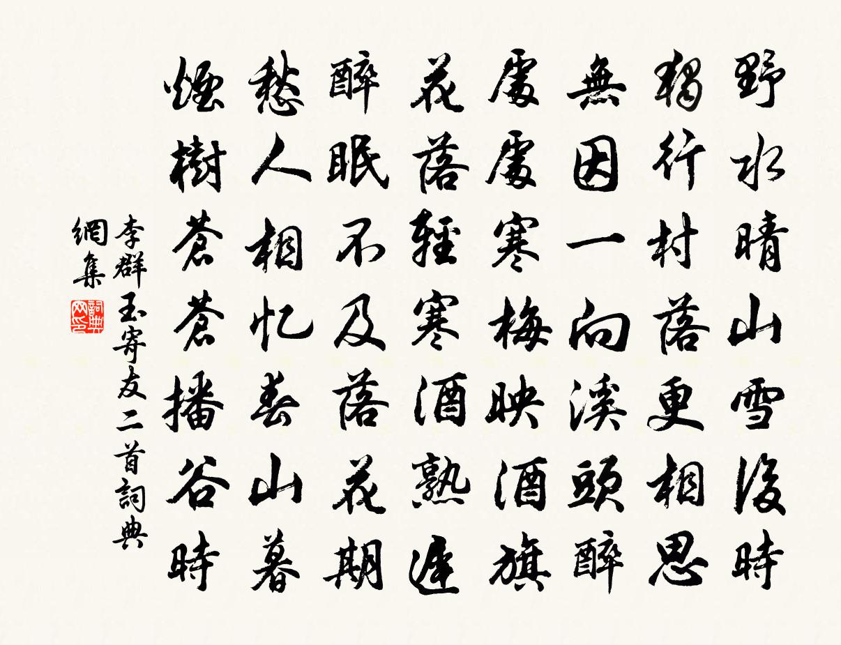 詩詞名句歷史字典書法欣賞書法字典國語詞典說文解字康熙字典古漢語字典標 題 作 者 詩 句 寄友二首作者:李群玉 朝代:唐代寄友二首原文野水晴山雪後時,獨行村落更相思。無因一向溪頭醉,處處寒梅映酒旗。花落輕寒酒熟遲,醉眠不及落花期。愁人相憶春山暮,煙樹蒼蒼播谷時。詩詞問答問:寄友二首的作者是誰?答:李群玉問:寄友二首寫於哪個朝代?答:唐代問:寄友二首是什麼體裁?答:七絕李群玉寄友二首書法欣賞寄友二首書法作品注釋全唐詩:卷570-25詩詞推薦與朝陽山人張朝夜集湖亭,賦得各言其志皎然〔唐代〕洞庭孤月在,秋色望無邊。零露積衰草,寒螿鳴古田。茫茫區中想,寂寂塵外緣。從此悟浮世,胡為傷暮年。已亥雜詩 263龔自珍〔清代〕道蘊談鋒不落詮,耳根何福受清圓。自知語乏煙霞氣,枉負才名三十年。跋姜春坊梅山詩集二首楊萬里〔宋代〕承華寮寀集鴛鸞,不減應徐讌魏園。中有釣璜清渭叟,向來授鉞少陵壇。錦心繡口搴花草,雪碗冰甌瀉肺肝。身到南京種山藥法蔡挺〔宋代〕潤還御水冰霜結,蔭近堯雲雨露骨偏。自裹自題還自愧,揠苗應笑宋人然。庵中獨居感懷陸游〔宋代〕無錢溪女亦留魚,有雨東家每借驢。藜粥數匙晨壓藥,松肪一碗夜觀書。黃紬被暖閒無厭,白布衫長樂有餘。南陌妙山孫元濟建閣江瀕以館往來士大夫余取韓文曾豐〔宋代〕未慣觀空空可觀,更參向上一機關。大通與我合為一,眼自有餘空自慳。燕去十年復來巢艾性夫〔宋代〕雙燕窺簾認主人,十年不見忽過門。烏衣故國今何在,蒼籙遺民老倖存。芹沼不香驚綠帽,草堂無語對黃昏。從今懷舊用昔人蜀道詩韻陸游〔宋代〕曩自白帝城,一馬獨入蜀,晝行多水湄,夜宿必山麓。時聞木客嘯,常憂射工毒,蜿蜓蛇兩頭,踸踔夔一足;豈惟雝佚名〔先秦〕有來雝雝,至止肅肅。相維辟公,天子穆穆。於薦廣牡,相予肆祀。假哉皇考!綏予孝子。宣哲維人,文武維後。題禹廟齊唐〔宋代〕削斷龍門劍力間,遺祠終古鑑湖邊。昆墟到海曾窮地,石穴藏書不記年。春色門牆花滴雨,曉光台殿水浮煙。塗山送人李建勛〔唐代〕相見未逾月,堪悲遠別離。非君誰顧我,萬里又南之。雨逼清明日,花陰杜宇時。愁看掛帆處,鷗鳥共遲遲。點絳唇(再和送錢公永)蘇軾〔宋代〕莫唱陽關,風流公子方終宴。秦山禹甸。縹緲真奇觀。北望平原,落日山銜半。孤帆遠。我歌君亂。一送西飛雁。秋夜望月姚崇〔唐代〕明月有餘鑒,羈人殊未安。桂含秋樹晚,波入夜池寒。灼灼雲枝淨,光光草露團。所思迷所在,長望獨長嘆。題廬山太平興國宮寇準〔宋代〕飛泉噴薄走虹蜺,遠岫崢嶸植玉圭。若有桃花鎮開落,遊人應認武陵溪。挽黃安人劉克莊〔宋代〕嫁作儒家婦,韶顏已守孀。夫窮於仲子,兒勝似元方。陶母將迎養,龐妻忽坐亡。吾衰不能誄,短些謾淒涼。送王炎弼赴山陽守以兵衛森畫戟宴寢凝清香為曾協〔宋代〕詩成嘯諾余,謀出壺觴暇。卻整進賢冠,麒麟要圖畫。挽尤延之尚書陳傅良〔宋代〕壯歲從游兩鬢霜,重來函太各堪傷。那知卒業今無及,極悔論心昨未嘗。相約歸期須次第,獨存病骨更淒涼。他年頌古一百則釋正覺〔宋代〕鳥之行空,魚之在水。江湖相忘,雲天得志。擬心一絲,對面千里。知恩報恩,人間几几。蠟梅四絕楊冠卿〔宋代〕枝上編鐘萬顆垂,凌寒傲視雪霜姿。從今疏影暗香句,不數西湖處士詩。詠圓通崇勝院崔鶠〔宋代〕崢嶸廬山高,下看三江水。青天瀑布飛,白日看煙起。人家閒崦口,石道喬松底。似窺仙剎麗,翠影亂螭尾。亭亭名句推薦不痴不聾,不作家翁。司馬光《資治通鑑·唐紀四十》 羈心積秋晨,晨積展游眺。謝靈運《七里瀨》 士雖有學,而行為本焉。墨子《墨子·02章 修身》 屈指數春來,彈指驚春去。高觀國《卜運算元·泛西湖坐間寅齋同賦》 青箬笠,綠蓑衣,斜風細雨不須歸。張志和《漁歌子·西塞山前白鷺飛》 百囀千聲隨意移,山花紅紫樹高低。歐陽修《畫眉鳥》 江上幾人在,天涯孤棹還。溫庭筠《送人東遊》 客自長安來,還歸長安去。李白《金鄉送韋八之西京》 窮巷多怪,曲學多辯。愚者之笑,智者哀焉;狂夫之樂,賢者喪焉。商鞅《商君書·更法》 開軒面場圃,把酒話桑麻。孟浩然《過故人莊》