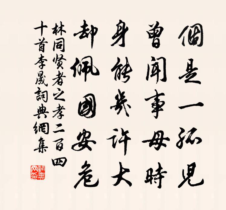 詩詞名句歷史字典書法欣賞書法字典國語詞典說文解字康熙字典古漢語字典標 題 作 者 詩 句 賢者之孝二百四十首李晟作者:林同 朝代:宋代賢者之孝二百四十首李晟原文個是一孤兒,曾聞事母時。身能幾許大,卻佩國安危。詩詞問答問:賢者之孝二百四十首李晟的作者是誰?答:林同問:賢者之孝二百四十首李晟寫於哪個朝代?答:宋代林同賢者之孝二百四十首李晟書法欣賞賢者之孝二百四十首李晟書法作品詩詞推薦桐下林洪〔宋代〕無名花草上閒坡,病葉成堆客罕過。注易欠工知學少,種桐收效得陰多。破籬自補憂邊事,斷簡重穿憶世科。近日人月圓(元宵)史浩〔宋代〕夕陽影里東風軟,驕馬趁香車。看花妝鏡,藏春繡幕,百萬人家。夜闌歸去,星繁絳蠟,珠翠鮮華。笙歌不散,疏古樂府釋斯植〔宋代〕早作西州行,暮作西州宿。楊柳忽風生,年年芳草綠。同吳王送杜秀芝赴舉入京李白〔唐代〕秀才何翩翩,王許回也賢。暫別廬江守,將游京兆天。秋山宜落日,秀水出寒煙。欲折一枝桂,還來雁沼前。積雪未晴正旦朝賀大慶殿口號八章程公許〔宋代〕擾擾勞生祗自吧,依依鄉夢五更寒。臨流釣石應無恙,歸逐鄰翁整釣竿。與王巡檢釋印肅〔宋代〕佛法從來付宰臣,今朝已遇大心人。透明幻住超生滅,鑒物無私佑聖庭。翠蛟亭新父〔宋代〕斷崖卷銀濤,拍岸雪相濺。去住本無心,曾向岷峨見。金剛隨機無盡頌莊嚴淨土分第十釋印肅〔宋代〕山雲昨夜雨,檐頭滴滴舉。寒山拾得知,雙雙為伴侶。浣溪沙(早春)趙長卿〔宋代〕不憤江梅噴暗香。春前臘後正淒涼。霜風雪月忍思量。斜倚幽林如有恨,玉鱗飛後轉堪傷。時人那解惜孤芳。贈樊夫人詩裴航〔唐代〕向為胡越猶懷想,況遇天仙隔錦屏。儻若玉京朝會去,願隨鸞鶴入青冥。送張無夢歸天台錢易〔宋代〕暫謁明光拂斗槎,杖藜歸去赤城霞。琳宮重啟仙人室,金闕新辭太帝家。祇自運心奔白日,何須擲米作丹砂。雲章遇道者貫休〔唐代〕鶴骨松筋風貌殊,不言名姓絕榮枯。尋常藜杖九衢里,莫是商山一皓無。身帶煙霞游汗漫,藥兼神鬼在葫蘆。只應滿庭芳(次范倅憶洛陽梅)石孝友〔宋代〕蘭畹霜濃,柳溪冰咽,春光先到江梅。瘦枝疏萼,特地破寒開。鉤引天涯舊恨,雙眉鎖、九曲迴腸。空銷黯,故園詩鮑照〔南北朝〕豎儒守一經。未足識行藏。春日湖上武衍〔宋代〕船里歌聲去復還,遊人樂在酒杯間。爭如策蹇長堤上,細看南山與北山。疥王安石〔宋代〕浮陽燥欲出,陰濕與之戰。燥濕相留連,蟲出乃投間。搔膚血至股,解衣燎爐炭。方其愜心時,更自無可患。呼醫和劉實之寄生日黃榦〔宋代〕朝來布謾與兒曹布語,欲看布群峰插天宇。攜筇直上君子堂,出門復向東屯去。東屯田舍翁,邂逅成賓主。謂予始暑行憩新都驛陸游〔宋代〕細細黃花落古槐,江皋不雨轉輕雷。長空鳥破蒼煙去,落日人從綠野來。散策意行尋水石,脫巾高臥避氛埃。羈游五美吟·明妃曹雪芹〔清代〕絕艷驚人出漢宮,紅顏命薄古今同。君王縱使輕顏色,予 * 何畀畫工?西垣致齋日因成一章呈二相公寇準〔宋代〕攝事修雩祀,齋居近紫庭。千門夏雨歇,高樹夕陽生。更散掖垣靜,風來鐘漏清。岩廊慚舊德,書殿愧群英。白髮名句推薦不如隨分尊前醉,莫負東籬菊蕊黃。李清照《鷓鴣天·寒日蕭蕭上瑣窗》 天時人事日相催,冬至陽生春又來。杜甫《小至》 我善養吾浩然之氣。孟子《孟子·公孫丑章句上·第二節》 終日望君君不至,舉頭聞鵲喜。馮延巳《謁金門·風乍起》 換我心,為你心,始知相憶深。顧夐《訴衷情·永夜拋人何處去》 夫眾喣漂山,聚蚊成雷班固《漢書·傳·景十三王傳》 對飲食,勿揀擇。食適可,勿過則。李毓秀《弟子規·謹》 借得山東煙水寨,來買鳳城春色施耐庵《念奴嬌·天南地北》 人刑者非人也,罰人者非罰也。來俊臣《羅織經·刑罰卷第十一》 遠水不救近火。韓非及後人《韓非子·說林上》