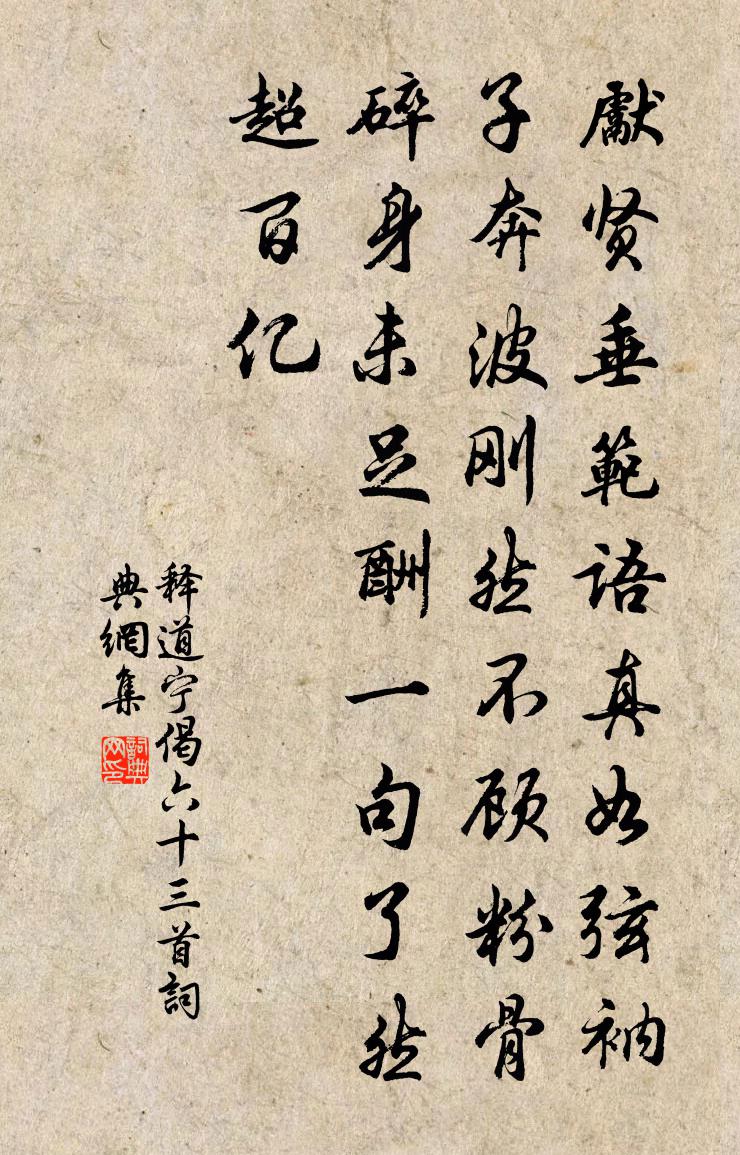 詩詞名句歷史字典書法欣賞書法字典國語詞典說文解字康熙字典古漢語字典標 題 作 者 詩 句 偈六十三首作者:釋道寧 朝代:宋代偈六十三首原文先賢垂範,語真如弦。衲子奔波,剛然不顧。粉骨碎身未足酬,一句瞭然超百億。詩詞問答問:偈六十三首的作者是誰?答:釋道寧問:偈六十三首寫於哪個朝代?答:宋代釋道寧偈六十三首書法欣賞偈六十三首書法作品詩詞推薦九月二日發舟快閣下趙蕃〔宋代〕開船風打頭,舉棹水分流。到處皆成客,今年未識秋。意哀吟蟋蟀,聲苦亂颼颼。拊枕仍推枕,誰知夢覺優。古塞上曲七首貫休〔唐代〕幽并兒百萬,百戰未曾輸。蕃界已深入,將軍仍遠圖。月明風拔帳,磧暗鬼騎狐。但有東歸日,甘從筋力枯。中軍菩薩蠻(宜興作)蘇庠〔宋代〕北風振野雲平屋。寒溪淅淅流冰縠。落日送歸鴻。夕嵐千萬重。荒坡垂斗柄。直北鄉山近。何必苦言歸。石亭春滿寄蕭冰崖練橘里黃立軒吳浚〔宋代〕破夢金川月,回頭玉樹風。煙村涵暮紫,霜葉顫晴紅。謀國諸侯在,忘年古道同。乾坤雲一片,吾意未終窮。禪人並化主寫真求贊釋正覺〔宋代〕其離而入,其微而出。一彈指響樓閣開,身現門門千百億。花下小酌陸游〔宋代〕雲開太華插遙空,我是山中採藥翁。何日胡塵掃除盡,敷溪道上 * 。秋夜耿湋〔唐代〕高秋夜分後,遠客雁來時。寂寞重門掩,無人問所思。送別趙尉方岳〔宋代〕細草輕煙畫出愁,一船明月大刀頭。苔痕欲暗藍田記,楓葉正寒江渚樓。無酒可澆鸚鵡賦,有山頻典鷫鸘裘。功名題淨梵院清虛堂俞烈〔宋代〕天清蠶麥余,綠結桃李實。老僧詩銜袖,過我語言質。懷山意先行,如病夢芝術。去□才一舍,鞭策不終日。堂筵句黃景說〔宋代〕一身盡著雪衣裳。和劉明仲都曹見別三首蘇頌〔宋代〕久污朝寵老非宜,祿厚躬間不爾虧。優詔還令使真室,特恩仍免覲京師。力疲都是垂頭馬,志適何殊曳尾龜。年事醉落魄趙善括〔宋代〕橫梯畫閣。月明江淨煙光薄。碧山迴繞欄乾角。一縷行雲,忽向杯中落。櫻歌柳舞俱柔弱。羅衣不耐江風惡。憑誰偈傾一百六十九首釋智朋〔宋代〕收則大地全收,展則大千俱覆。黃面瞿曇,隱身無路。卜運算元辛棄疾〔宋代〕修竹翠羅寒,遲日江山暮。幽逕無人獨自芳,此恨知無數。只共梅花語。懶逐遊絲去。著意尋春不肯香,香在無尋故侍讀黃公輓詩權安節〔宋代〕西南人物早推先,入踐華途譽望全。朱邸談經忠貫日,黃扉批敕力回天。敬王素學真無負,憂國沉疴竟莫痊。初政再和陳傅良〔宋代〕休將枘鑿問方員,且引壺觴對聖賢。鴻雁不寶滄海凍,梅花相伴笑年年。詩曹丕〔魏晉〕絹綃白如雪。輕華比蟬翼。邵州陪王郎中宴楊巨源〔唐代〕西塞無塵多玉筵,貔貅鴛鷺儼相連。紅茵照水開樽俎,翠幕當雲發管弦。歌態曉臨團扇靜,舞容春映薄衫妍。魯儒送徐尉移簿巴陵並簡鄧器先汪兼善王炎〔宋代〕兩鳧不到蓬萊峰,翩翩墮在葭葦叢。口談世事懶揖客,劫回老眼瞻飛鴻。子真何事亦來此,培塿乃千丈松。揮毫古代簡國清老惠梅曹勛〔宋代〕梅從雲塢冷搖春,玉雪浮香不著塵。愚谷斬新肯拈出,一時全露法王身。名句推薦沅有芷兮澧有蘭,思公子兮未敢言。屈原《九歌·湘夫人》 戛戛秋蟬響似箏,聽蟬閒傍柳邊行。徐璣《秋行》 於事事物物上求至善,卻是義外也。王陽明《傳習錄·卷上·徐愛錄》 天蒼蒼,野茫茫。風吹草低見牛羊。佚名《敕勒歌》 人生貴得適意爾。劉義慶《世說新語·識鑒》 甚愛必大費;多藏必厚亡。故知足不辱,知止不殆,可以長久。老子《老子·德經·第四十四章》 今日漢宮人,明朝胡地妾。李白《王昭君二首》 如何亡國恨,盡在大江東!屈大均《秣陵》 誰憐旅愁荏苒。謾長門夜悄,錦箏彈怨。張炎《解連環·孤雁》 高節志凌雲,不敢當滕六。環山樵《薛寶釵·雪竹》