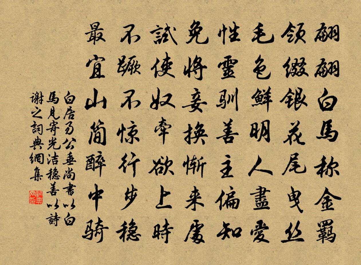 翩翩白馬稱金羈,領綴銀花尾曳絲。毛色鮮明人盡愛,性靈馴善主偏知。